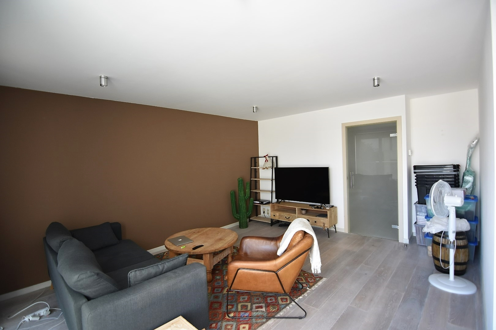Een mat glazen deur brengt je naar de aangename woonkamer met toegang tot het terras via een schuifraam.