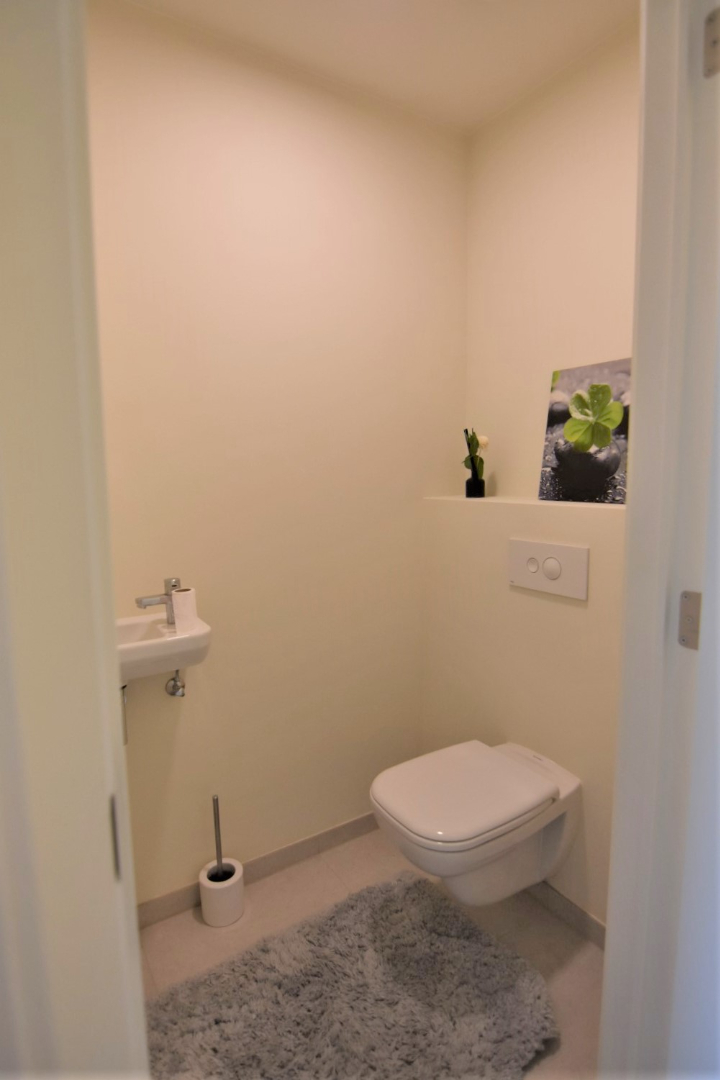 Inkomhal - berging/wasplaats - gastentoilet - lichtrijke woonkamer met open ingerichte keuken - terras (ZW) - slaapkamer - aanpalende badkamer met ligbad, toilet en wastafel.