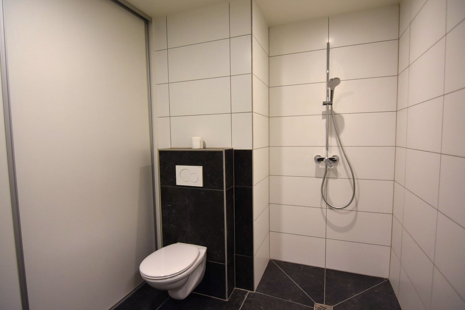 Aan de achterzijde van het appartement bevindt zich de ruime badkamer met toilet - douche - wasmeubel - aansluiting wasmachine/berging, praktisch voorzien in een kast met schuifwand) en de tweede slaapkamer met klein terras.