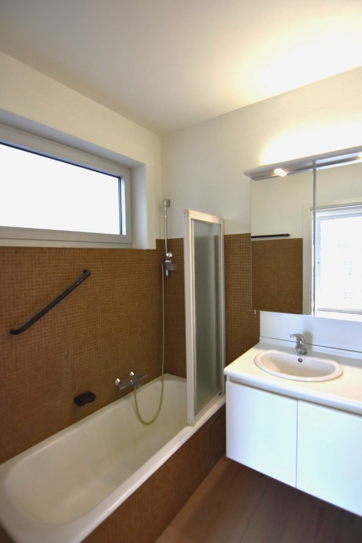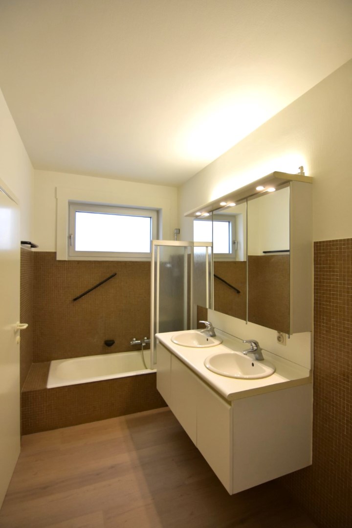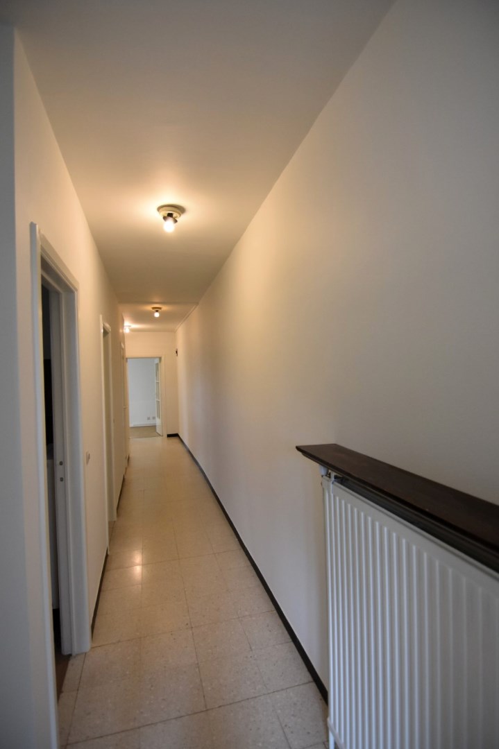 De hal biedt eveneens toegang tot het toilet, drie slaapkamers (1 grote, 1 middelgrote, 1 kleine slaapkamer) alsook een badkamer met ligbad en dubbele wastafel (directe toegang tot de grootste slaapkamer).