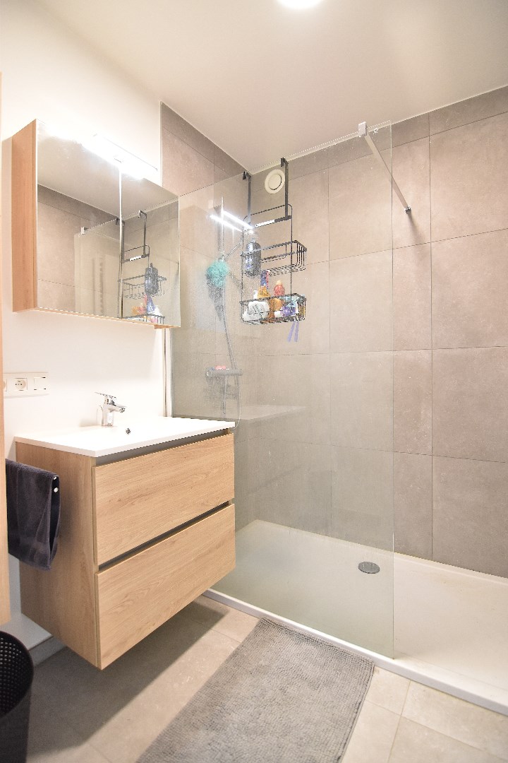 Indeling : inkomhal met vestiaire en gastentoilet, lichtrijke leefruimte met ingerichte open keuken, berging met aansluiting voor wasmachine en droogkast, nachthal, twee slaapkamers, badkamer met inloopdouche en lavabomeubel.