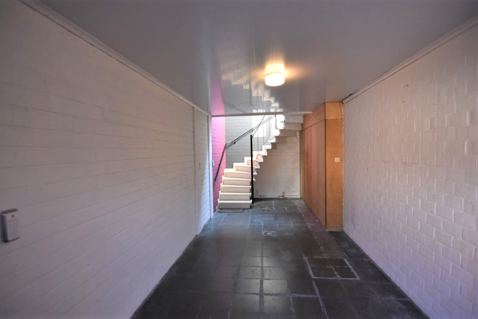 diepe garage met trap naar eerste verdieping - voordeur (verwerkt in garagepoort)