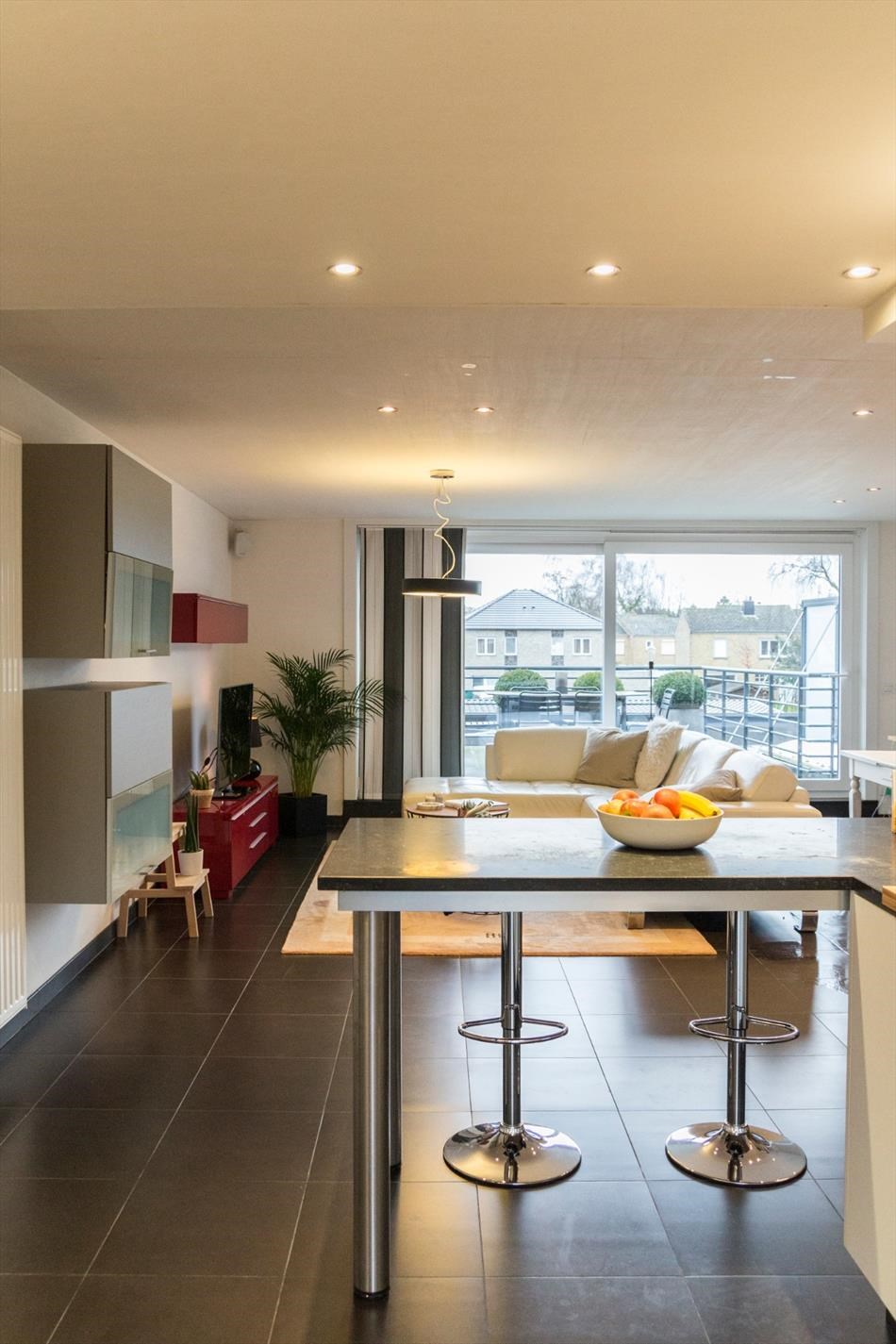 Indeling: inkomhal, berging/wasplaats, toilet, ruime lichtrijke woonkamer (mogelijkheid bureau), open en zeer moderne keuken met ontbijthoek. Klein terras vooraan, en achteraan een zeer gezellig en ruim terras (25 m²!) met panoramisch zicht! Op de bovenste verdieping bevinden zich de 2 slaapkamers (met oa. ingebouwde kast) en de badkamer. Extra gedeelde berging in inkomhal. Geen lift.