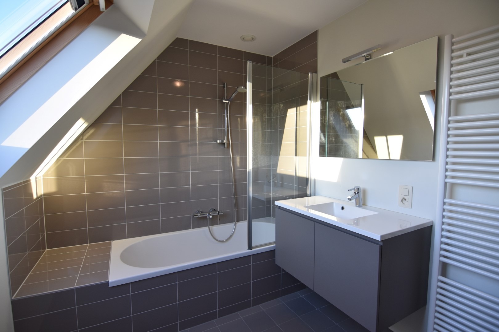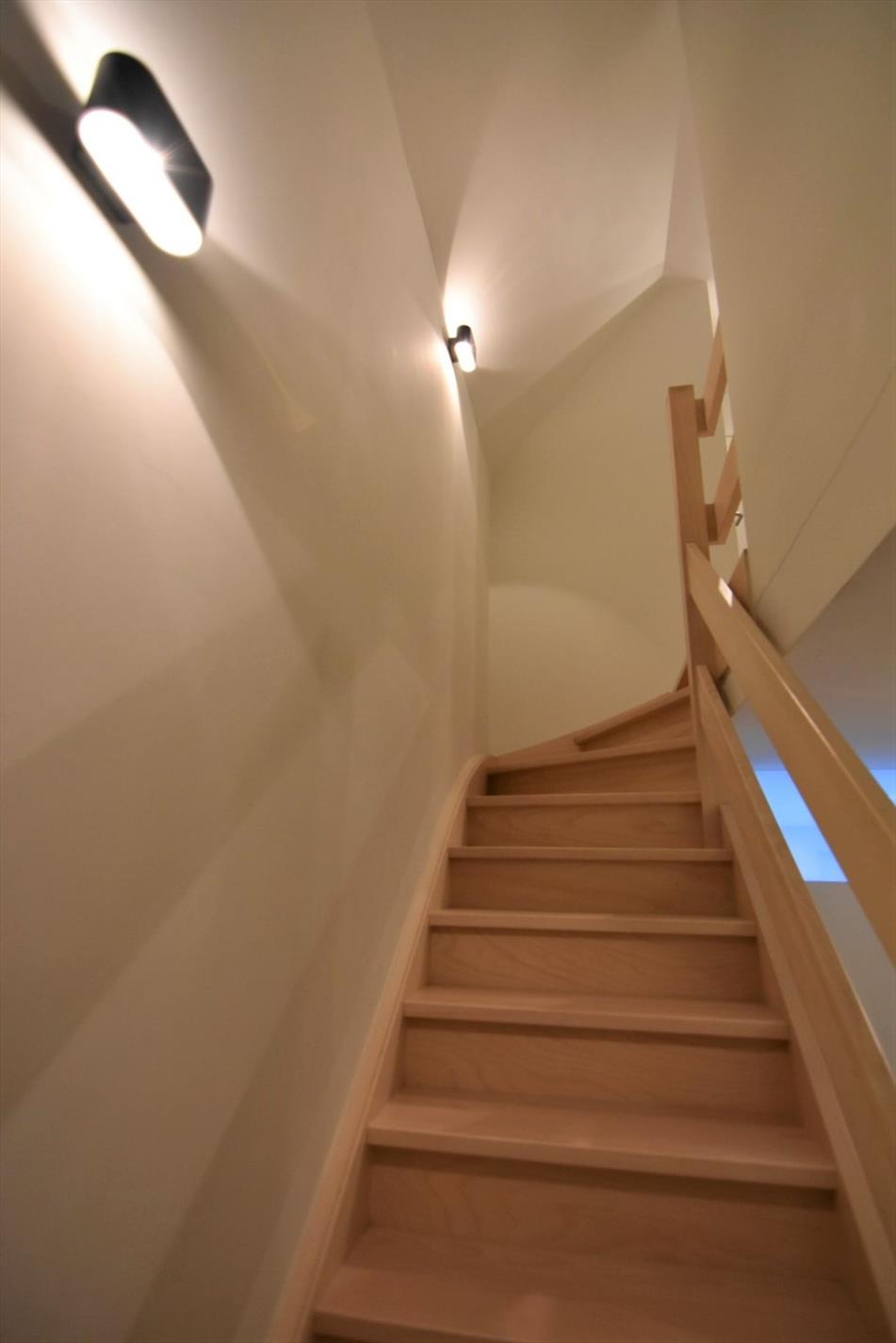 Op de verdieping is er een kleine hal met toegang tot het tweede toilet - badkamer - grote slaapkamer en middelgrote slaapkamer. Verder is er een praktische opbergzolder (via valluik)