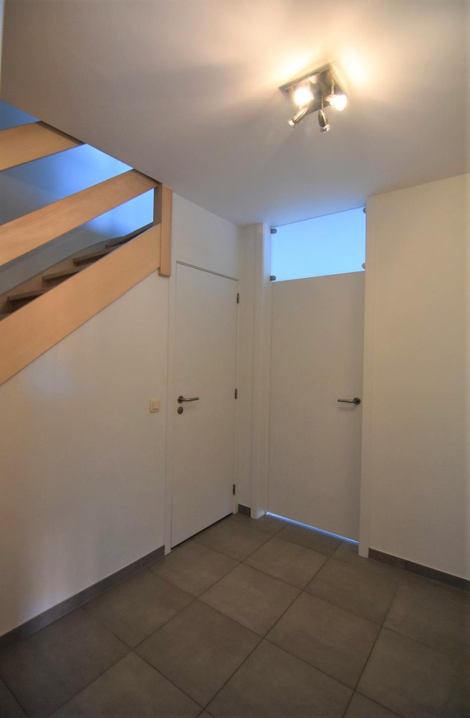 inkomhal met trap - gastentoilet - polyvalente kamer (bureau, speelkamer) - woonkamer met oost gericht terras - open ingerichte keuken - praktische berging/wasplaats.
