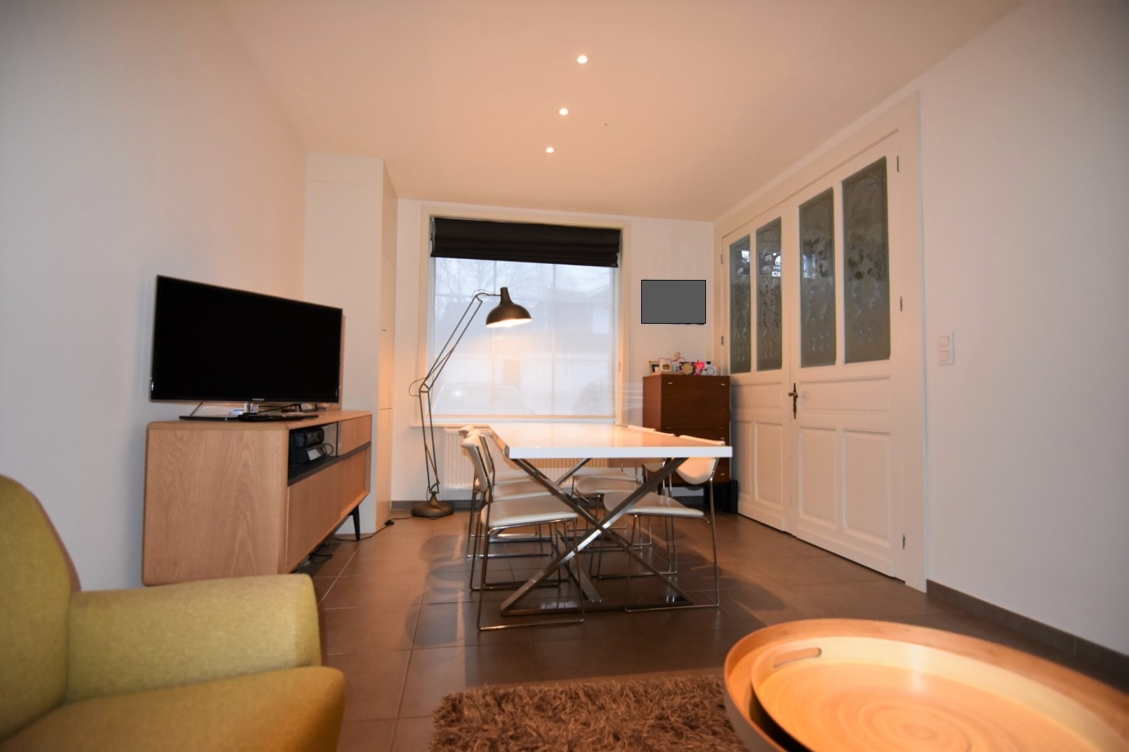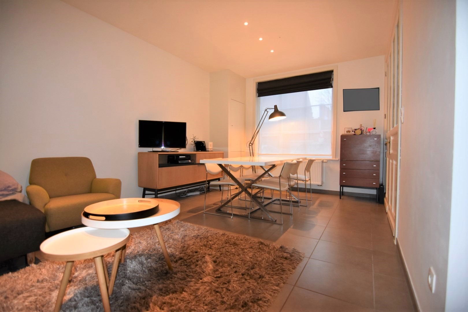 Gelijkvloers: inkomhal - toilet - ruime en lichtrijke leefruimte - keuken met eetplaats en zicht op de stadstuin
