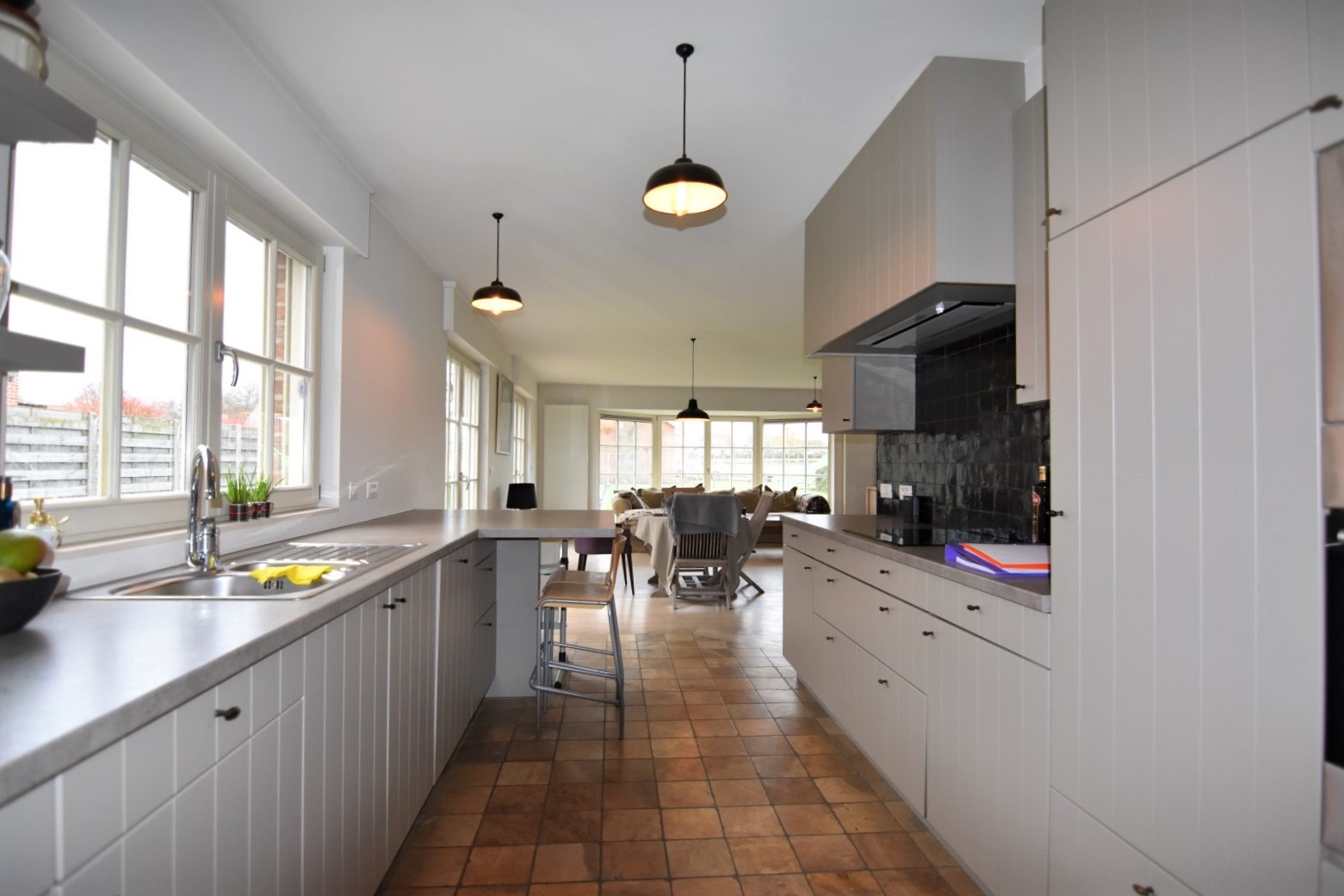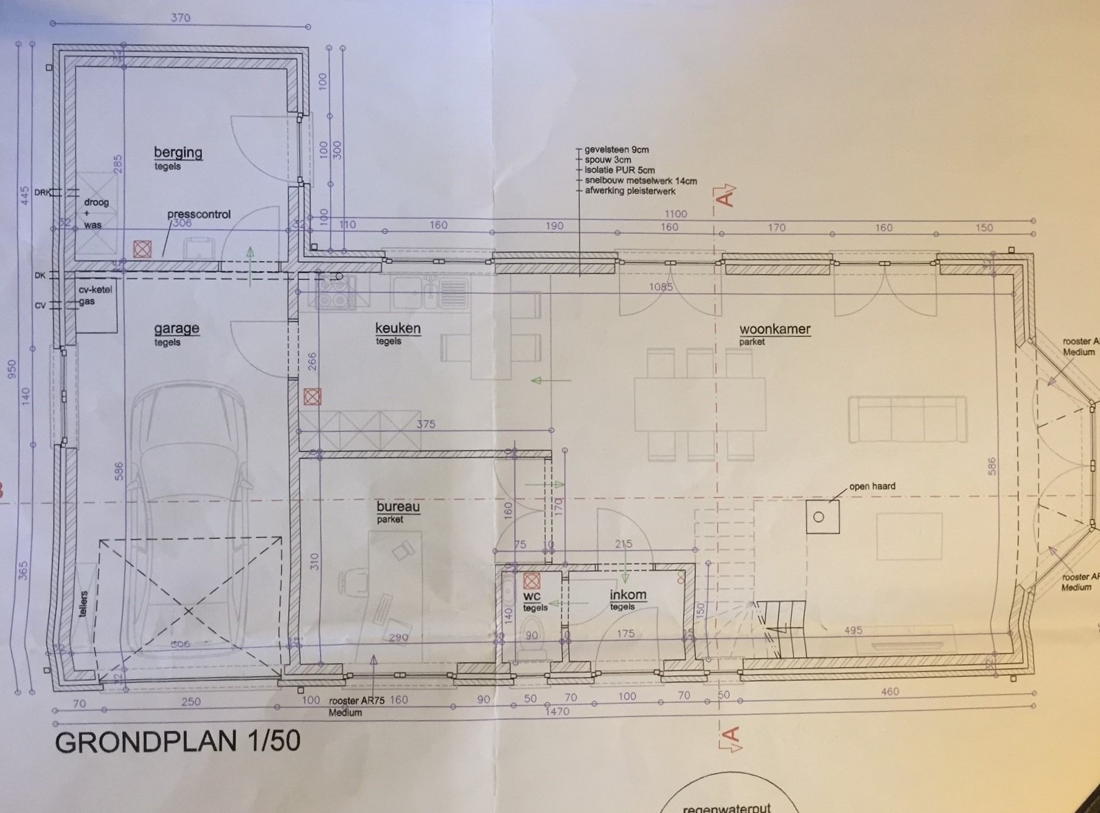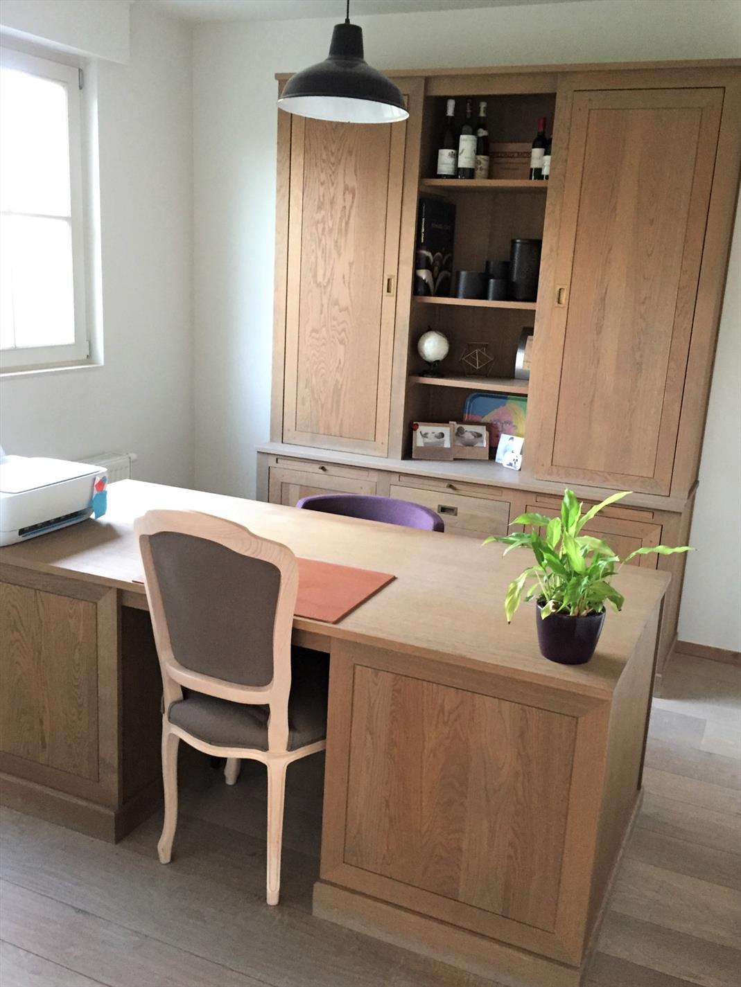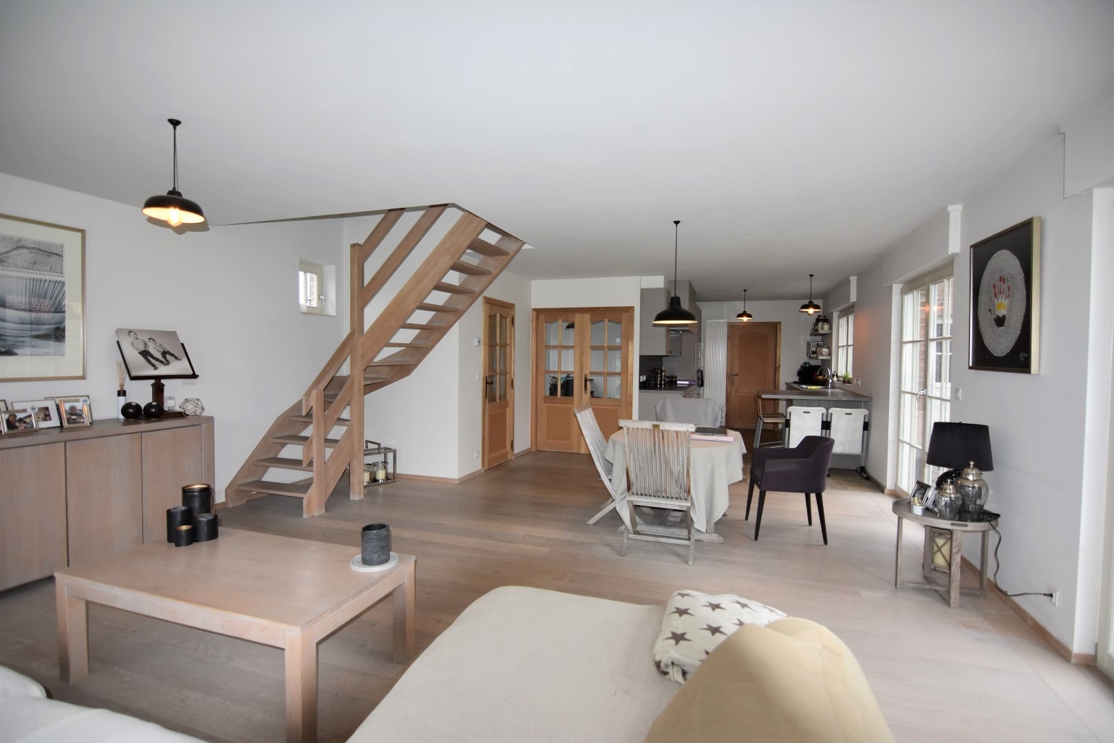 Indeling gelijkvloers: inkomhal - toilet - bureau/polyvalente kamer - lichtrijke open leefruimte met gezellige zithoek en eetplaats - volledig ingerichte keuken met ontbijtplaats - ruime en praktische berging met wasplaats - garage (extra parkeerplaats aan de woning).