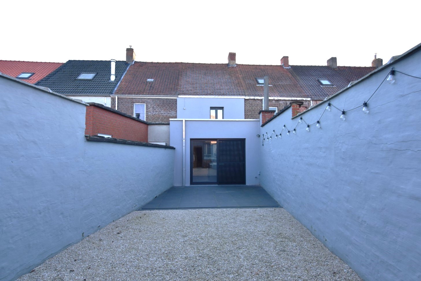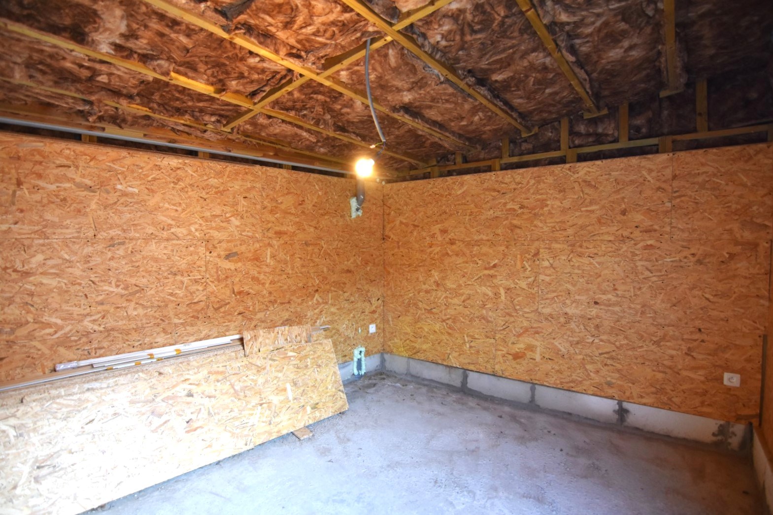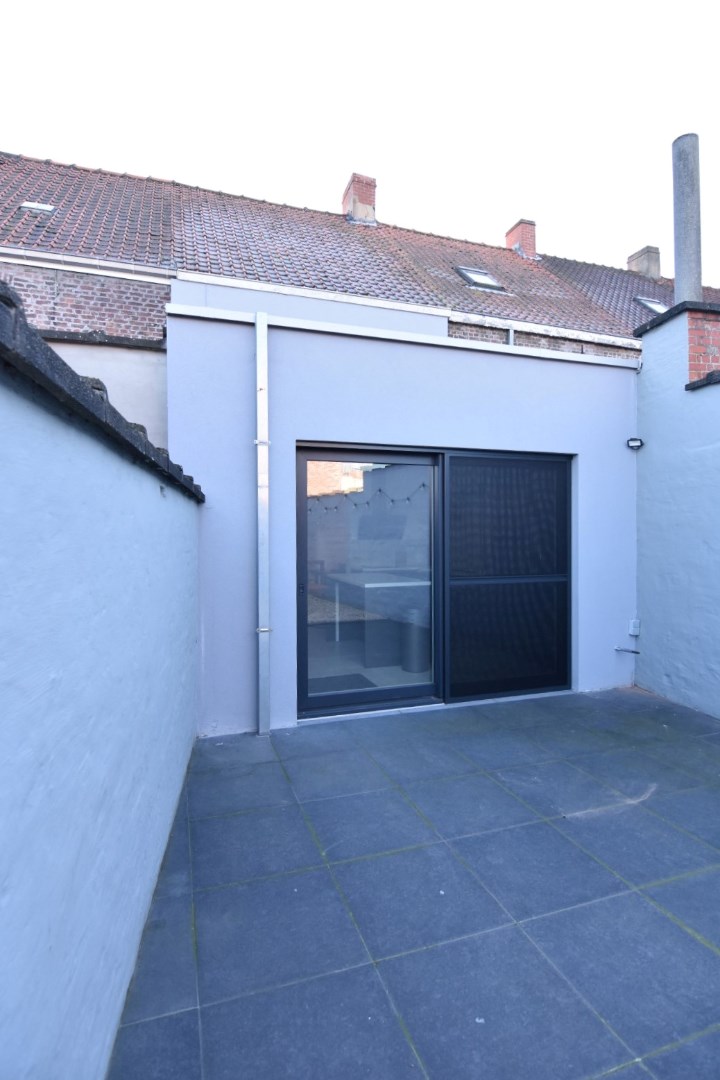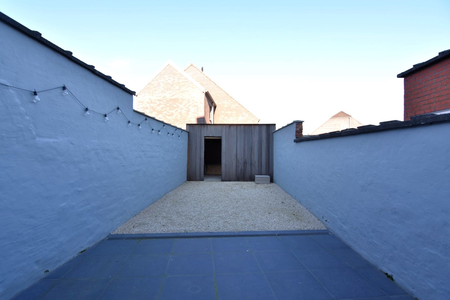 Het schuifraam biedt toegang tot een onderhoudsvriendelijk stadstuintje met praktische tuinberging (plafond wordt nog verder afgewerkt).
