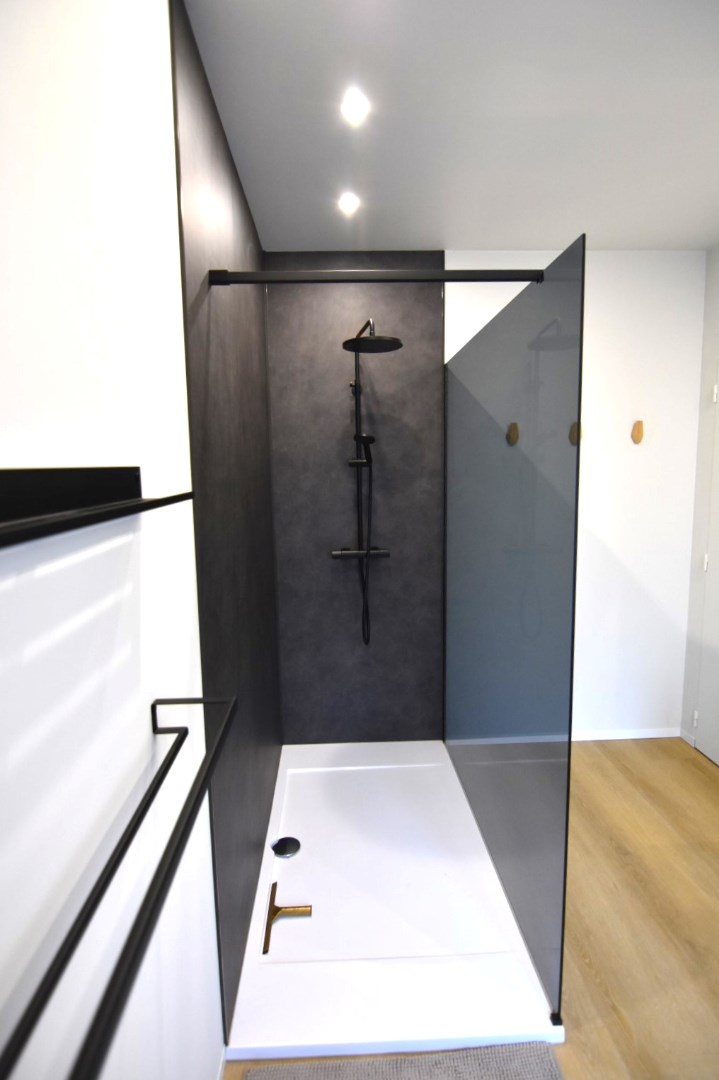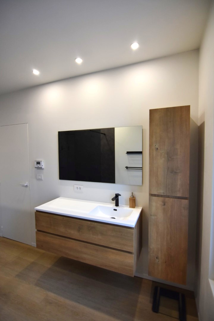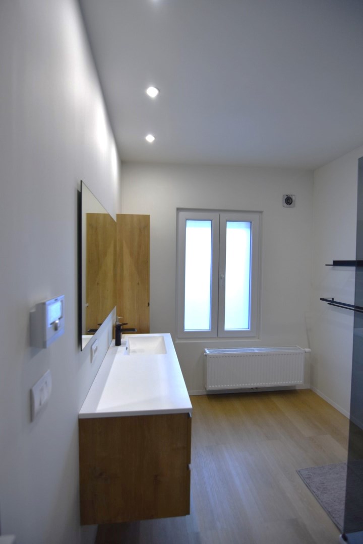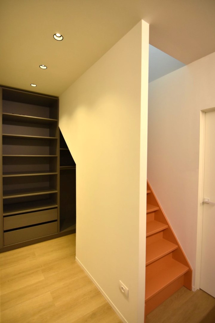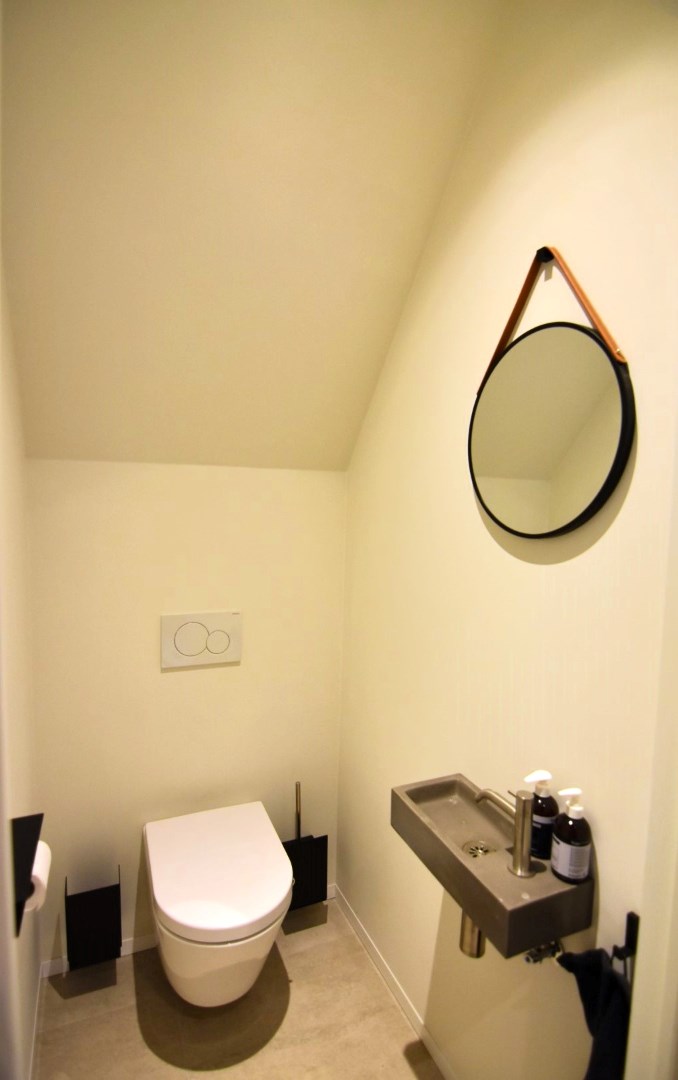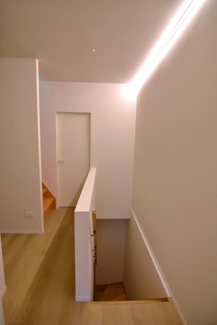 De verdieping omvat een nachthal met toegang tot de technische berging/praktische wasplaats met toilet, badkamer met strakke inloopdouche, dressing (onder trap dakverdieping) en één slaapkamer.