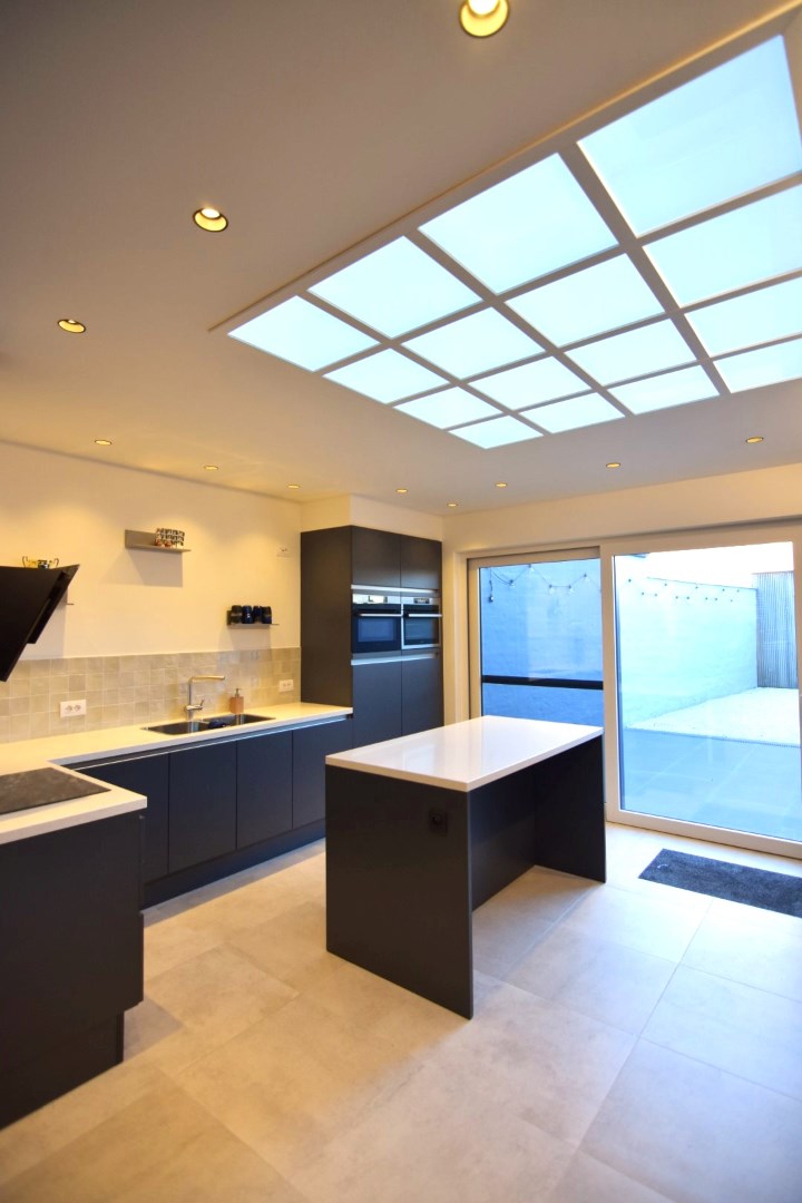 Inkomhal met gastentoilet - lichtrijke woonkamer met aansluitend moderne open ingerichte keuken met heel veel kastruimte.
