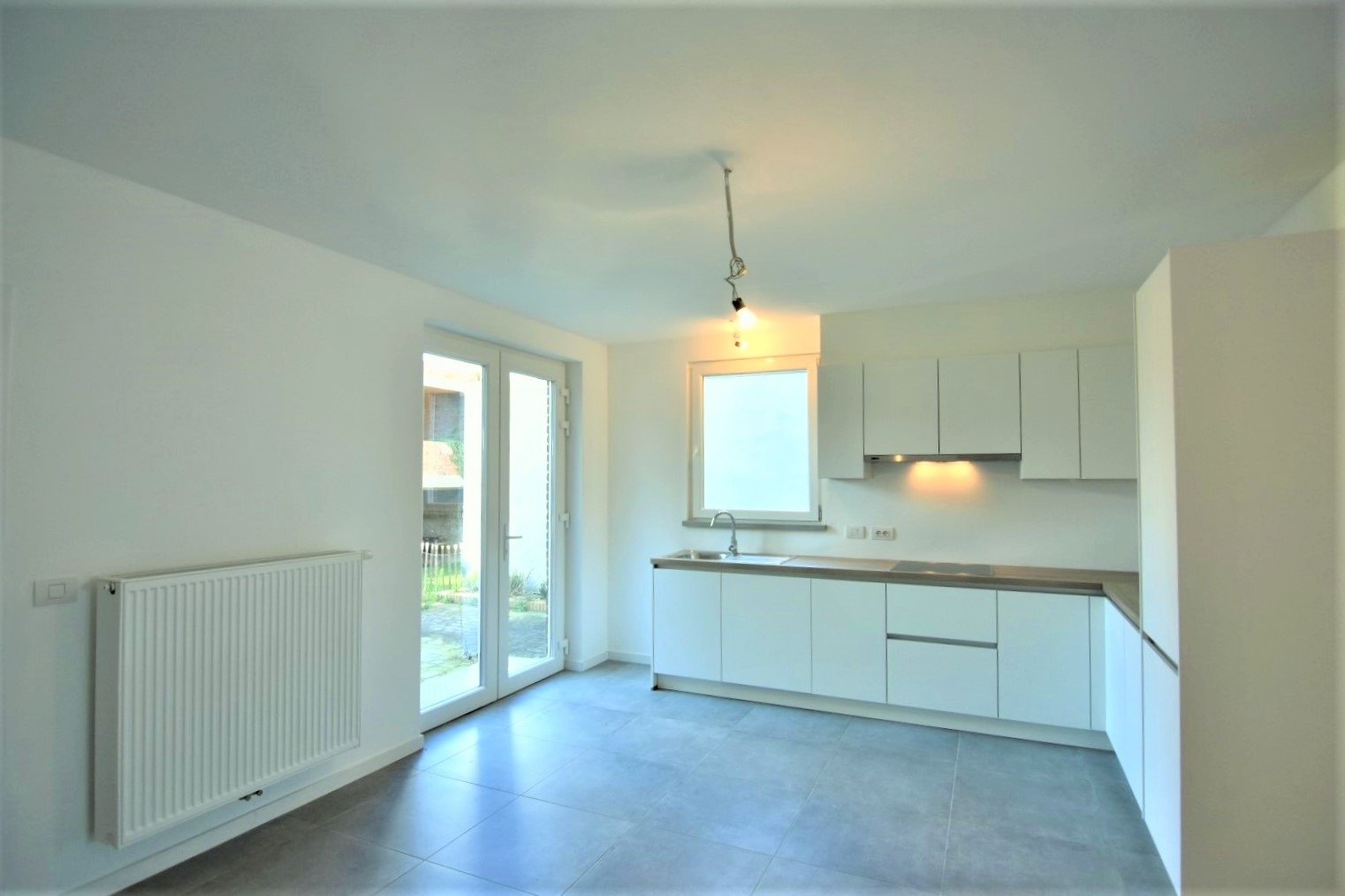 Er is een moderne keuken met voldoende ruimte voor een eettafel en zicht op de achterliggende tuin.