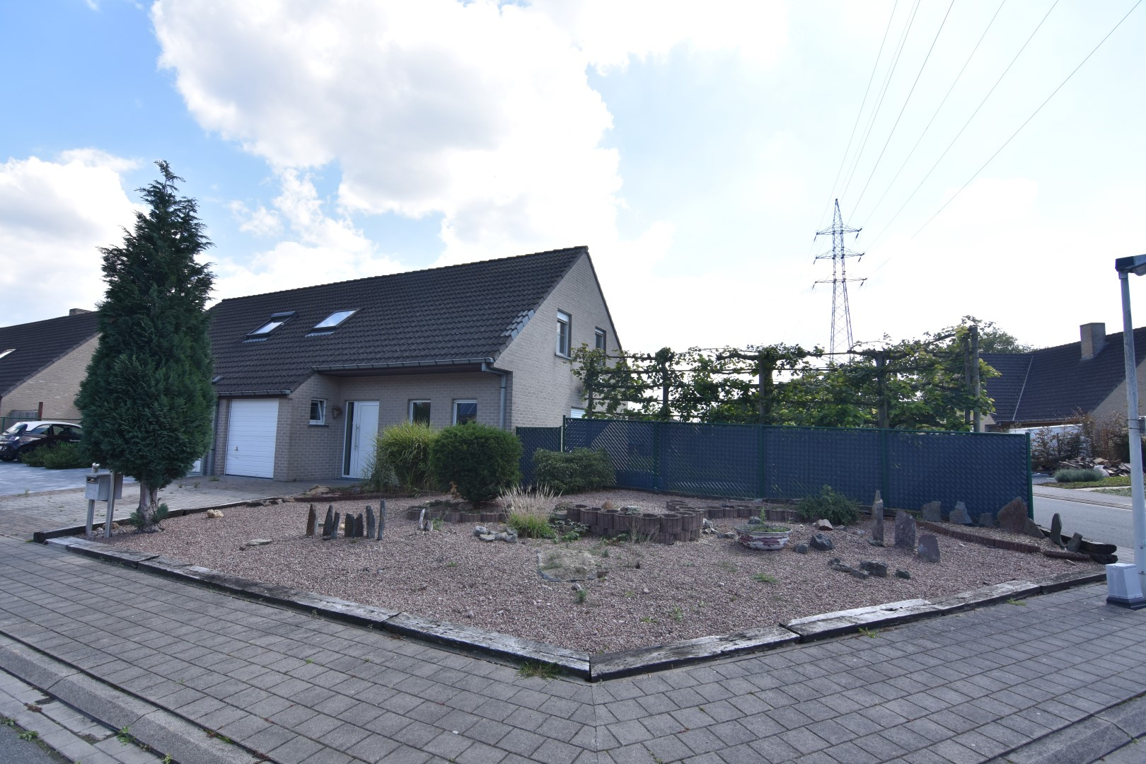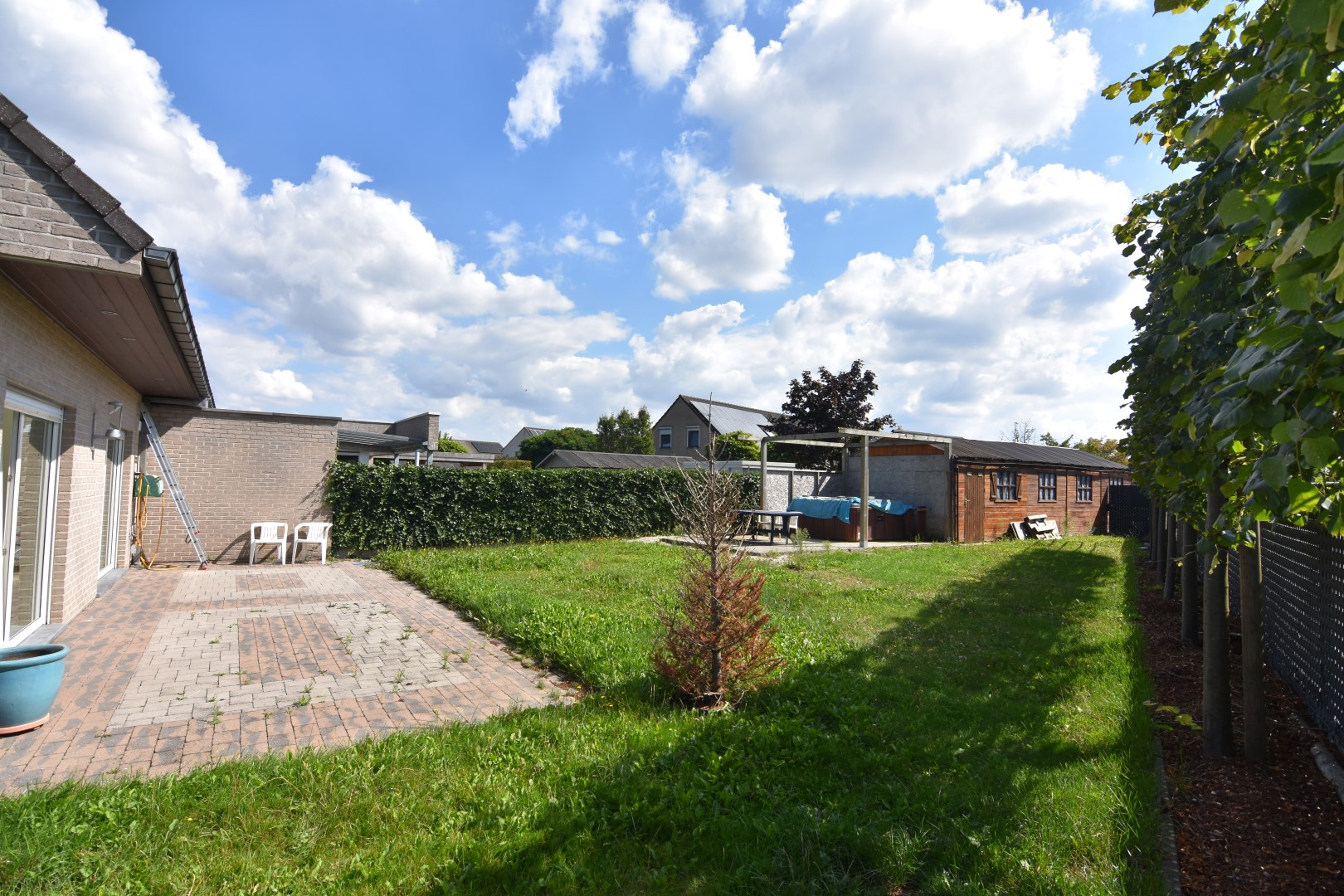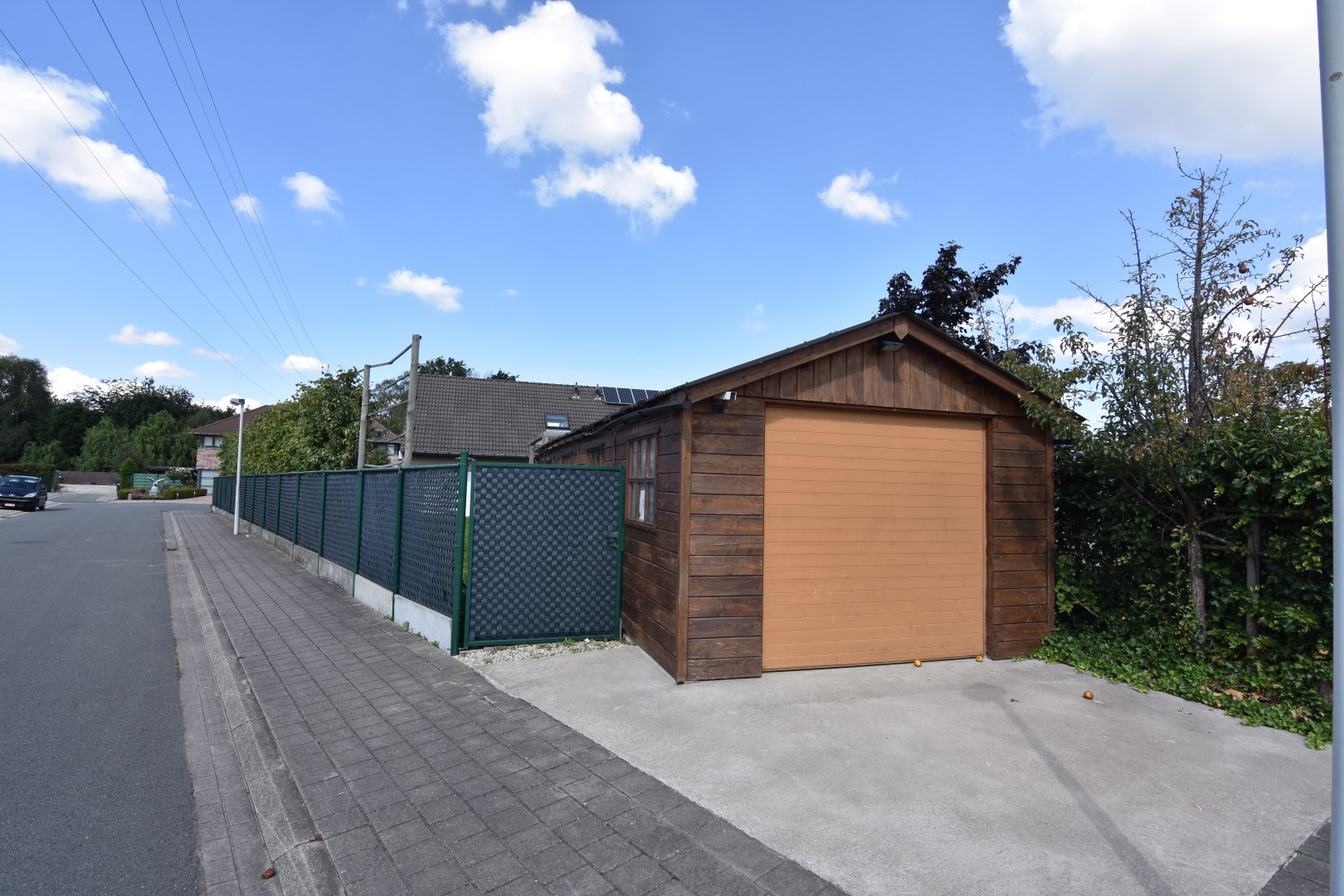 Voortuin met oprit - zijtuin - terras achteraan met grote achtertuin en toegang tot de 2de garagebox/berging.