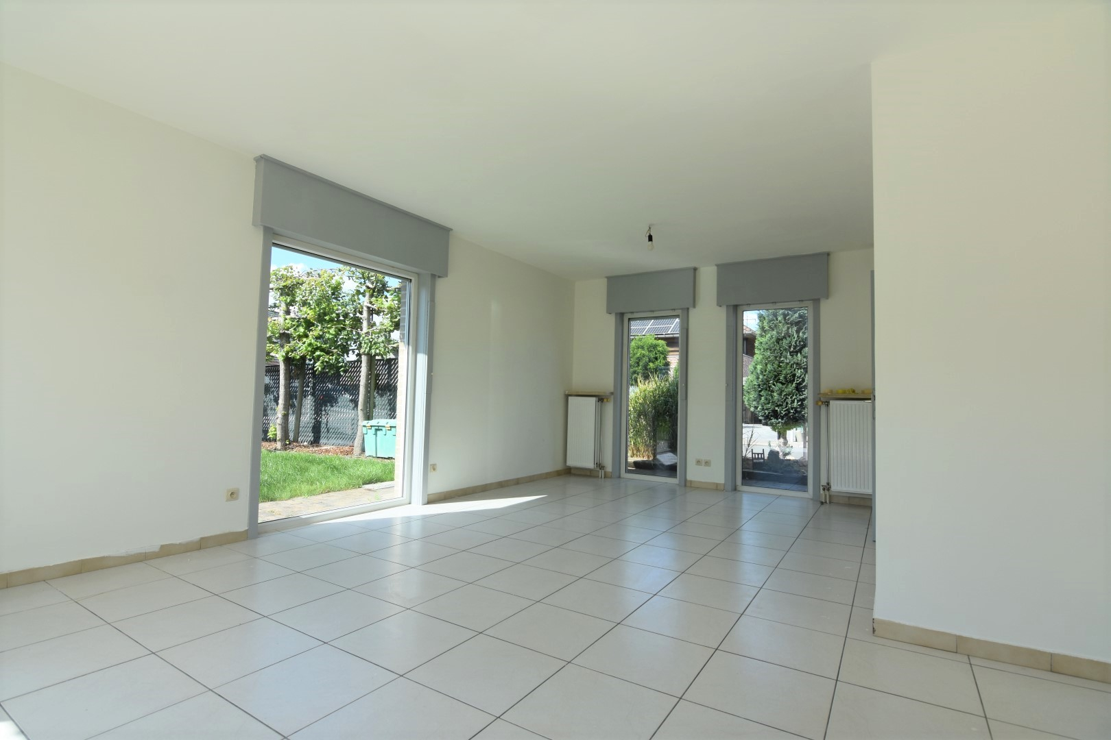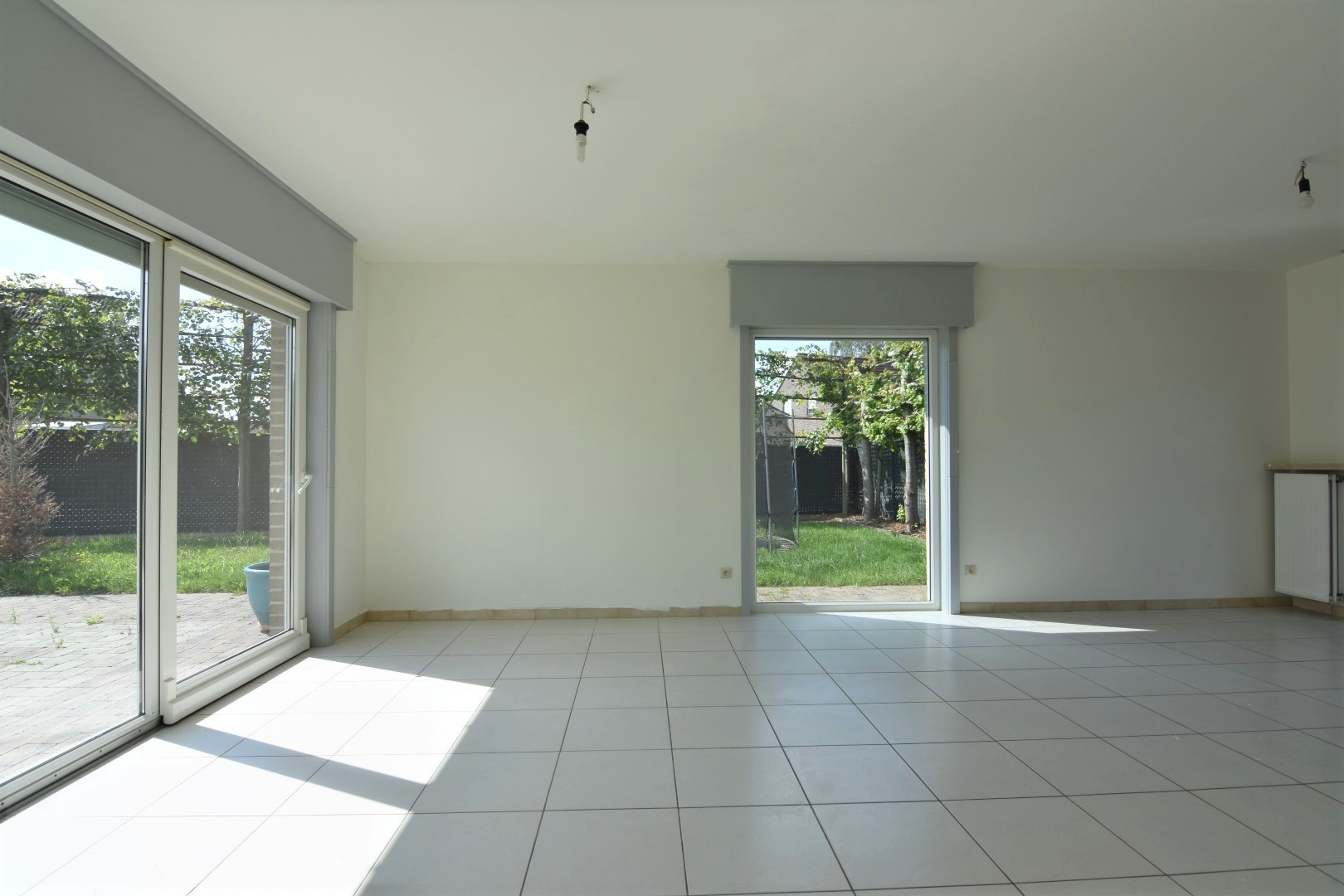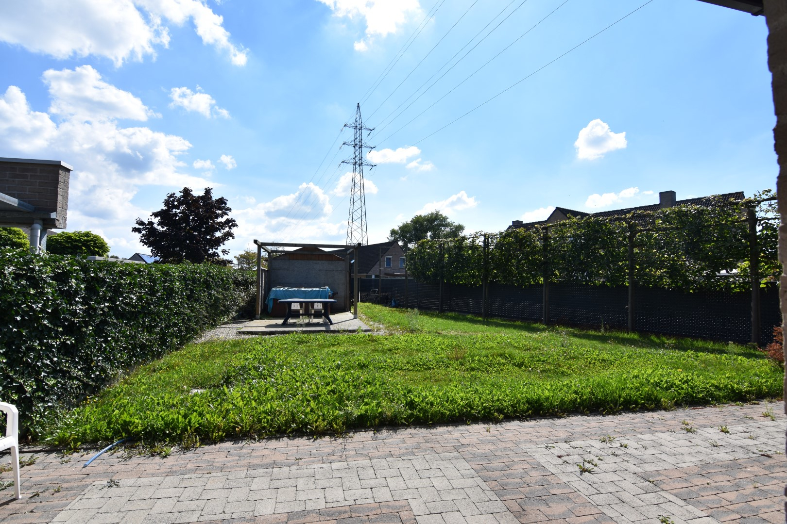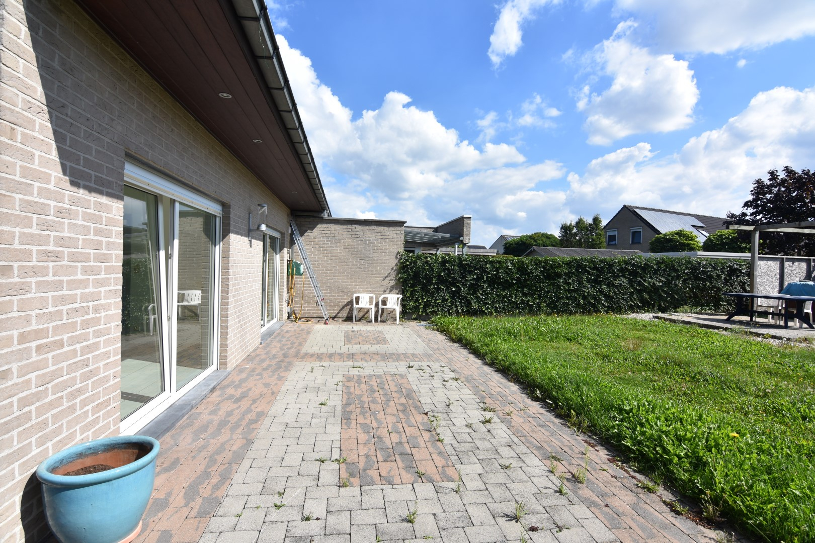 Voortuin met oprit - zijtuin - terras achteraan met grote achtertuin en toegang tot de 2de garagebox/berging.