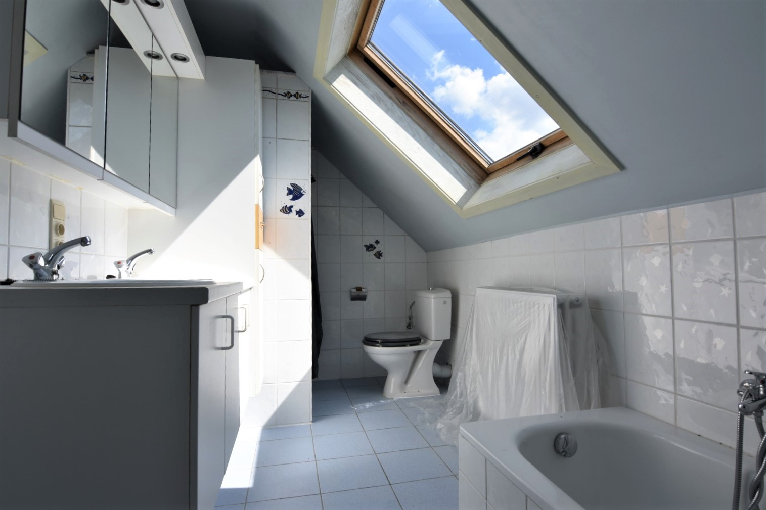 Verdieping: nachthal - 3 slaapkamers - badkamer met toilet, dubbele wastafel, douche én ligbad! Zolder via valluik.