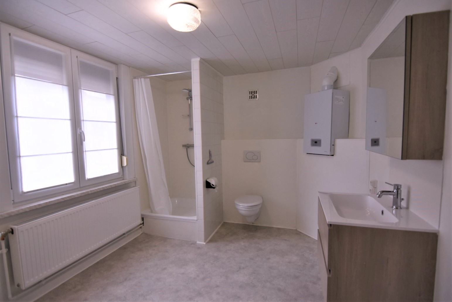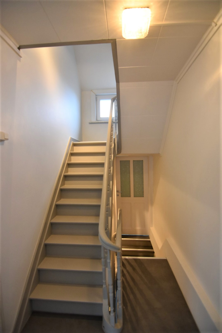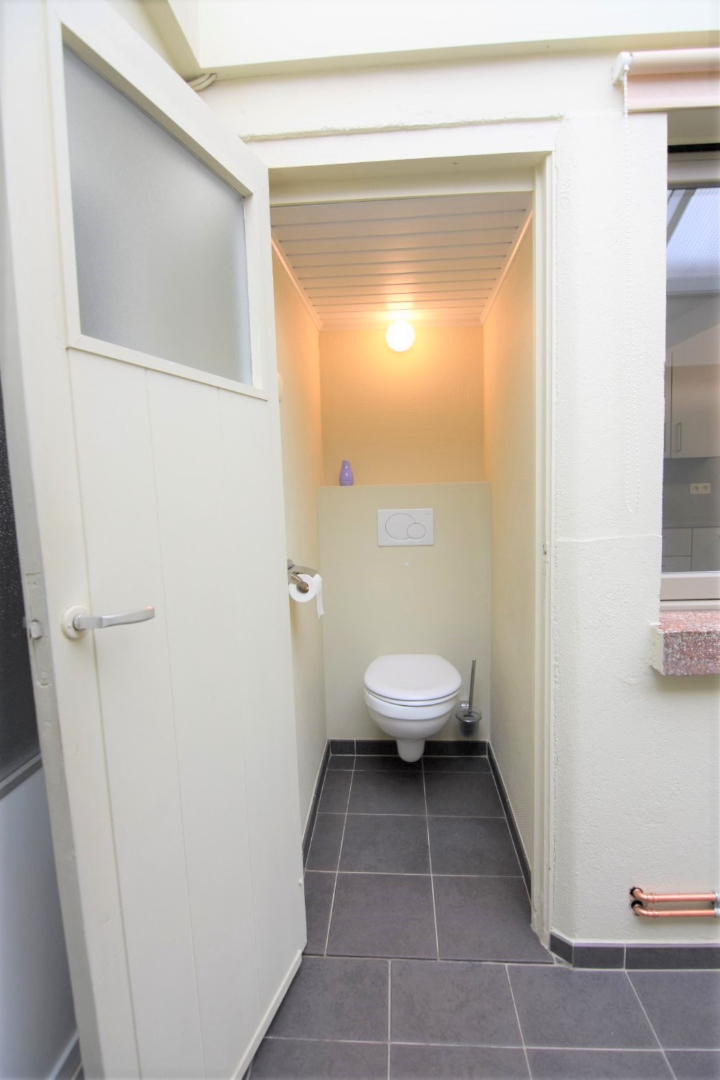 Op de tussenverdieping is er een ruimte badkamer met vernieuwde douche, toilet en wastafel.