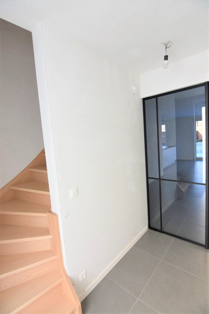 Ze omvat een inkomhal met gastentoilet en trap, een moderne glazen deur biedt toegang tot de lichtrijke woonkamer met open ingerichte keuken.