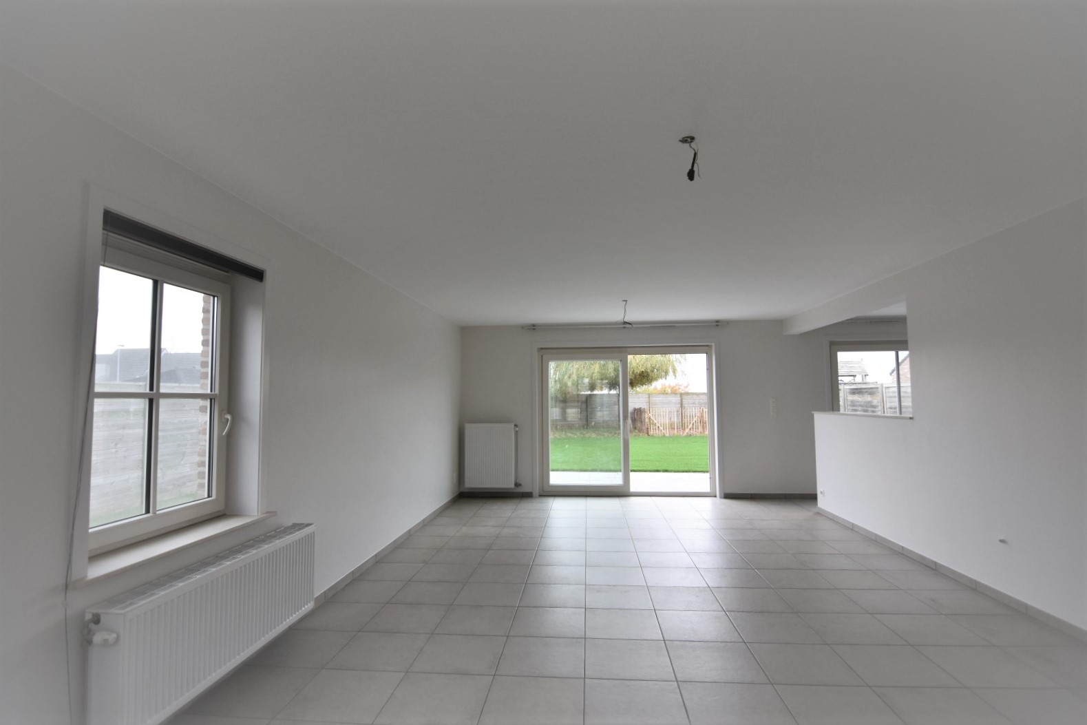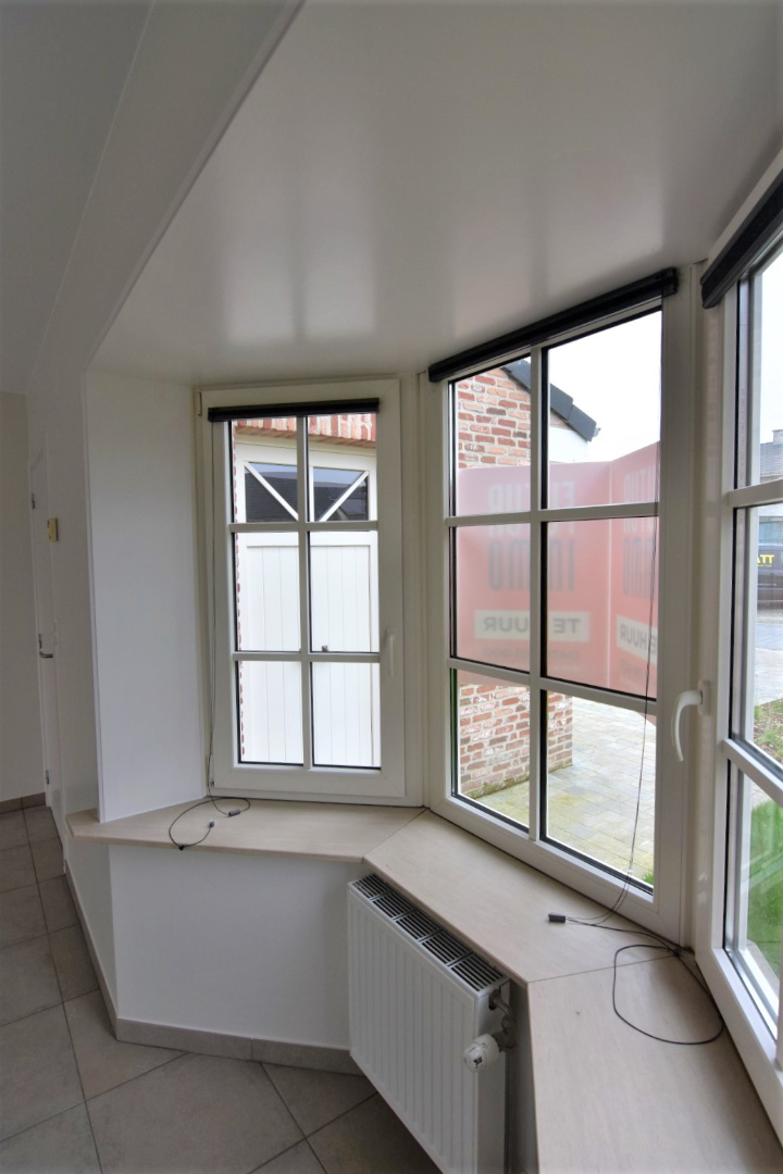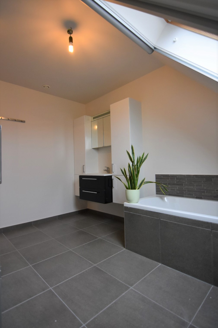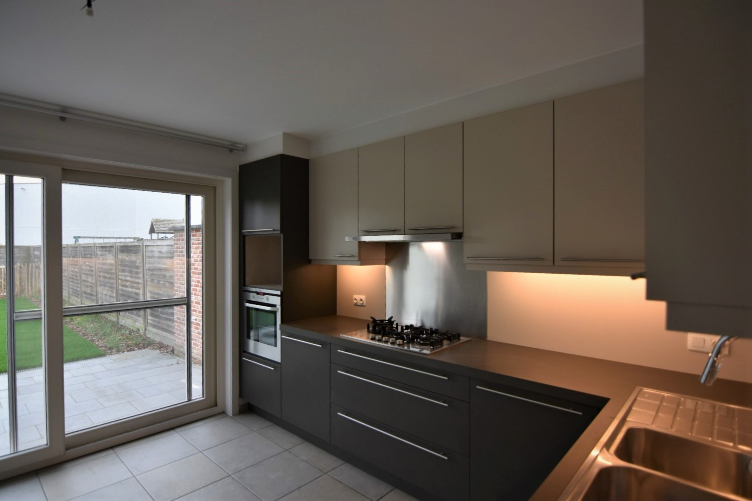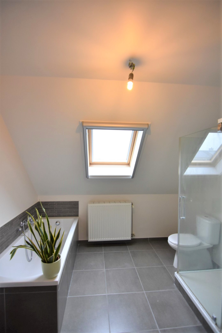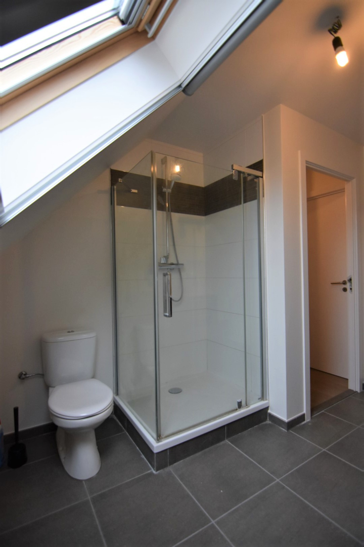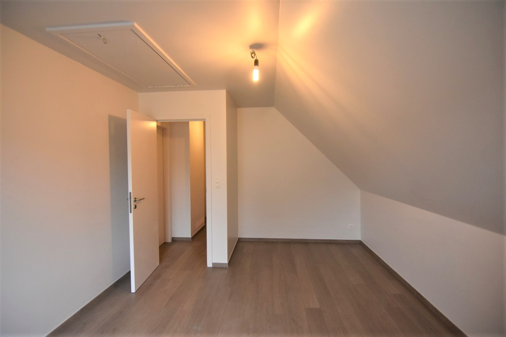 inkomhal met gastentoilet en trap - lichtrijke woonkamer met open ingerichte keuken (oven - vaatwas - vrijstaande koelkast - gasfornuis) - garage - nachthal - badkamer (enkele wastafel - ligbad - toilet - douche) - grote slaapkamer - middelgrote slaapkamer (beide met rolluiken en verduistering) - zolder.