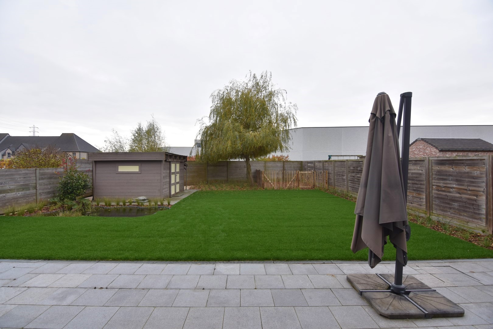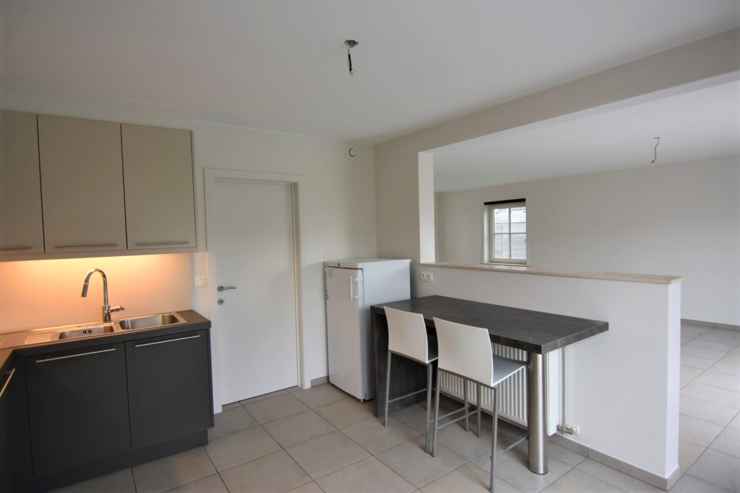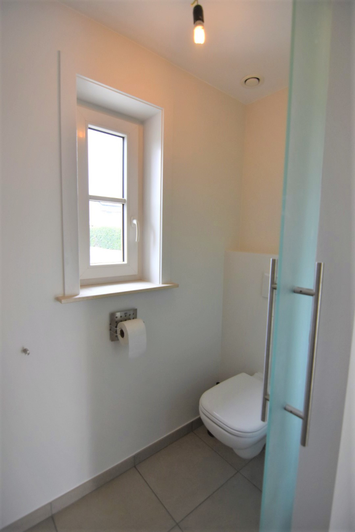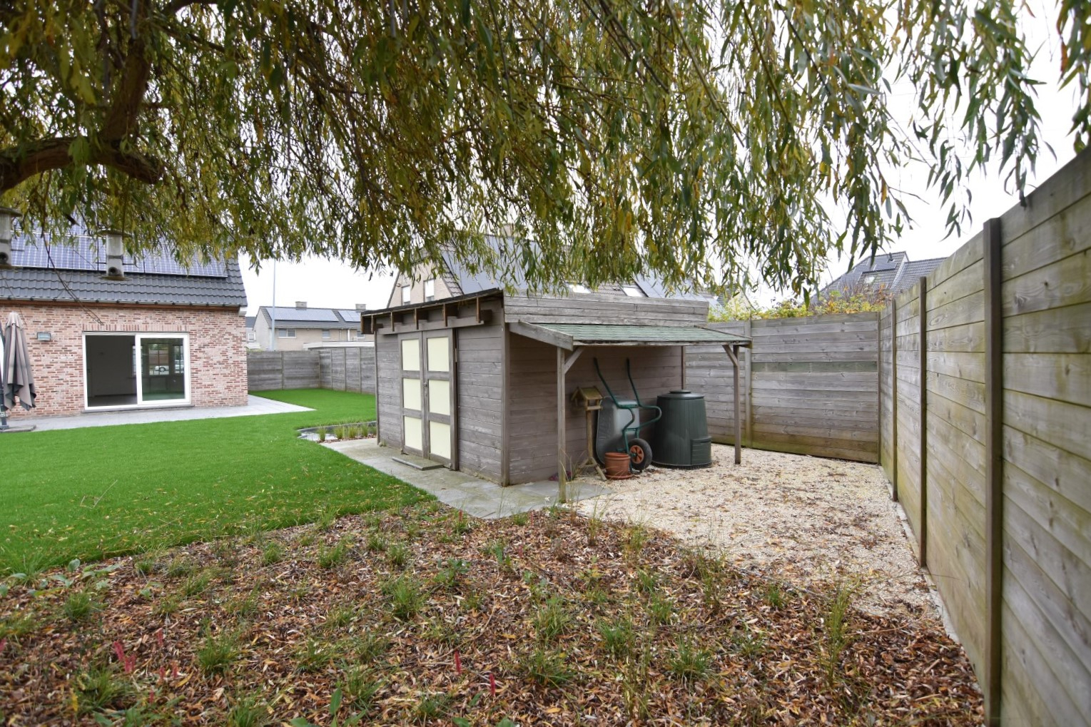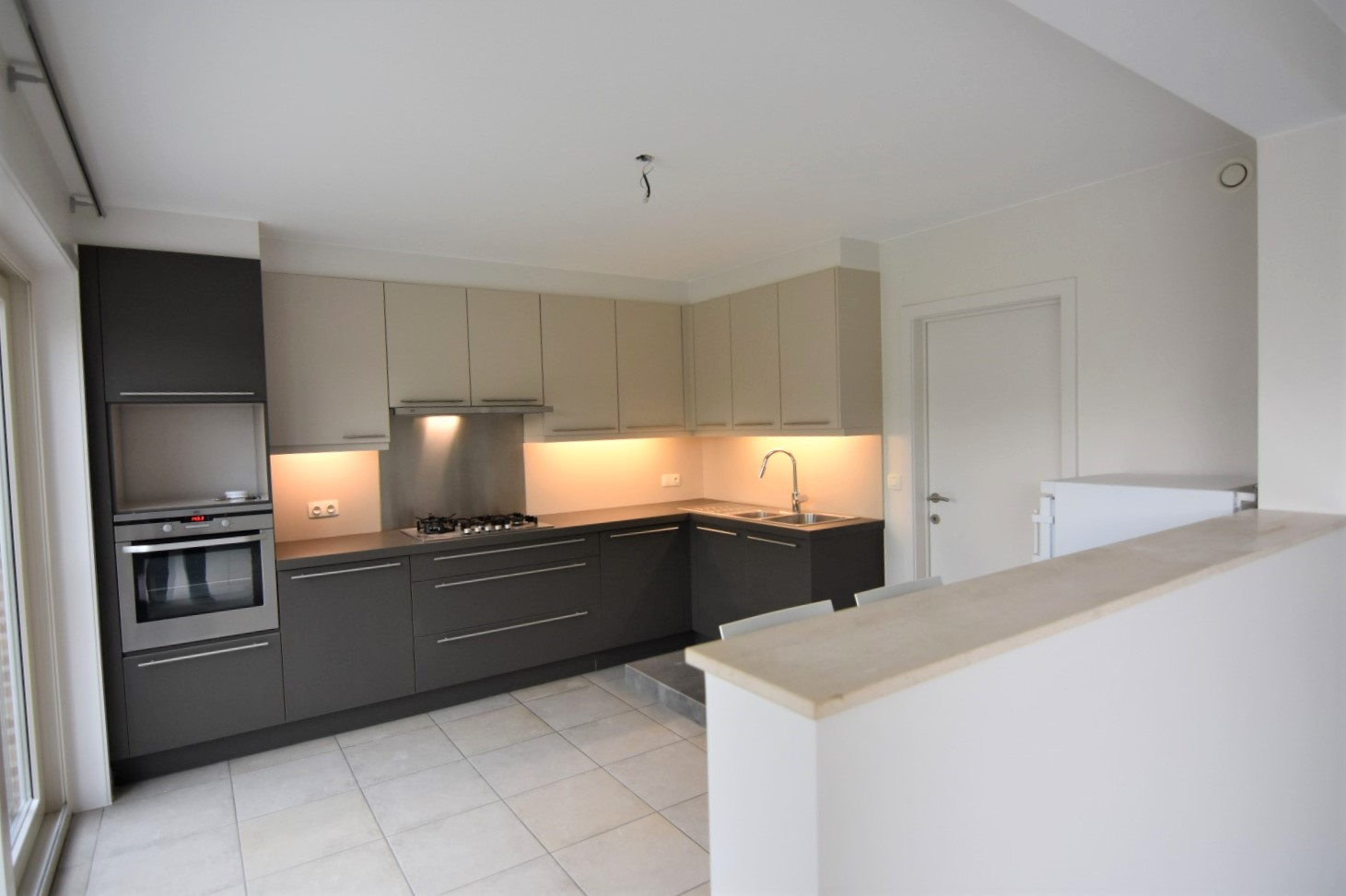 inkomhal met gastentoilet en trap - lichtrijke woonkamer met open ingerichte keuken (oven - vaatwas - vrijstaande koelkast - gasfornuis) - garage - nachthal - badkamer (enkele wastafel - ligbad - toilet - douche) - grote slaapkamer - middelgrote slaapkamer (beide met rolluiken en verduistering) - zolder.