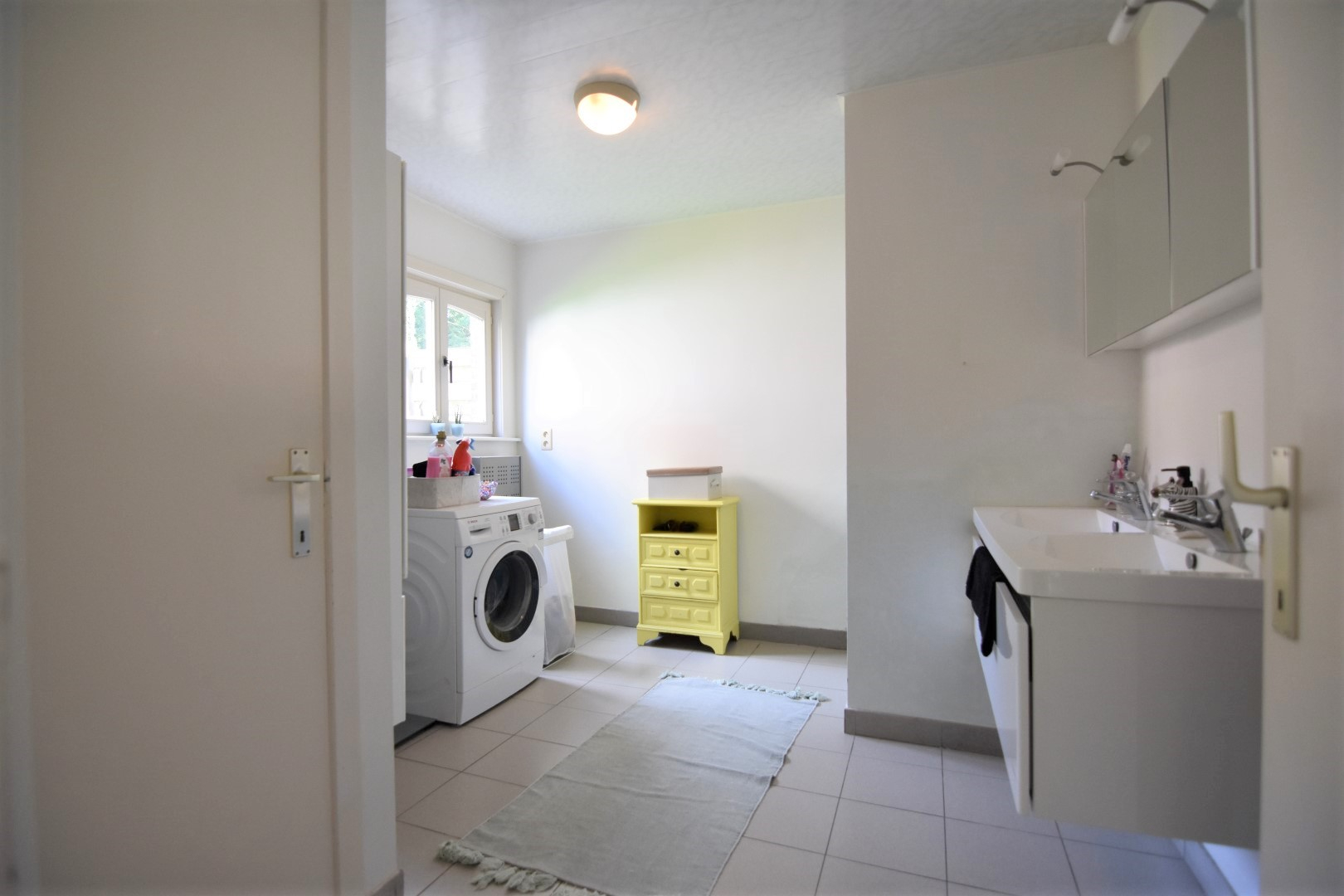 Gelijkvloers: inkomhal - kelder - aparte eetkamer aan keuken - keuken - badkamer (dubbele wastafel en douche) met toilet en wasplaats - lichtrijke leefruimte met zicht op de tuin