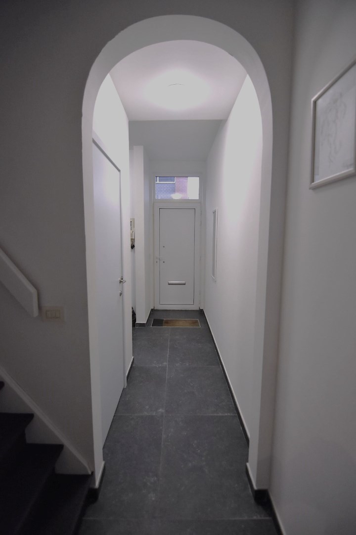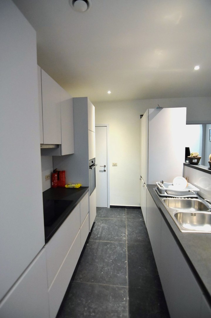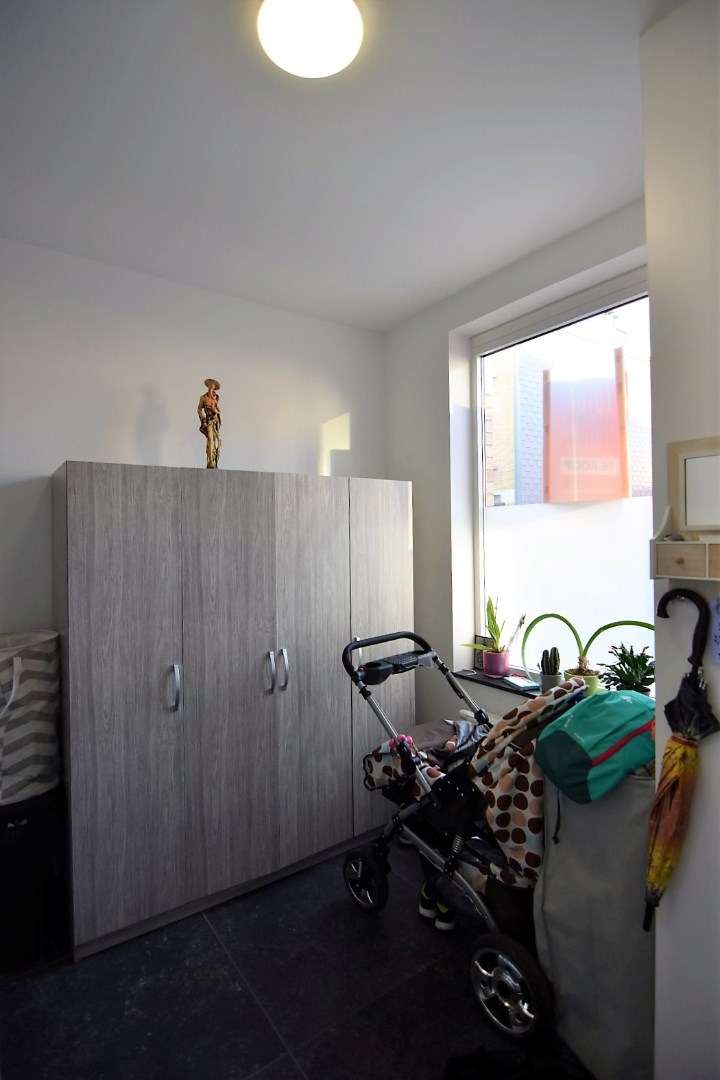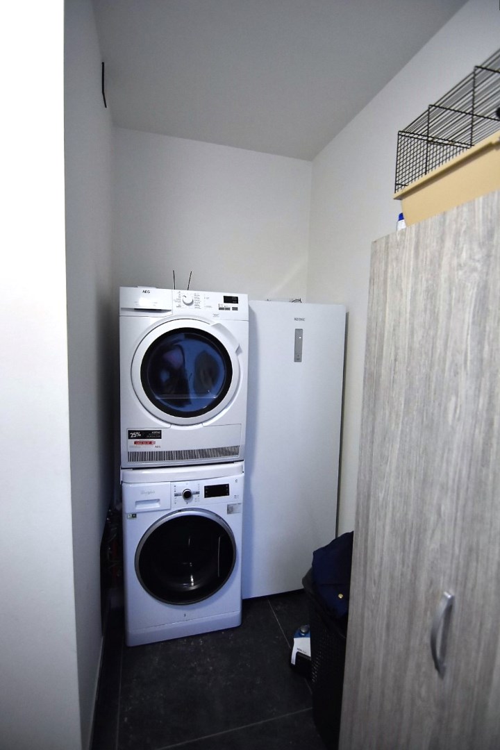 De moderne woning bestaat uit een inkomhal met bergruimte (fietsenstalling, aansluiting wasmachine), gastentoilet en lichtrijke leefruimte (inbouwspots) met open, ingerichte keuken. (vaatwas, koelkast, elektrische kookplaat, oven) Vanuit de keuken is er toegang tot een droge kelder.