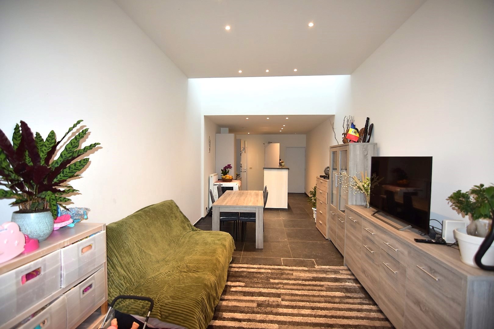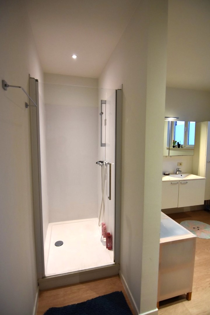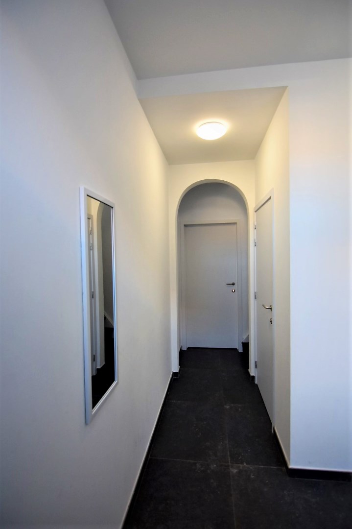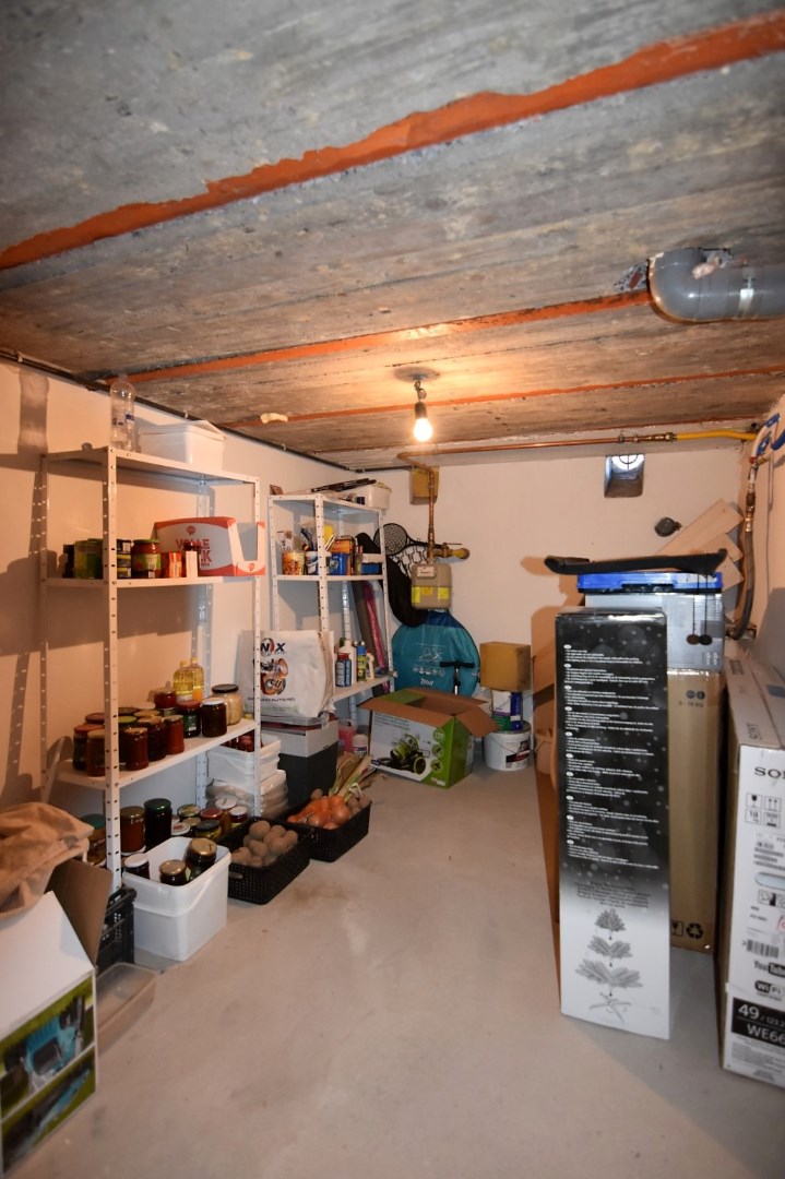 De moderne woning bestaat uit een inkomhal met bergruimte (fietsenstalling, aansluiting wasmachine), gastentoilet en lichtrijke leefruimte (inbouwspots) met open, ingerichte keuken. (vaatwas, koelkast, elektrische kookplaat, oven) Vanuit de keuken is er toegang tot een droge kelder.