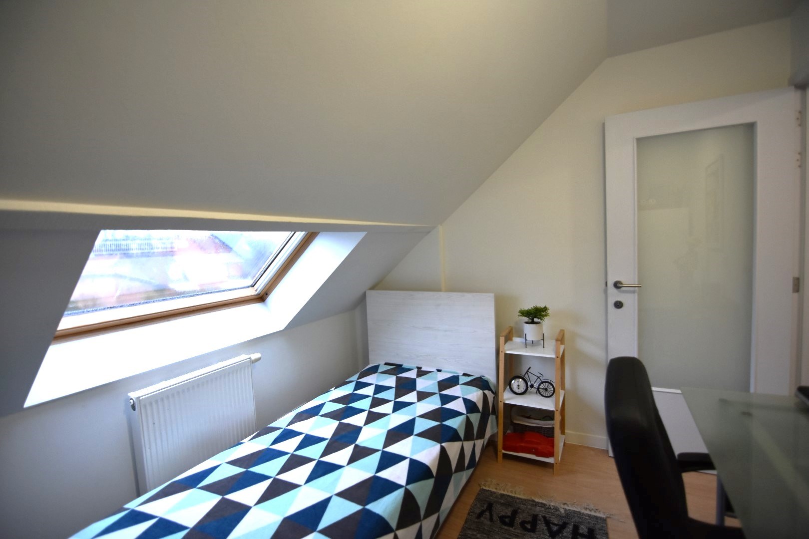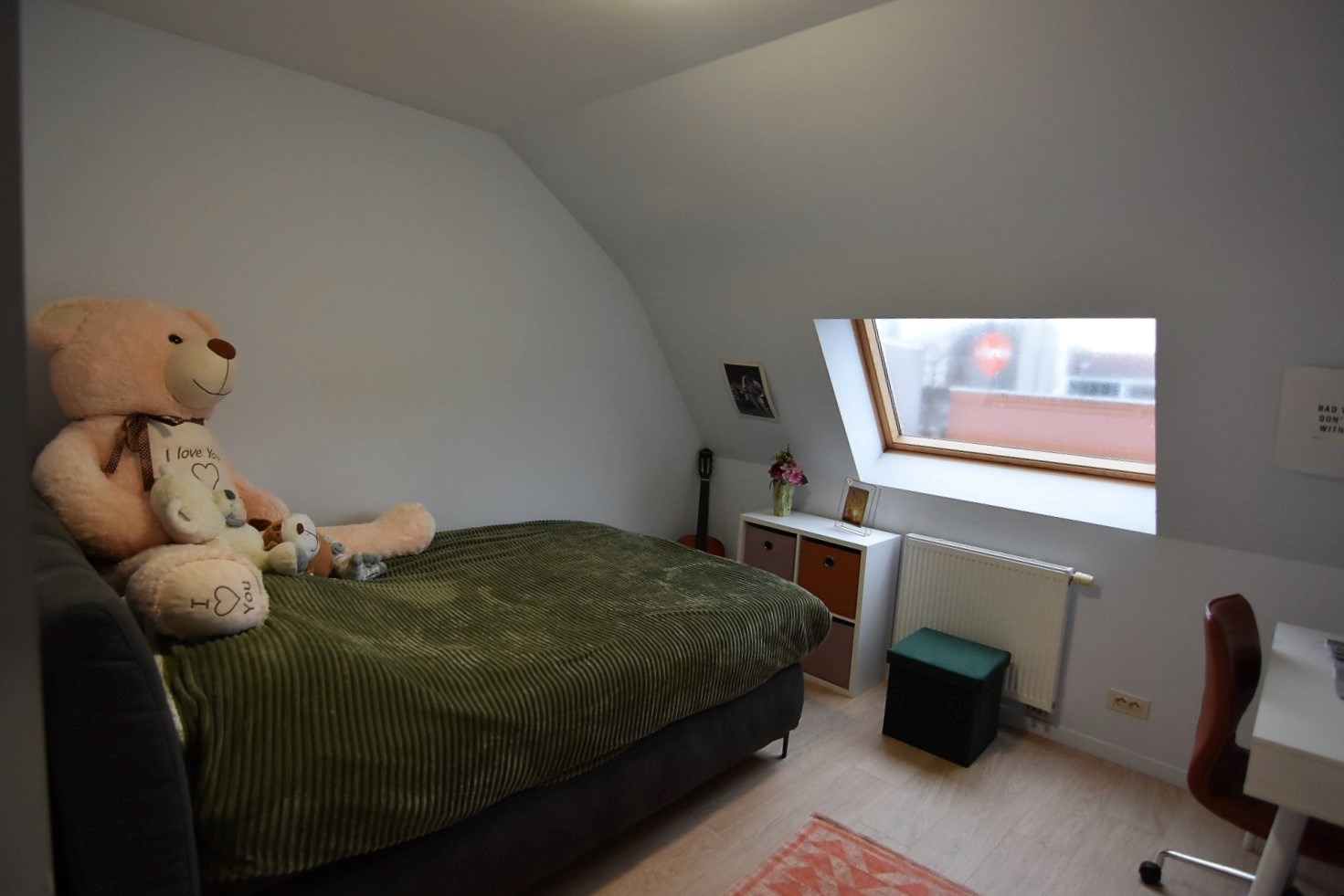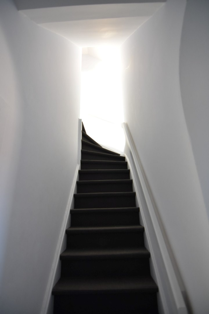 Op de tweede verdieping vinden we 1 kleine en 1 grote slaapkamer.