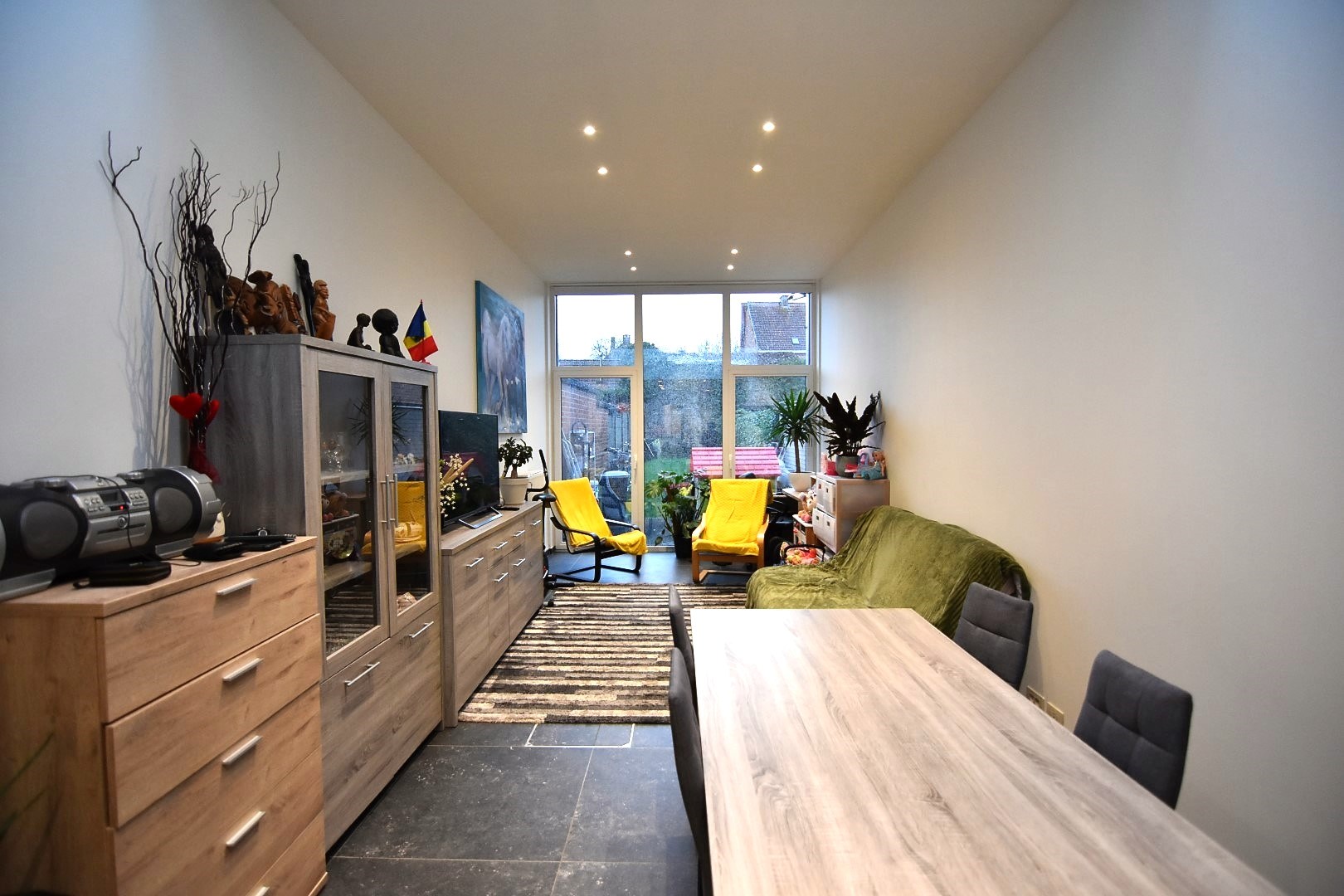 De grote raampartij in de leefruimte is voorzien van automatische zonnewering en biedt toegang tot een diepe, zon gerichte tuin met terras en gazon.