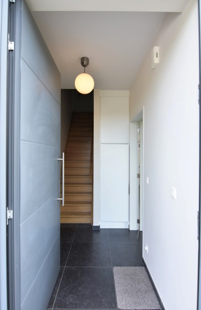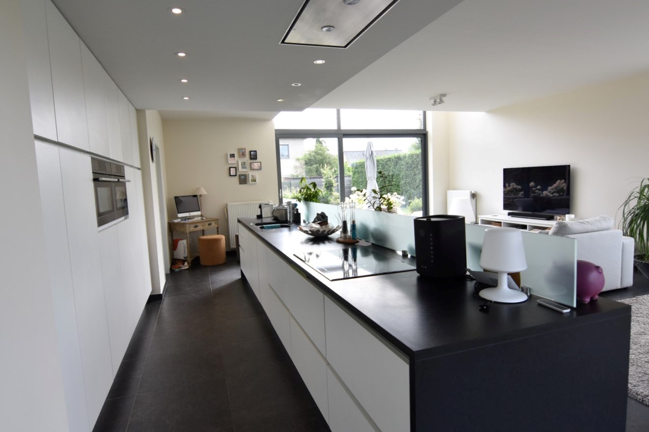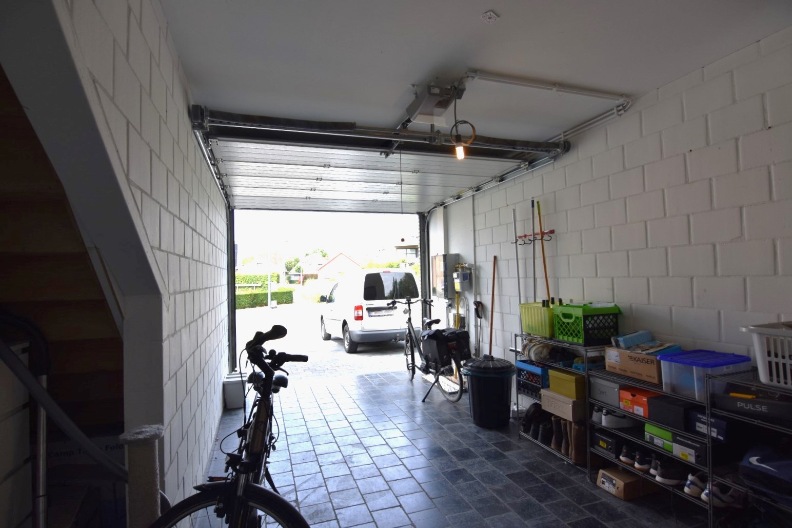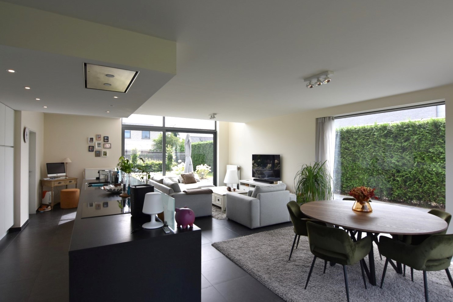 GELIJKVLOERS: inkomhal met vestiaire kast en trap - grote leefruimte met open ingerichte keuken (lichtrijk dankzij de vele raampartijen!) - tussenhal met gastentoilet - praktische wasplaats (inbouwkasten) - garage met automatische poort