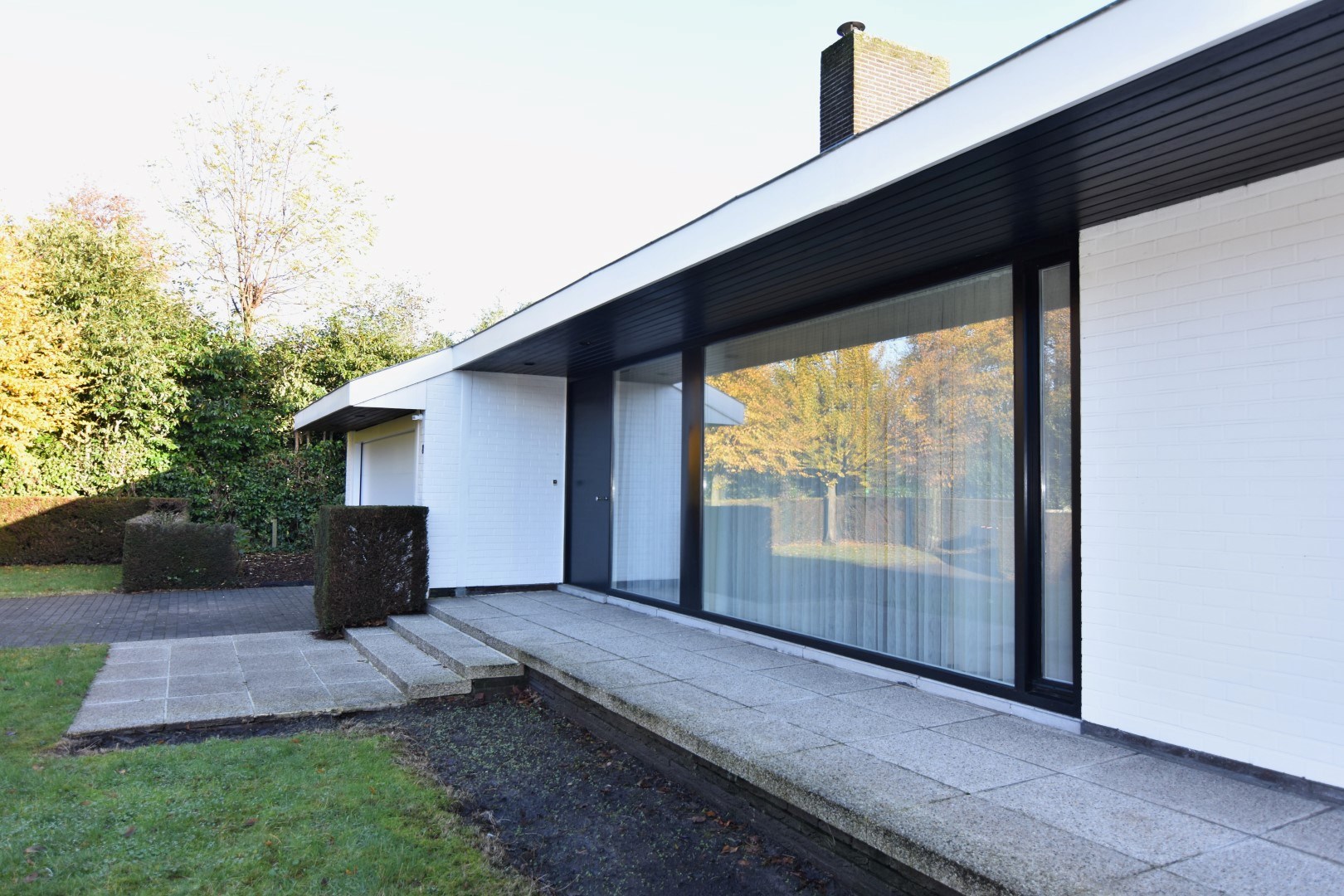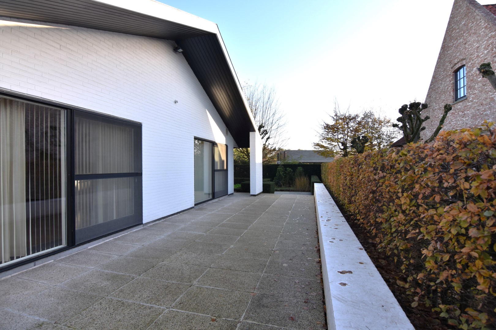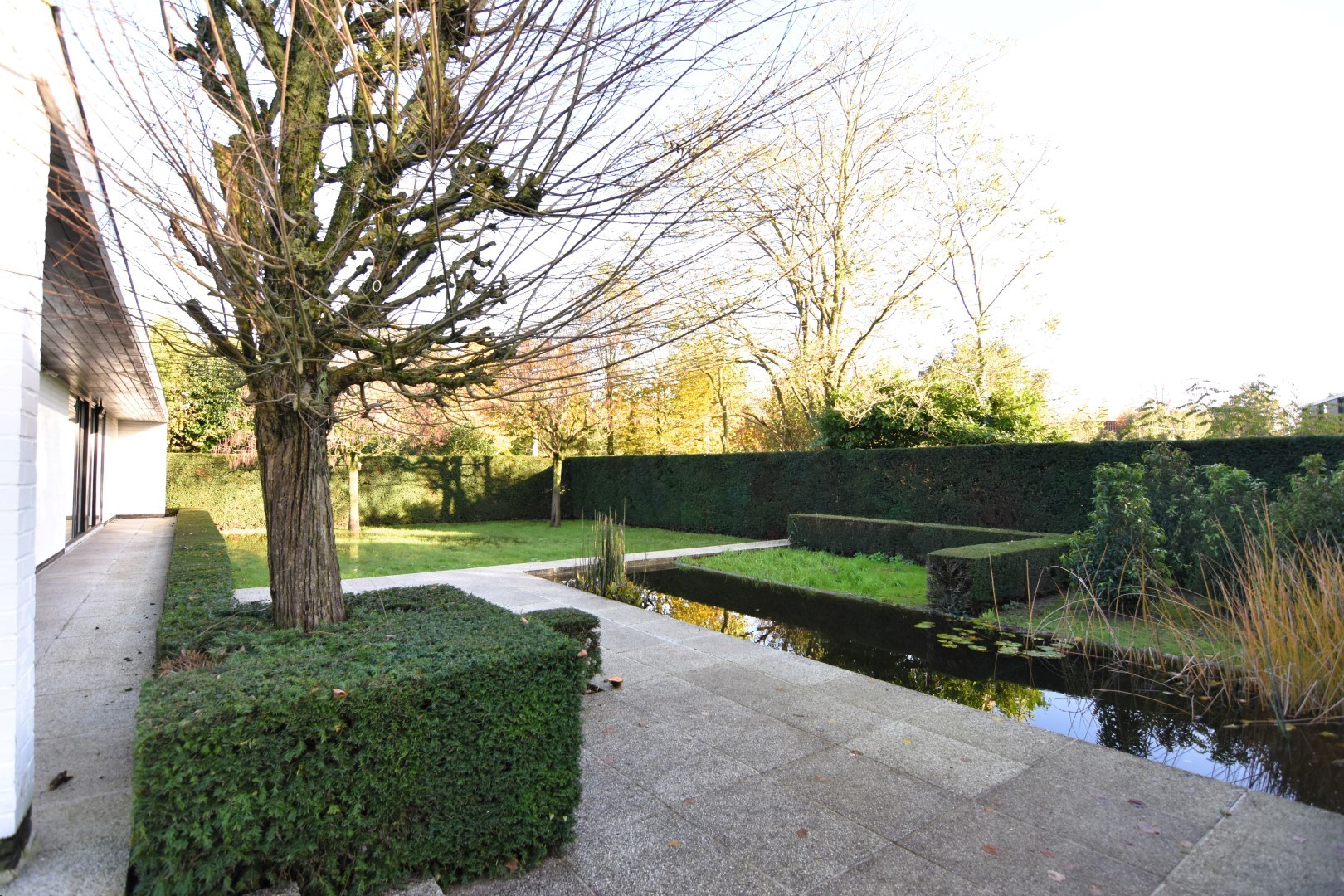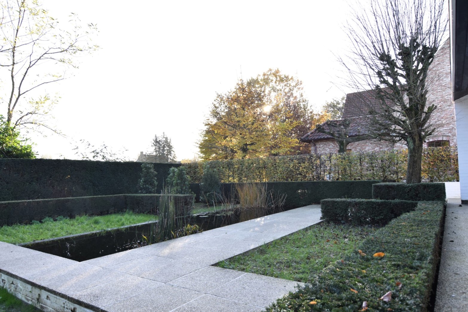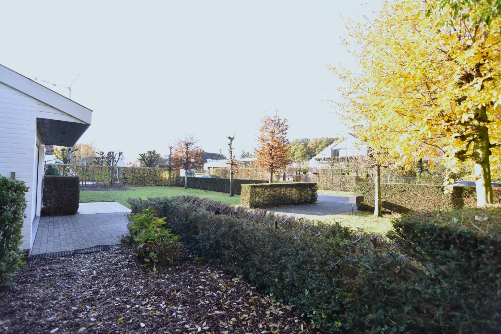 De woonst is rondom rond omgeven door een mooi aangelegde tuin met onder andere een ZO- gericht terras, vijver, gazon, perk met aanplantingen, hagen,... vlot toegankelijk vanuit de belangrijkste ruimtes (schuiframen). Vooraan de woning is er een ruime oprit waar makkelijk 2 auto's kunnen parkeren.