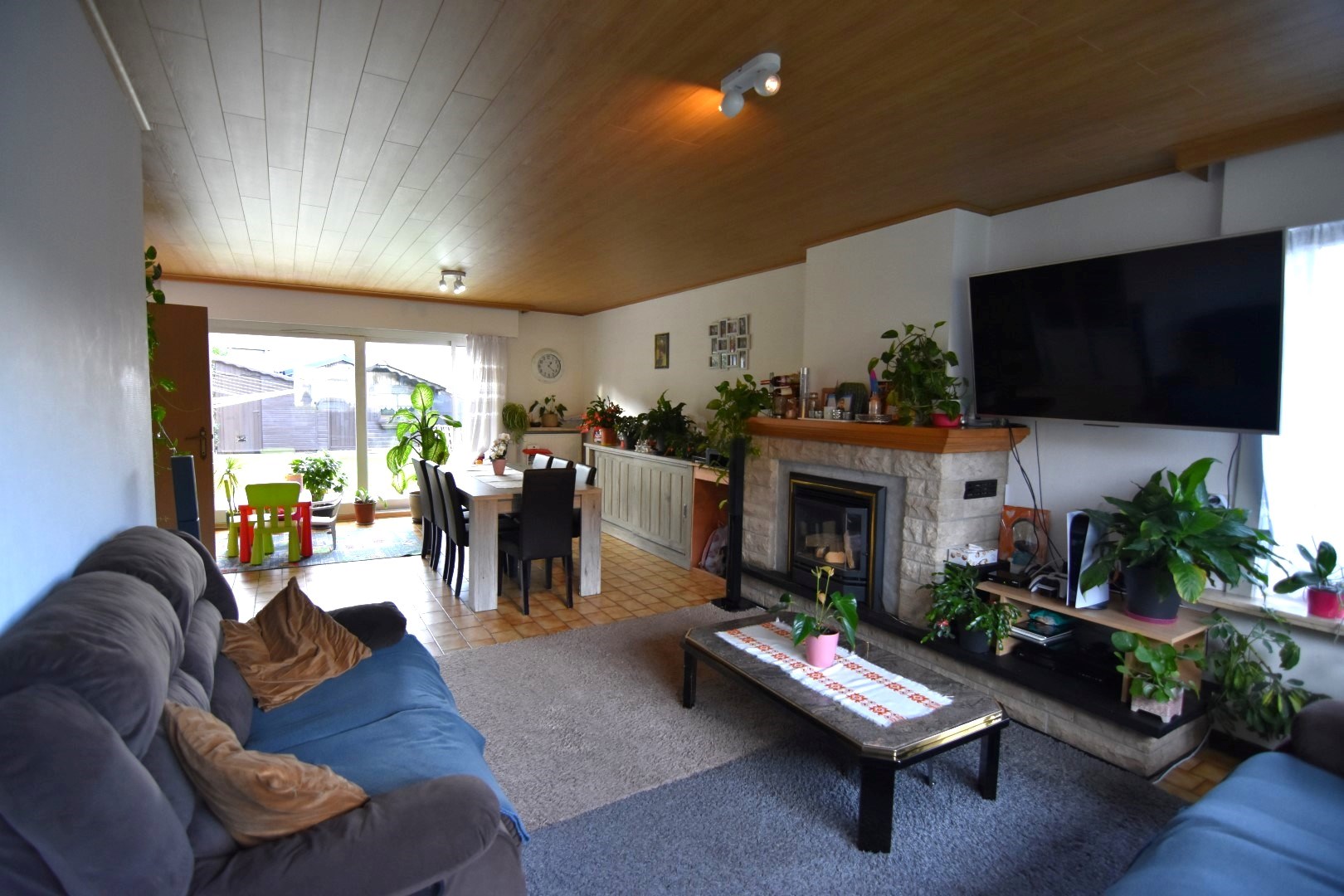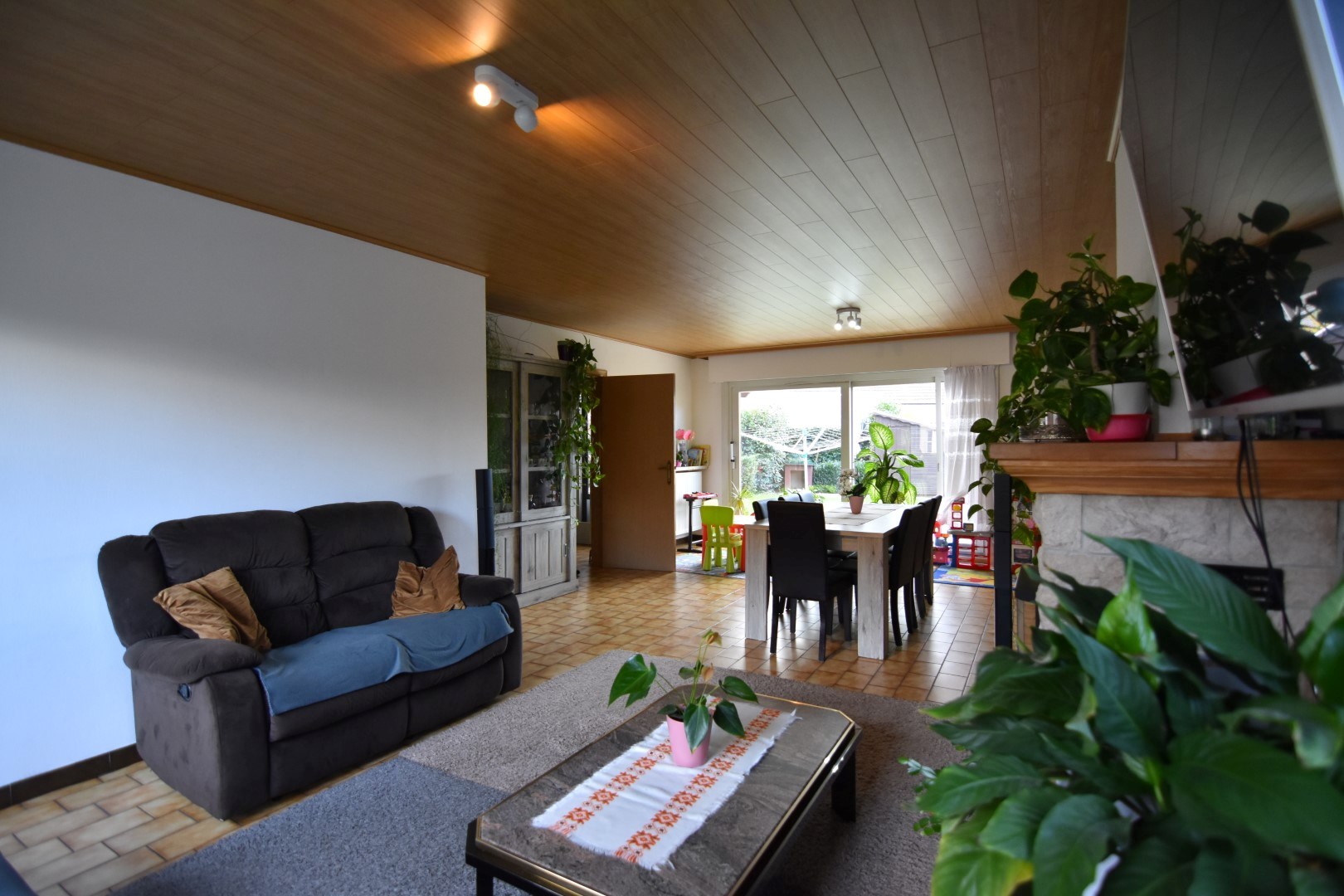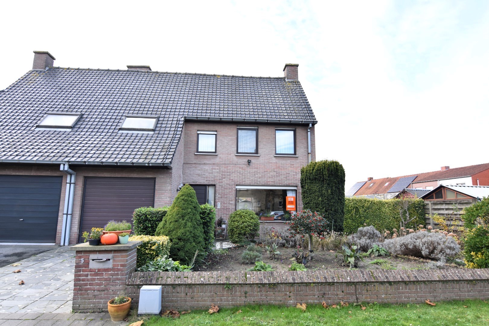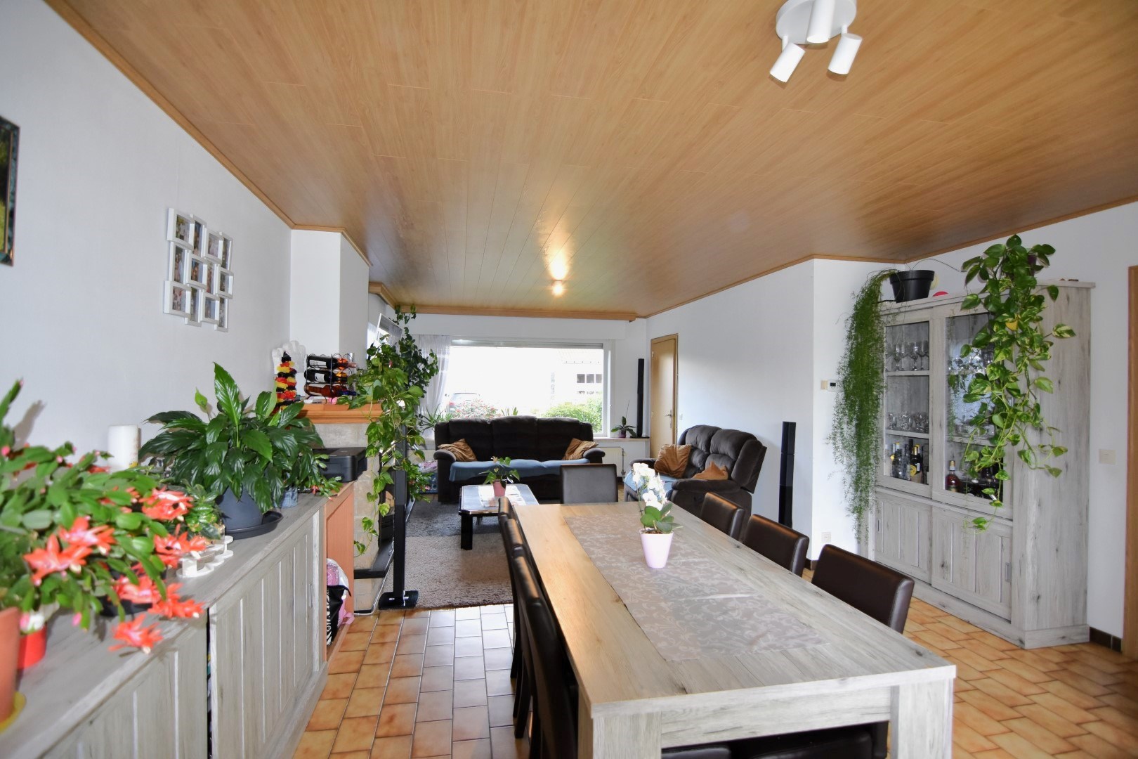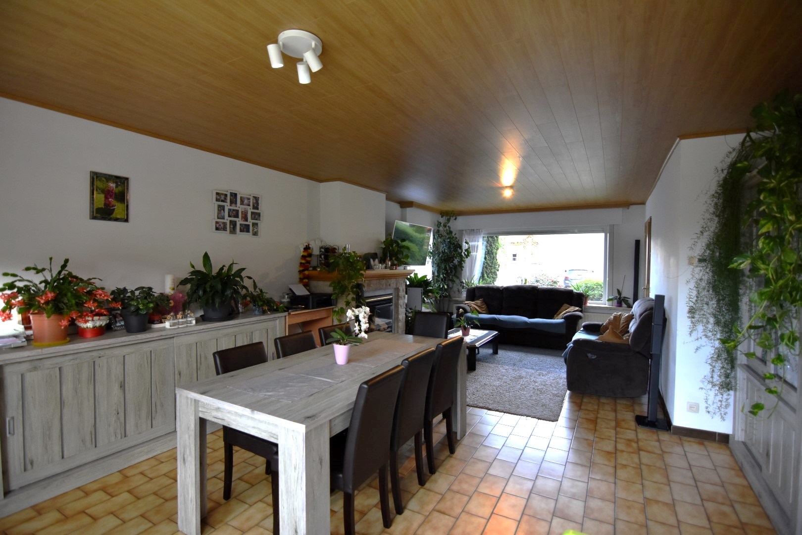 De woning omvat een inkomhal met toilet, trap, woonkamer, keuken (kookplaat en oven), berging en garage met elektrische poort.
