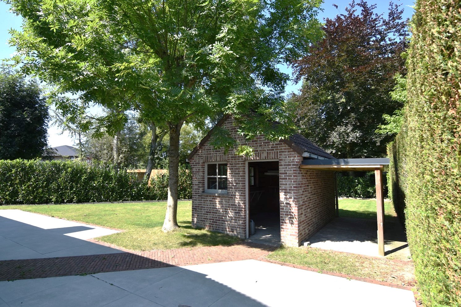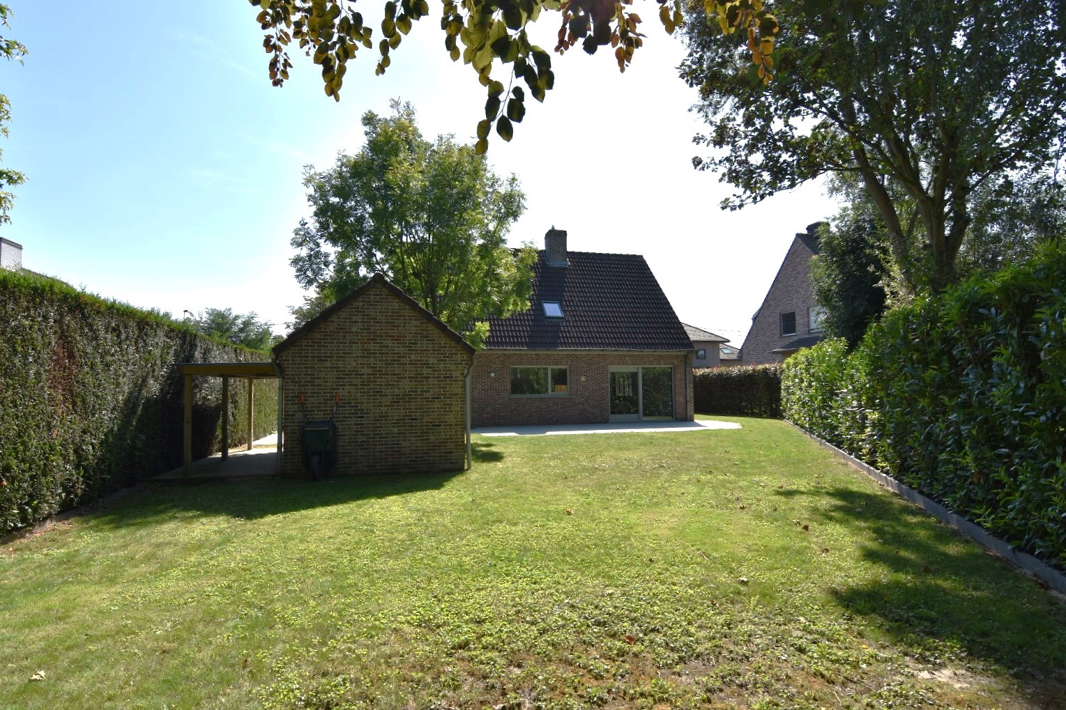 De tuin bestaat uit een ruim terras, gemetste tuinberging, gazon alsook een overdekte fietsenstalling.