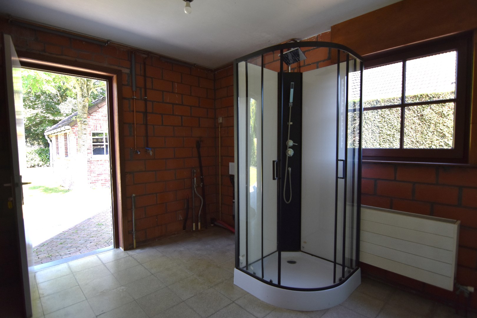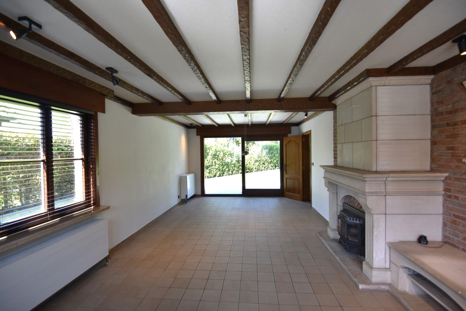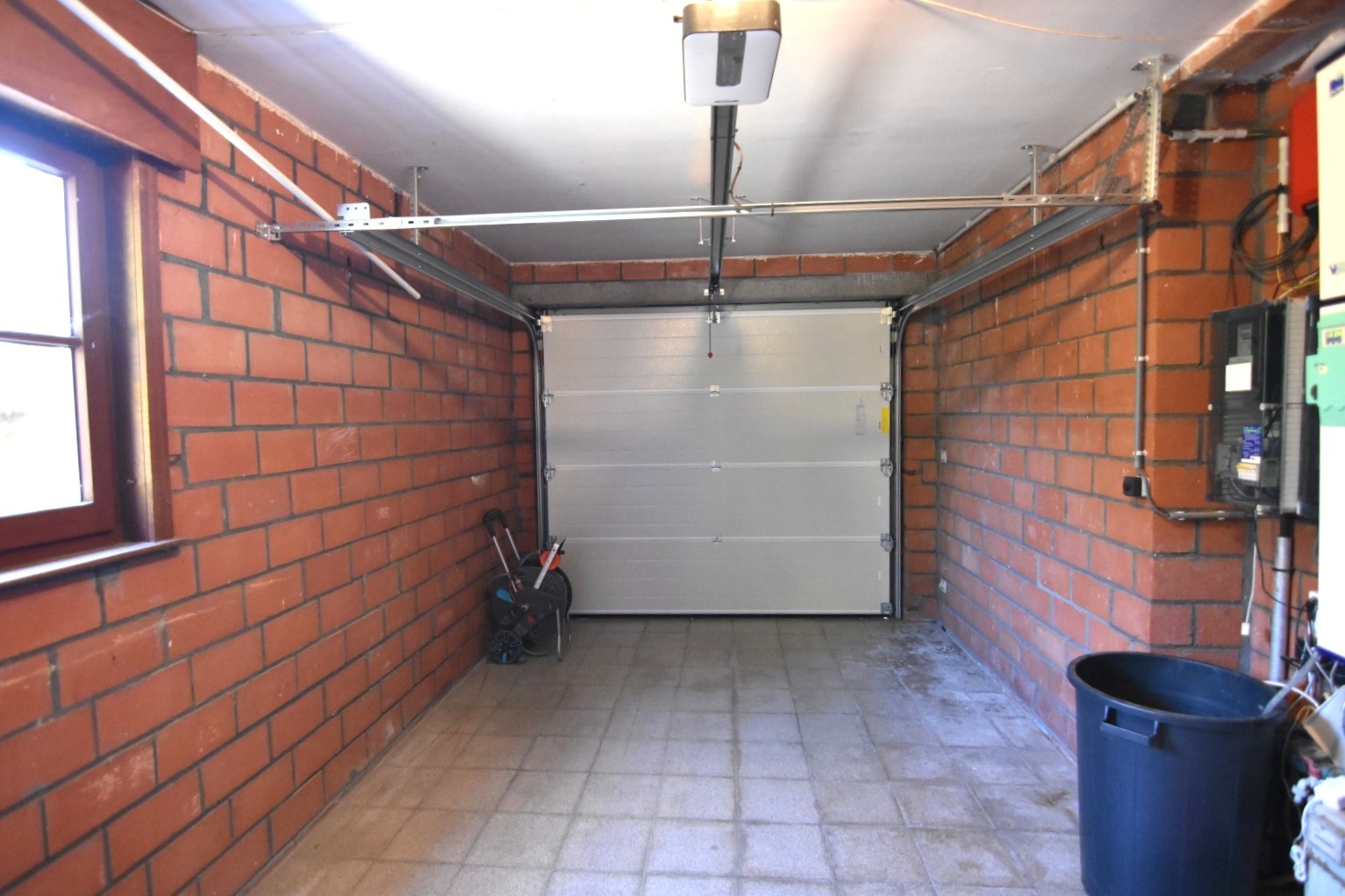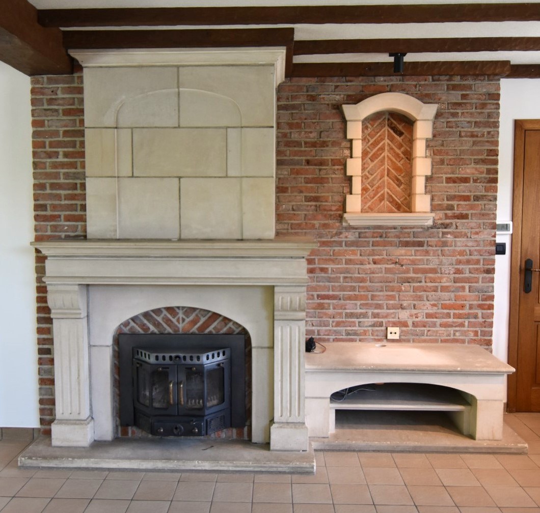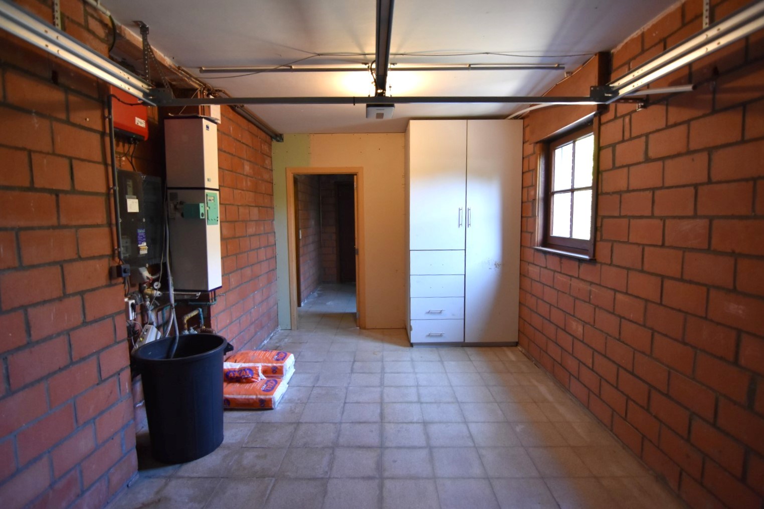Inkomhal - toilet - technische ruimte - woonkamer met haardcassette (hout) en schuifraam tot tuin - half ingerichte keuken (koelkast - fornuis - oven) - koele berging - wasplaats met douchecabine - enkele garage (automatische poort).