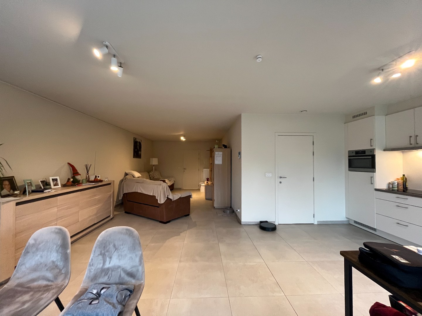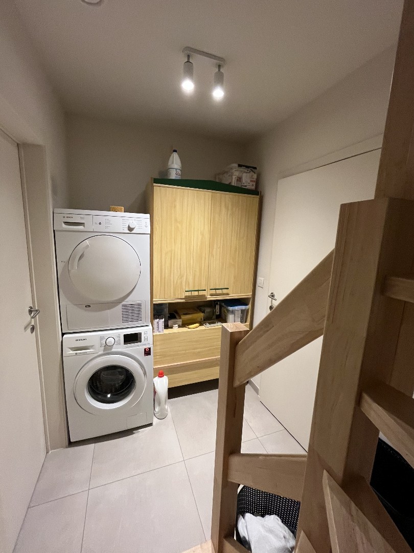 inkomhal met gastentoilet - lichtrijke woonkamer met open ingerichte keuken - (trap)hal met aansluiting wasmachine - garage met automatische poort.