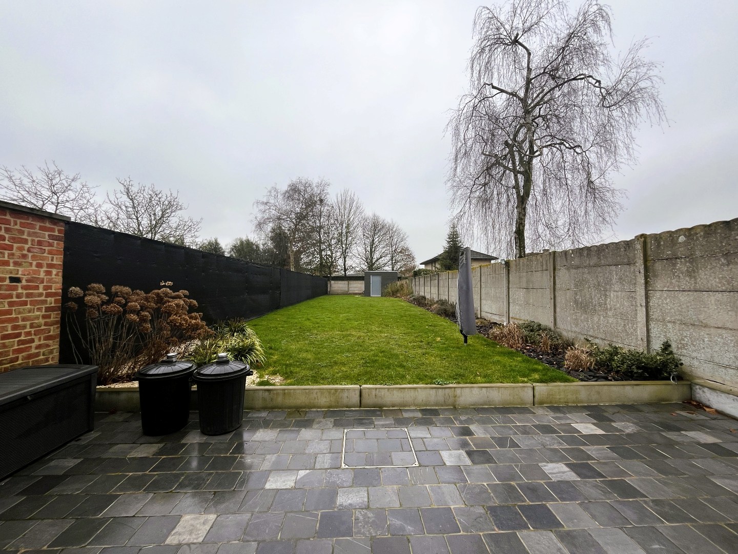 zuid-gerichte en onderhoudsvriendelijke tuin met terras - gazon - border met bloemrijke aanplantingen - praktische tuinberging - oprit met parking voor 1 auto.