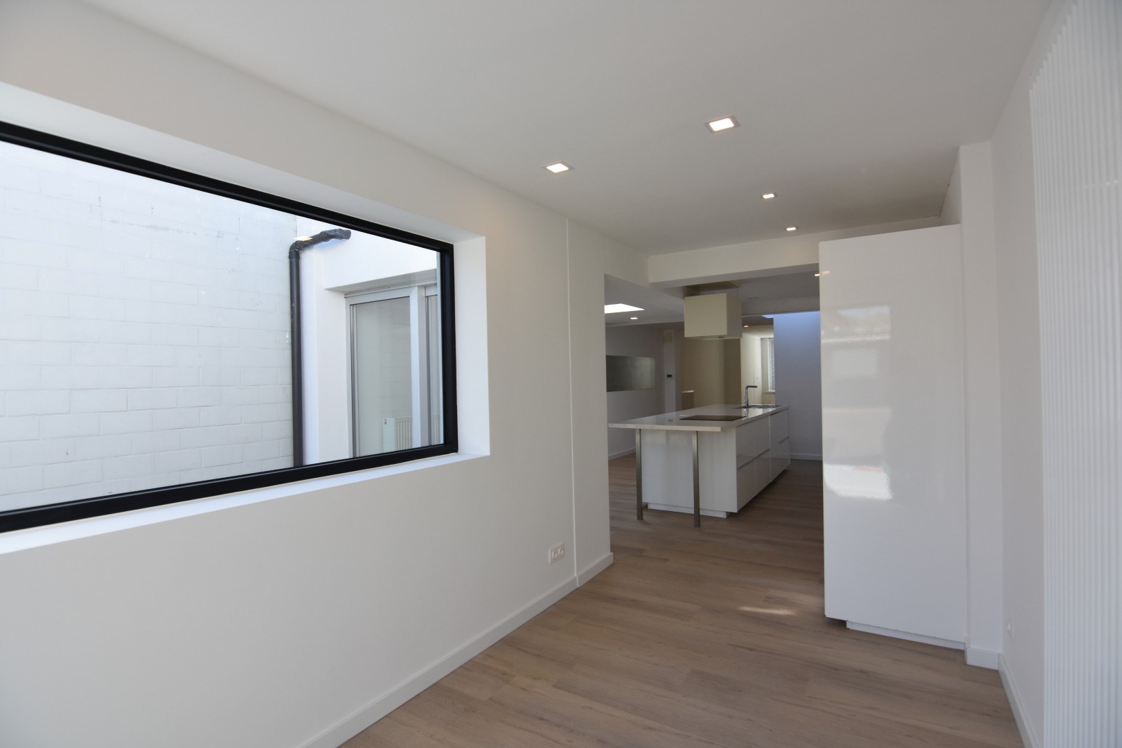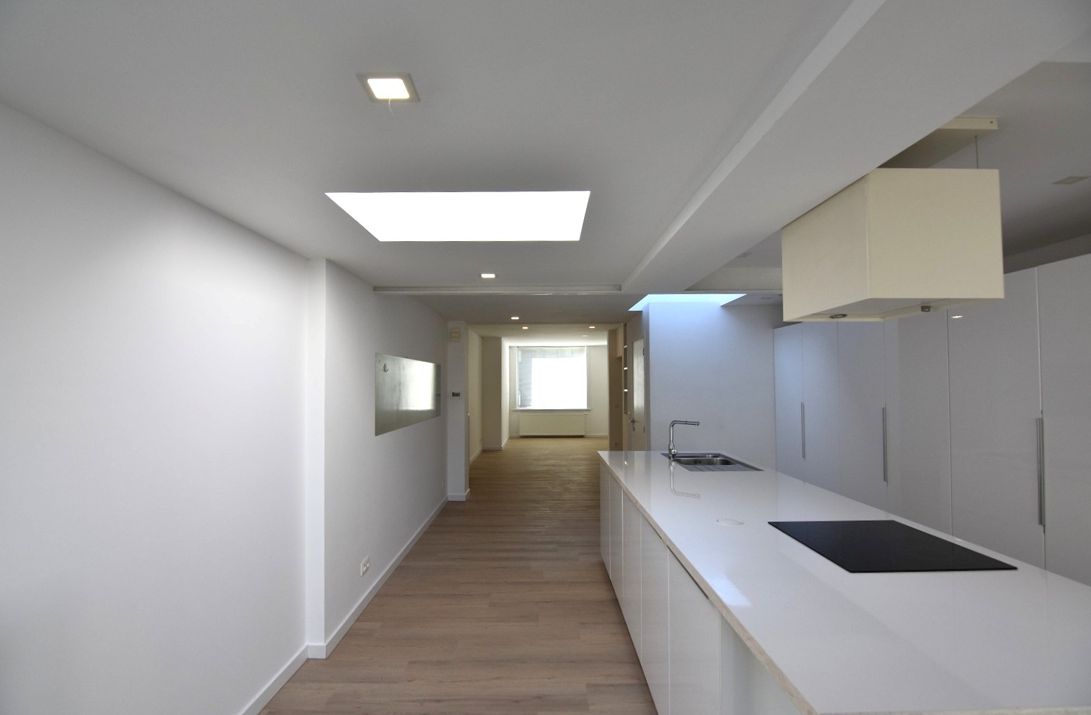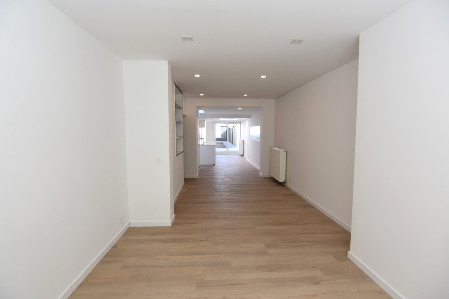 *GELIJKVLOERS: inkomhal - kelderberging - verrassend ruime en lichtrijke woonkamer - toilet - open ingerichte keuken met veel praktische kastruimte en aansluitend polyvalente hoek (eethoek, speelhoek, bureau,...)