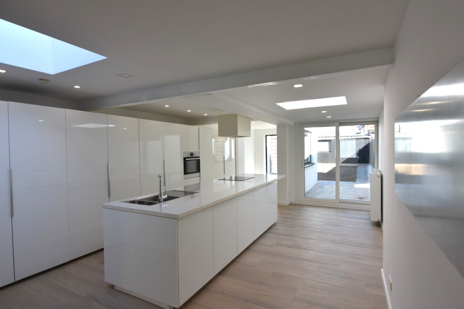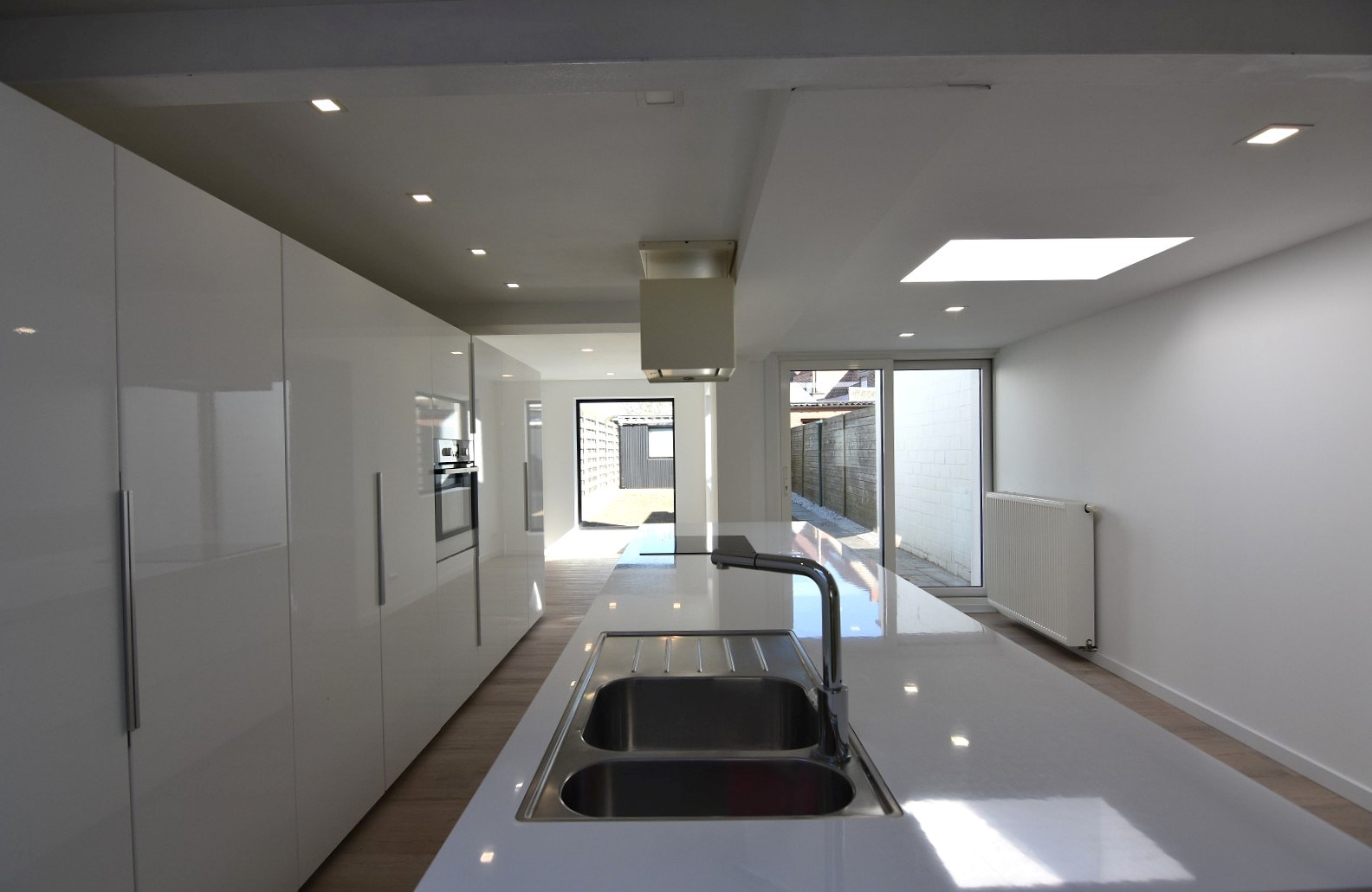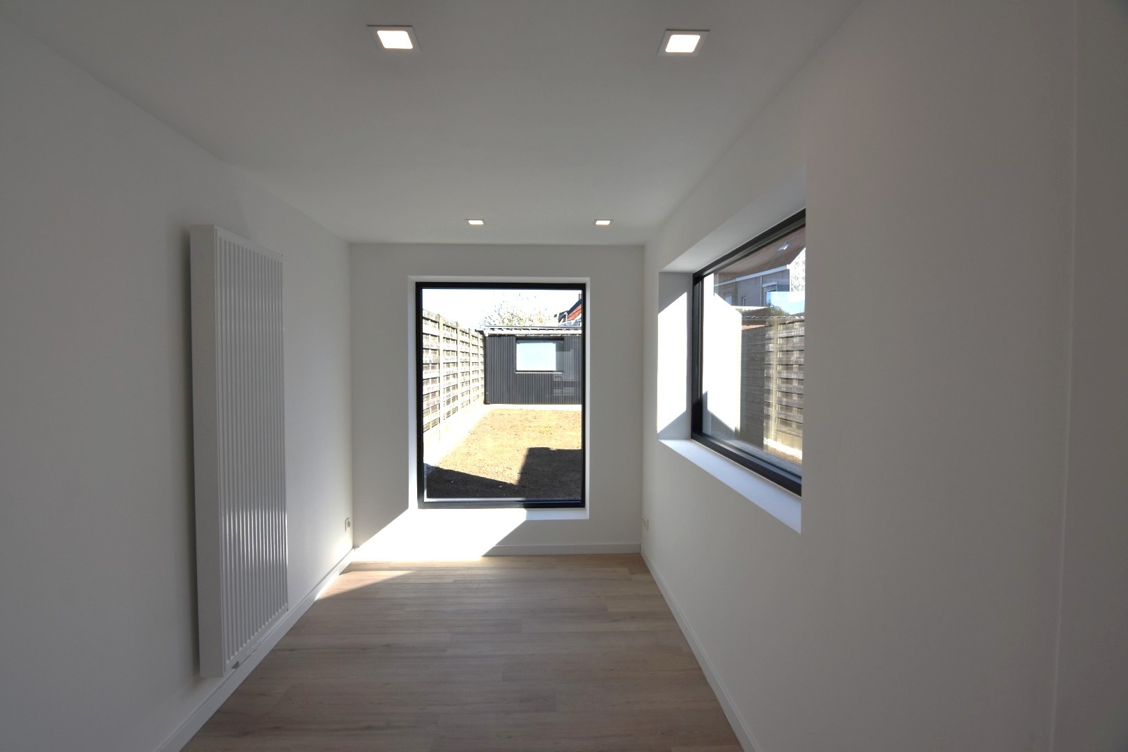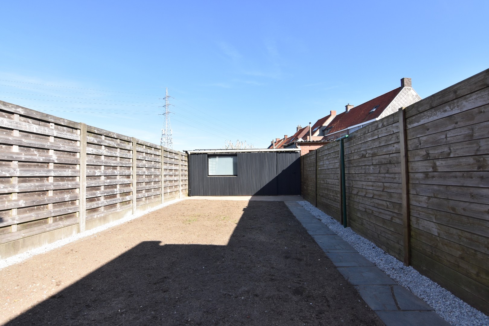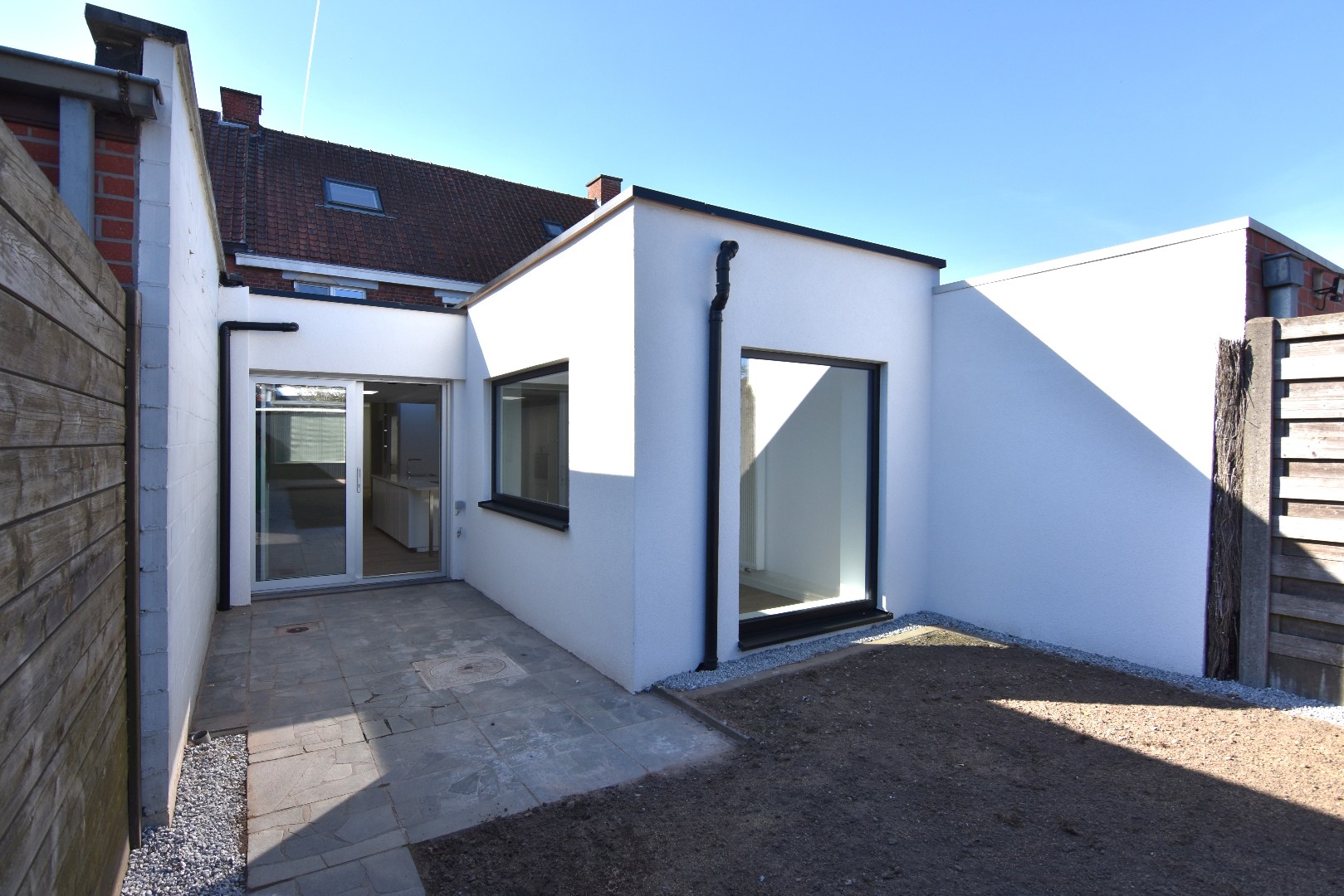 De woning beschikt over een gezellige tuin (gazon pas ingezaaid) met toegang tot de garage met elektrische poort.