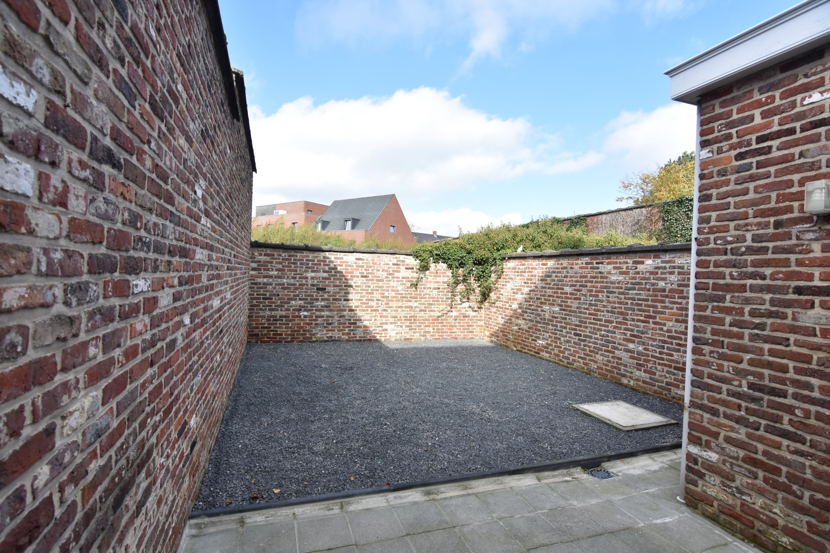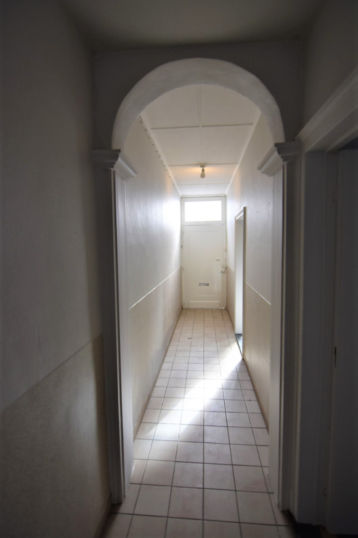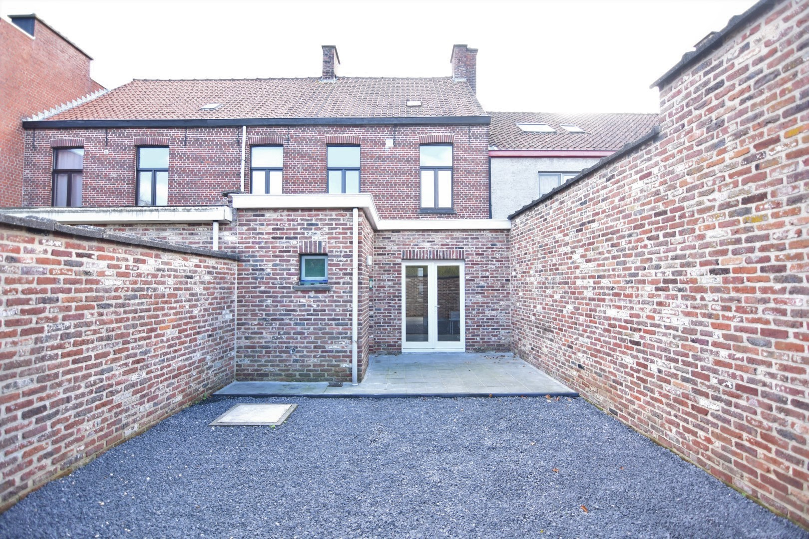Inkomhal - woonkamer - eetplaats met open (gedeeltelijk ingerichte) keuken - kelder - toilet - gezellige binnenkoer