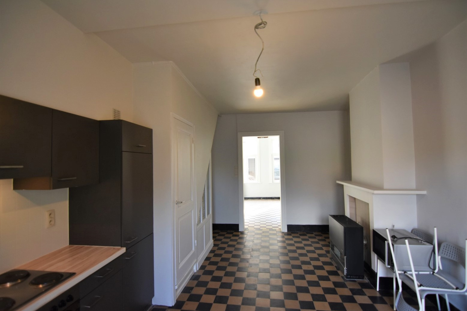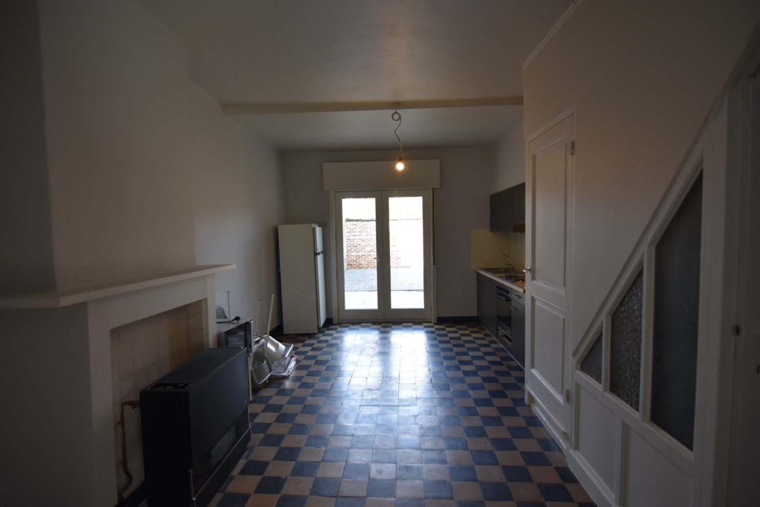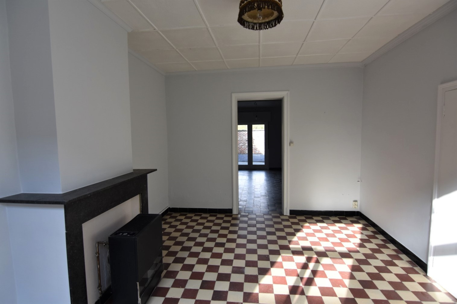 Inkomhal - woonkamer - eetplaats met open (gedeeltelijk ingerichte) keuken - kelder - toilet - gezellige binnenkoer
