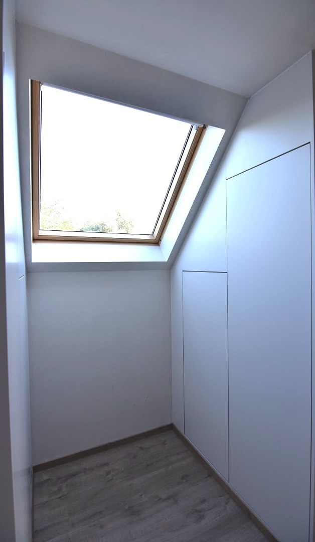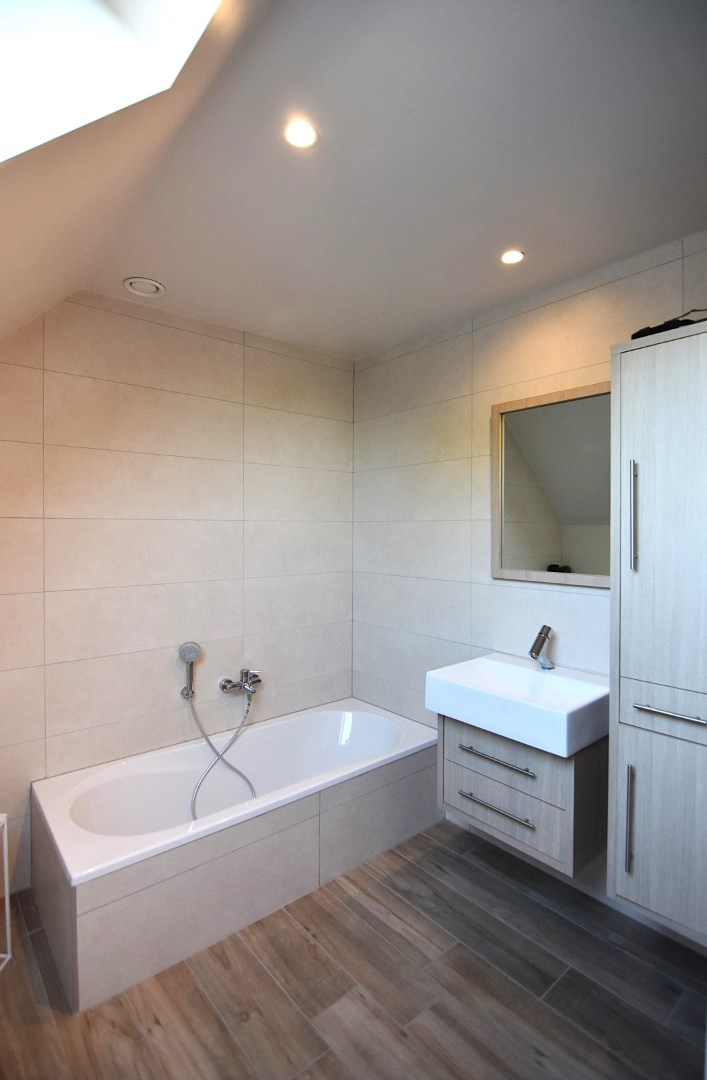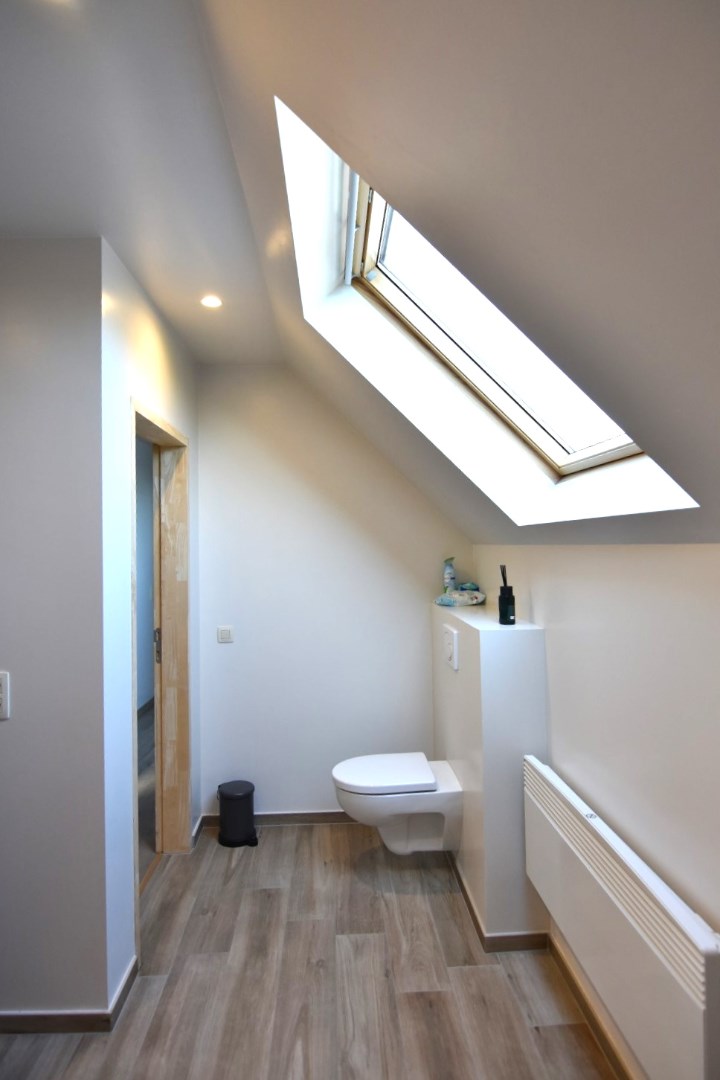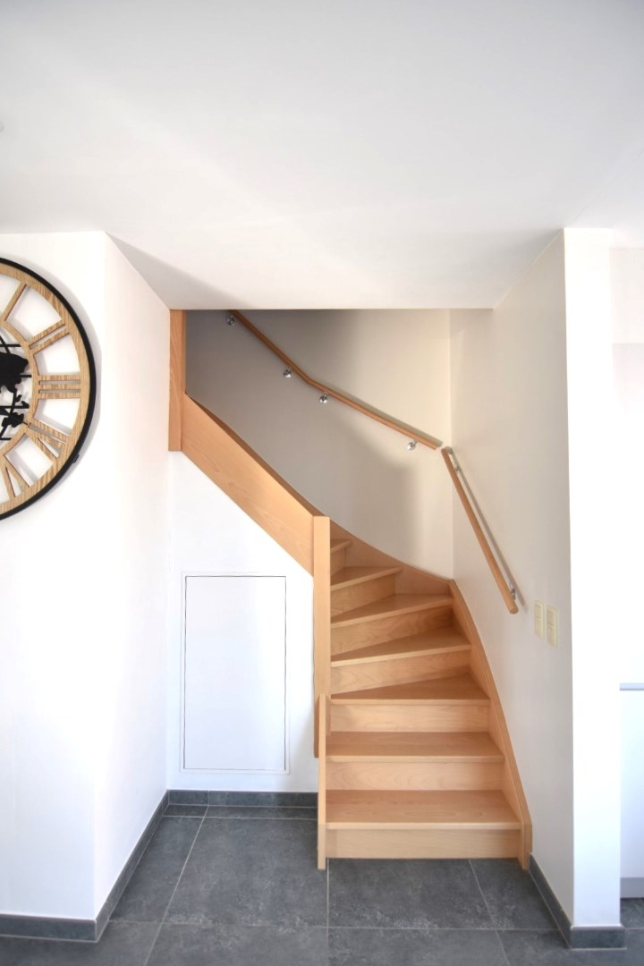 De trap bevindt zich naast de leefkeuken en brengt je naar de verdieping, bestaande uit een nachthal (met inbouwkasten), twee ruime slaapkamers en een tweede badkamer (toilet - ligbad - enkele wastafel).