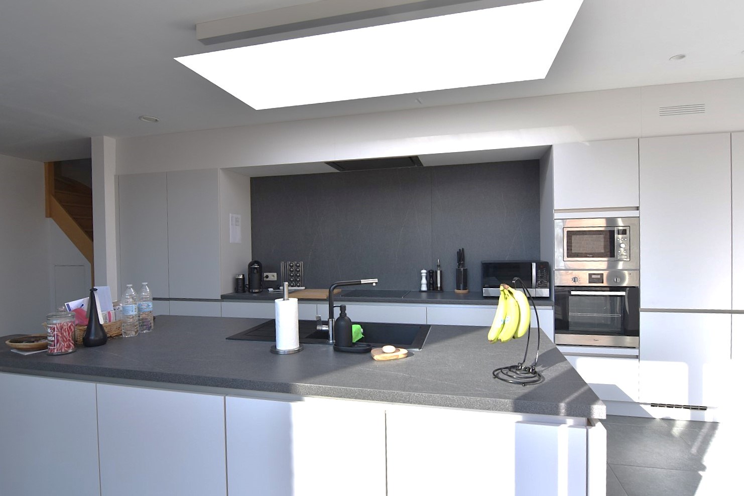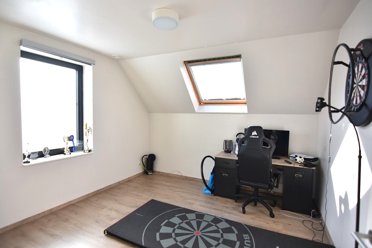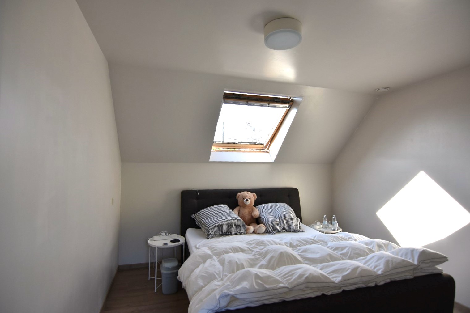 De trap bevindt zich naast de leefkeuken en brengt je naar de verdieping, bestaande uit een nachthal (met inbouwkasten), twee ruime slaapkamers en een tweede badkamer (toilet - ligbad - enkele wastafel).