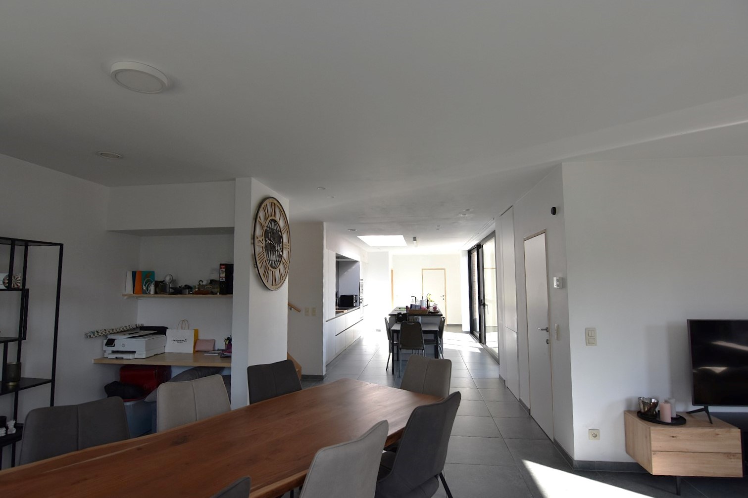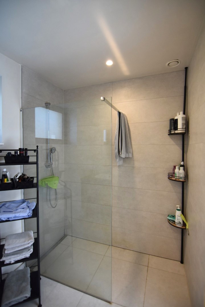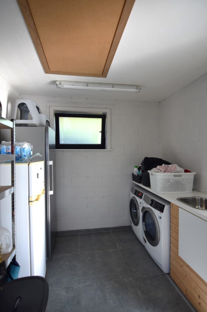 inkomhal met gastentoilet - lichtrijke leefruimte met langs de ene zijde een gezellige zithoek met bureau, centraal is de aangename ingerichte keuken met eettafel en toegang tot een gezellig terras, de andere zijde van het gelijkvloers omvat nog een gelijkvloerse slaapkamer/hobbykamer, een badkamer met 2 wastafels en een inloopdouche, alsook een handige berging/wasplaats.