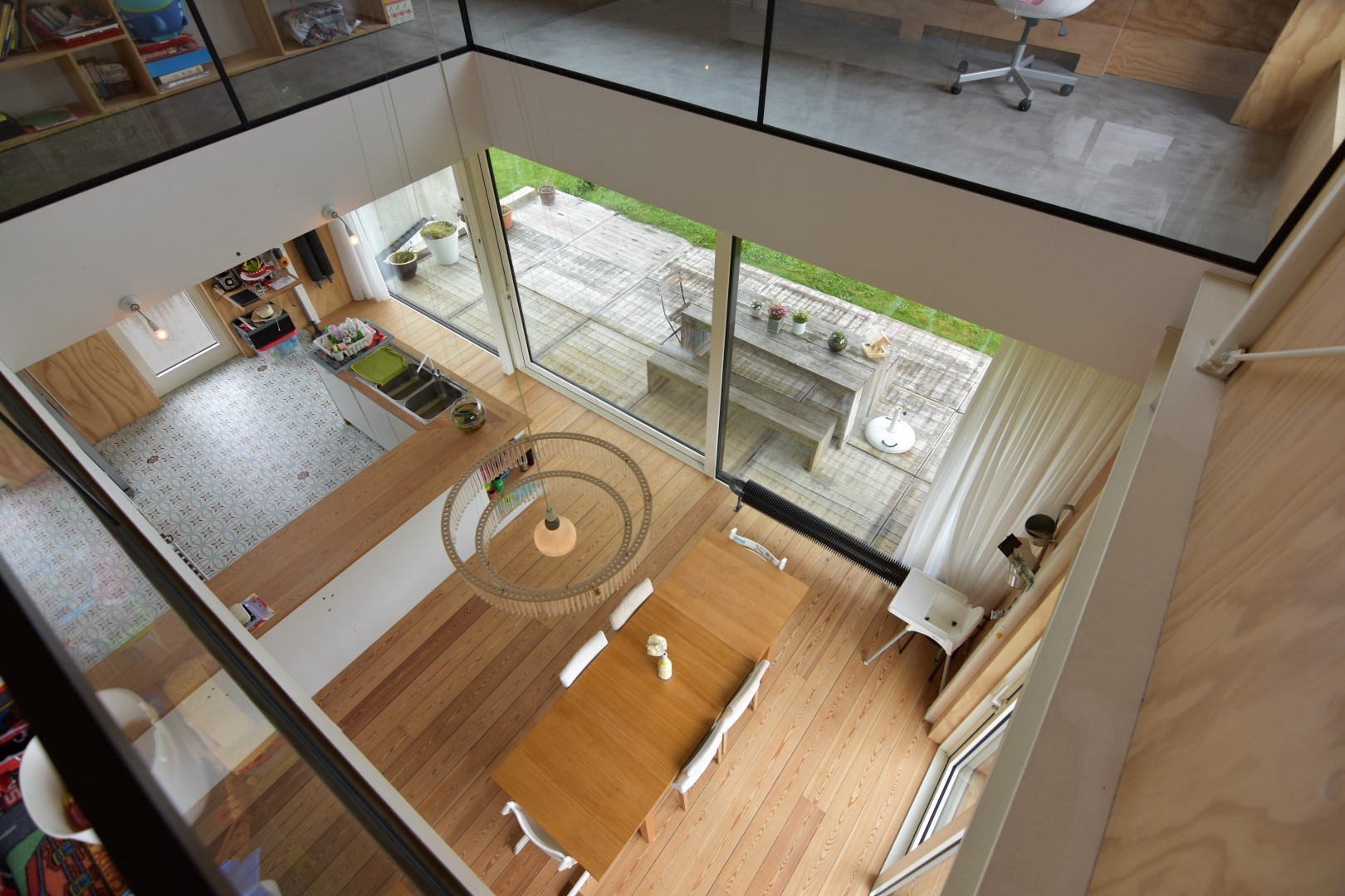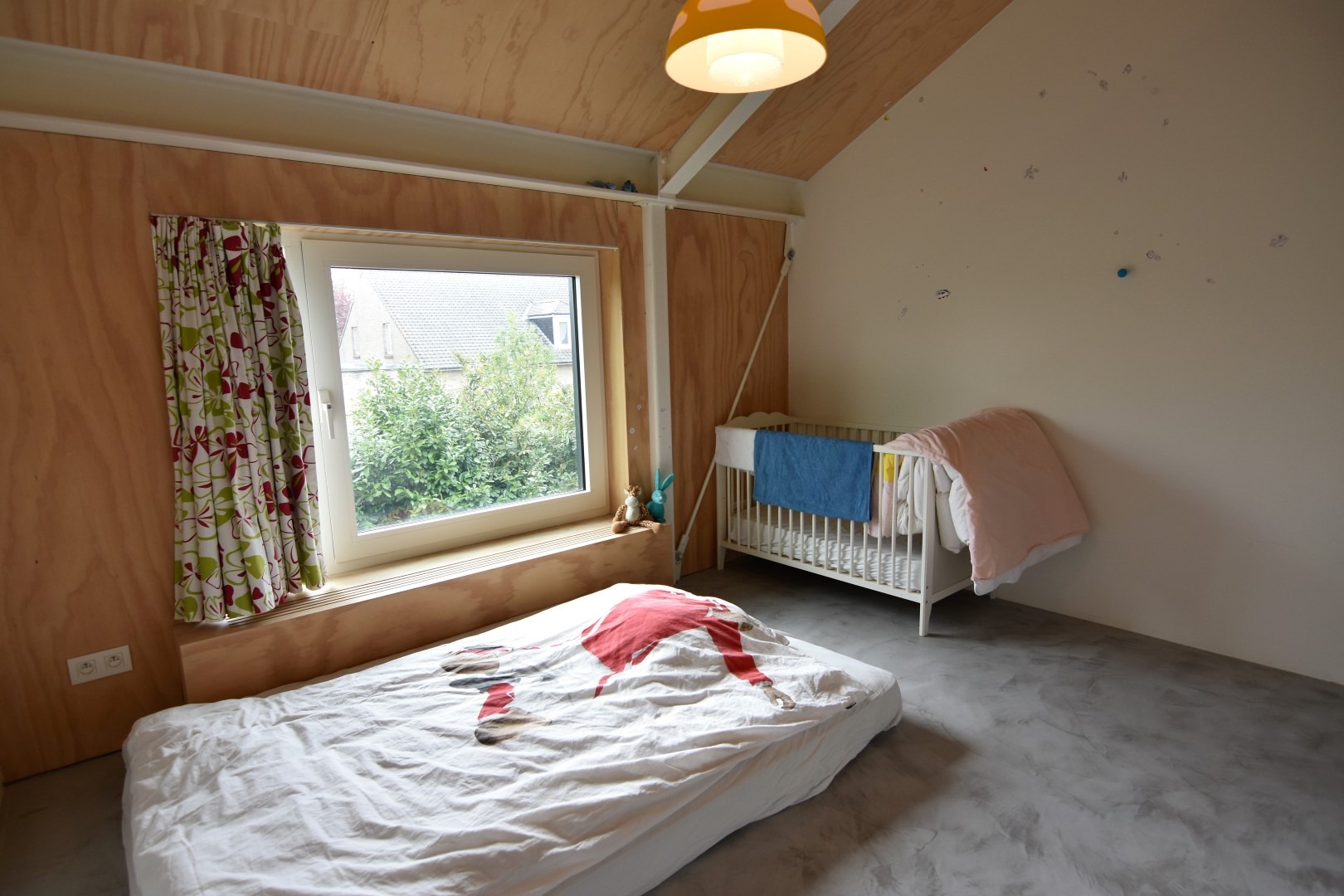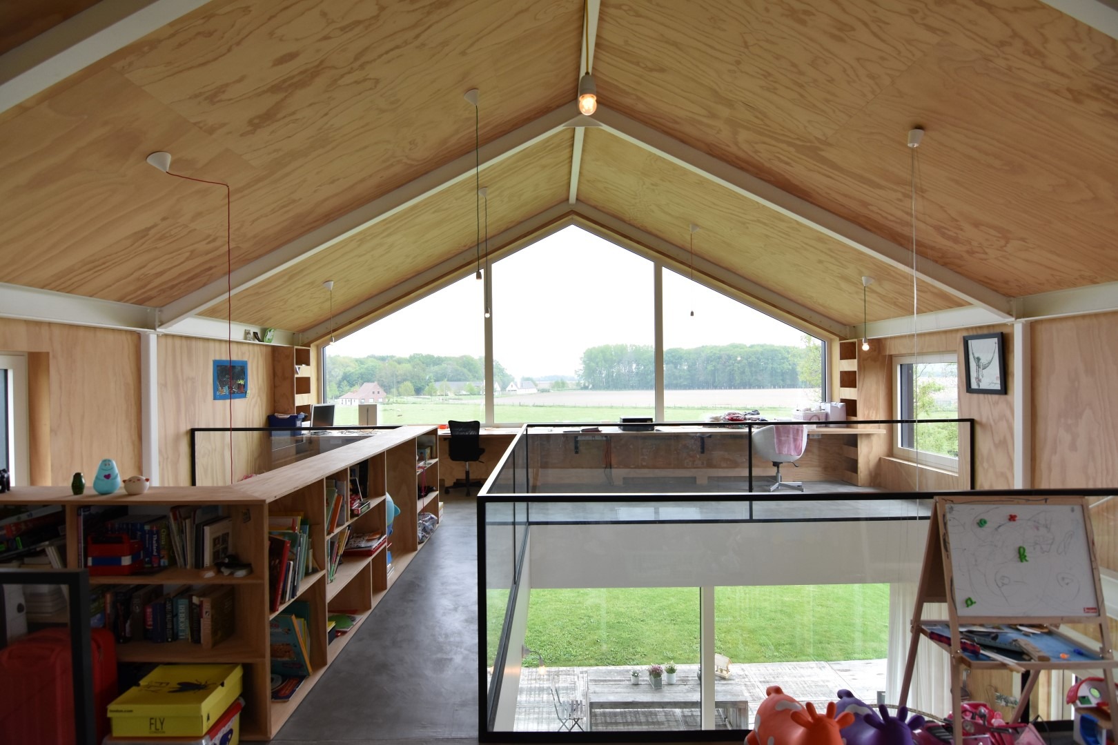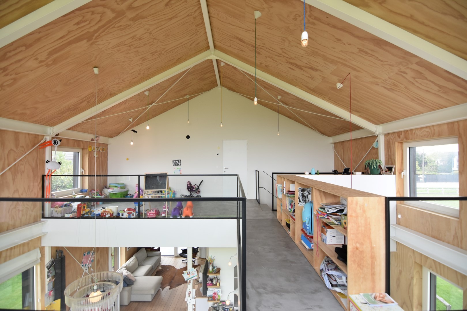 De verdieping bestaat uit een vide met langs de ene kant een vast bureel (adembenemende zichten) en kastruimte, langs de andere zijde een polyvalente ruimte (momenteel ingericht als speelhoek).