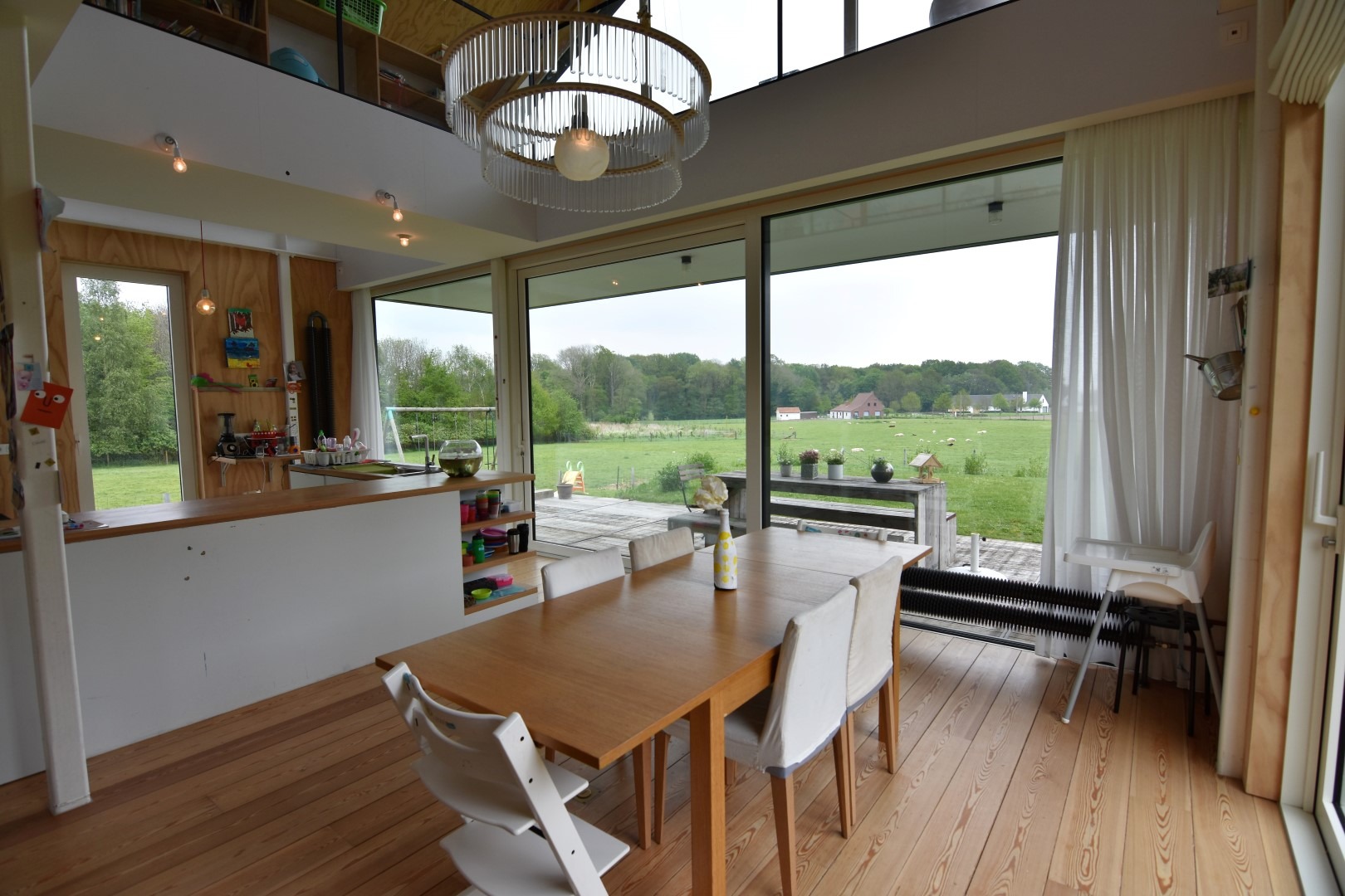 Indeling: inkomhal met vestiaire, gastentoilet, ruime garage, wasplaats, lichtrijke woonkamer met gezellige houtkachel, open ingerichte keuken met prachtig zicht op de omliggende weides.