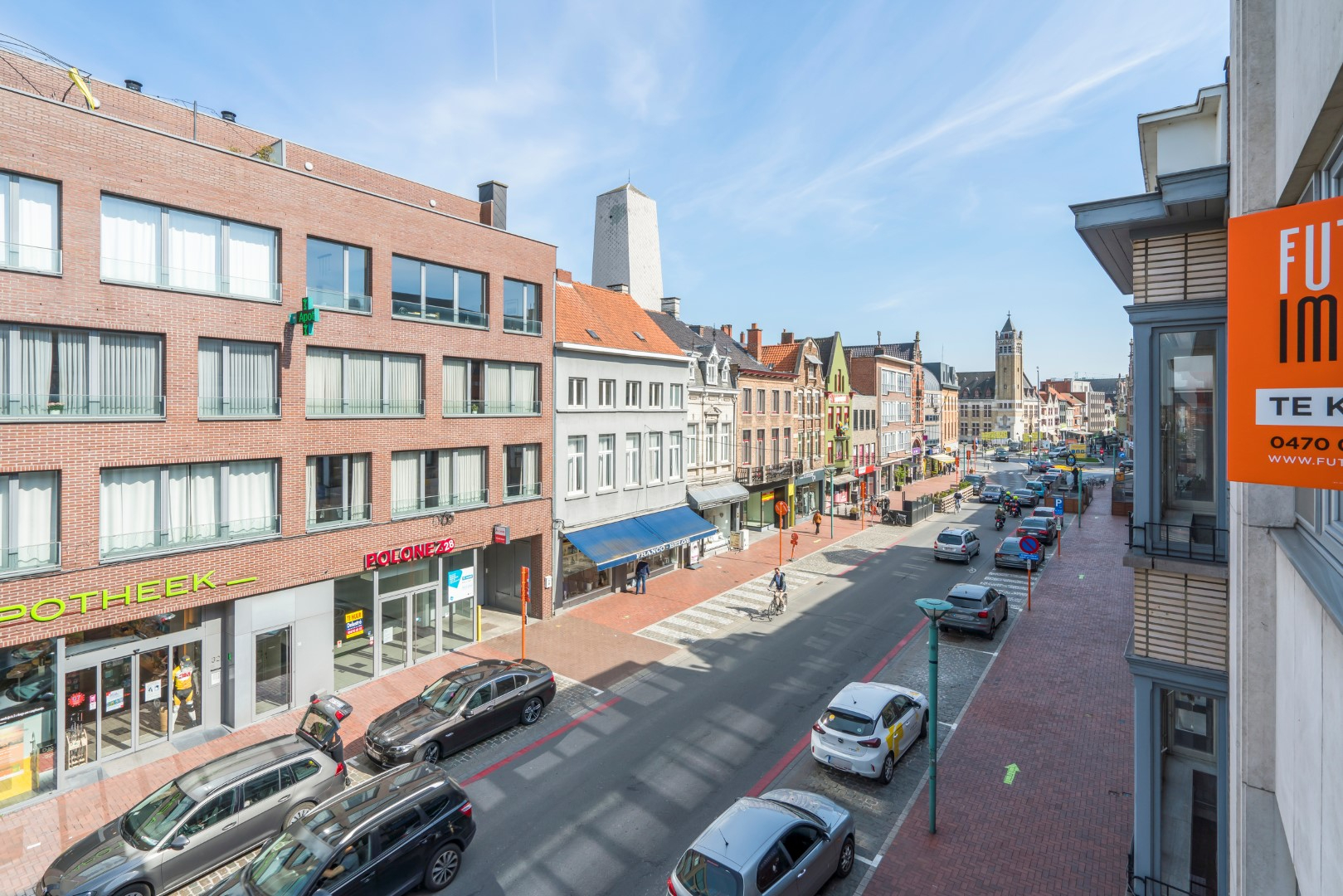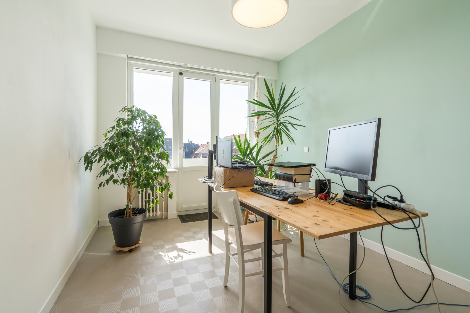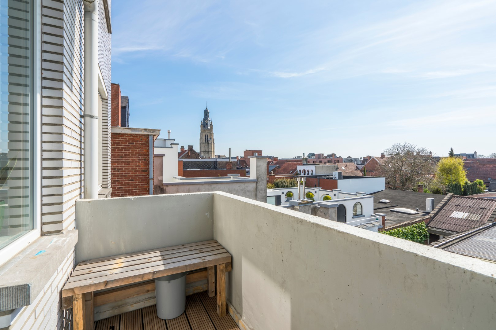 Het zongericht terras is toegankelijk vanuit de tweede slaapkamer en kijkt onder meer op de toren van de Sint-Michielskerk.