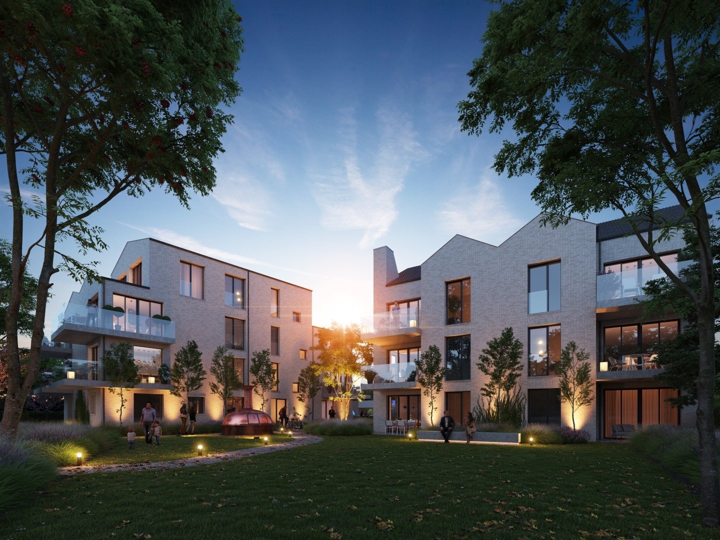 Een mooie binnentuin verbindt de 3 blokken met elkaar en voorziet bewoners en hun bezoekers van een aangename en rustgevende buitenplek. Een historische koperen brouwketel biedt er een knipoog naar het verleden.