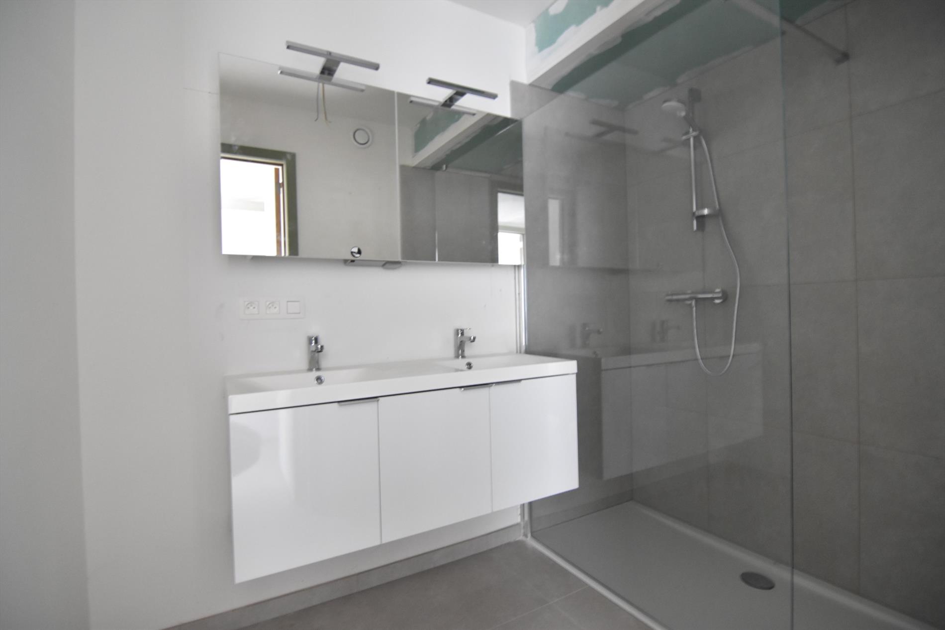 Indeling: inkomhal met vestiaire en gastentoilet, lichtrijke woonkamer met ingerichte leefkeuken, ruime berging met aansluiting voor wasmachine en droogkast, nachthal, twee ruime slaapkamers, badkamer met ligbad en/of douche en dubbele wastafel. Genieten van de zon kan op het terras voor- en/of achteraan. Op het gelijkvloers - achteraan het gebouw - hebben we afgesloten garageboxen of staanplaatsen.