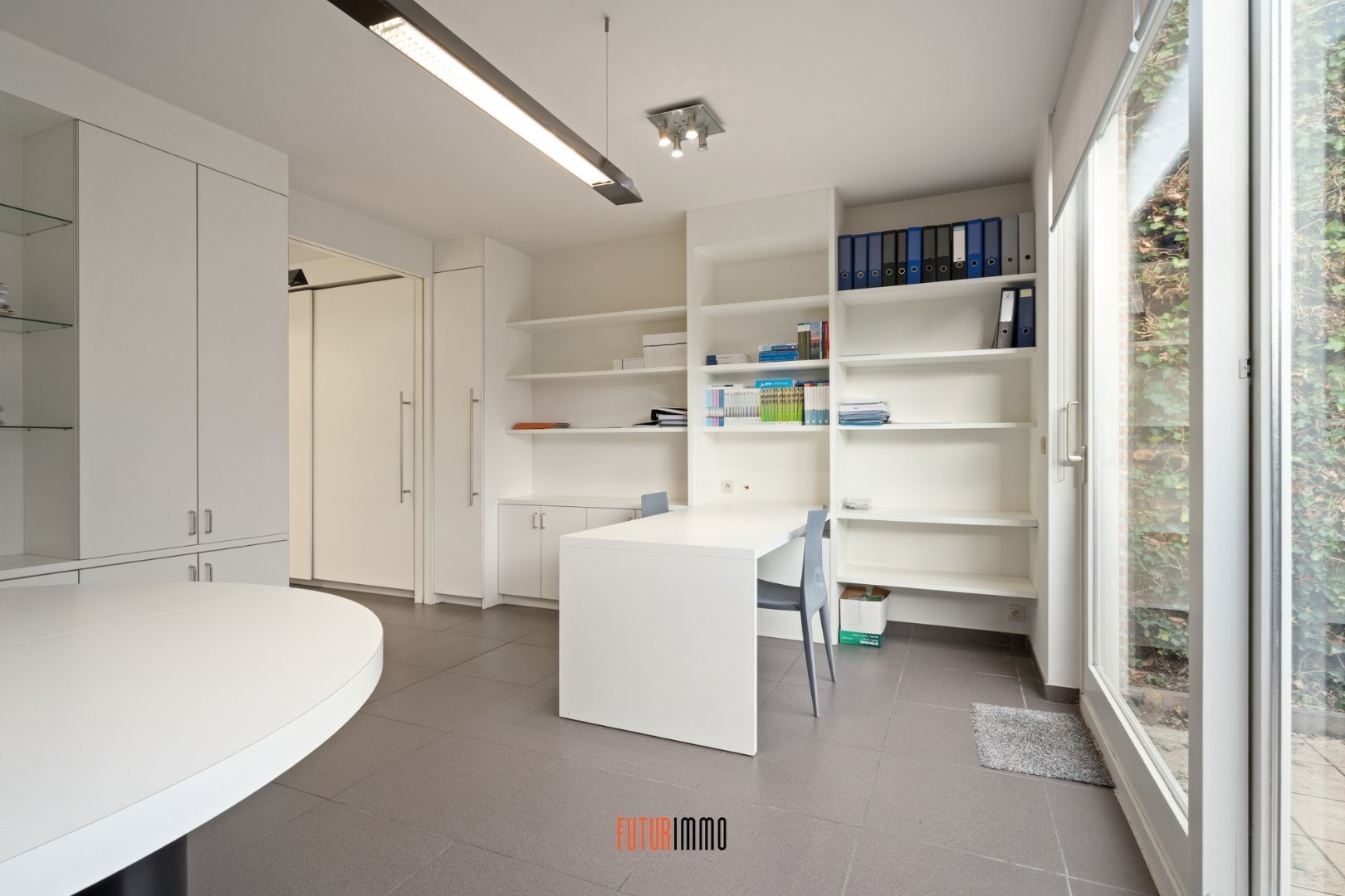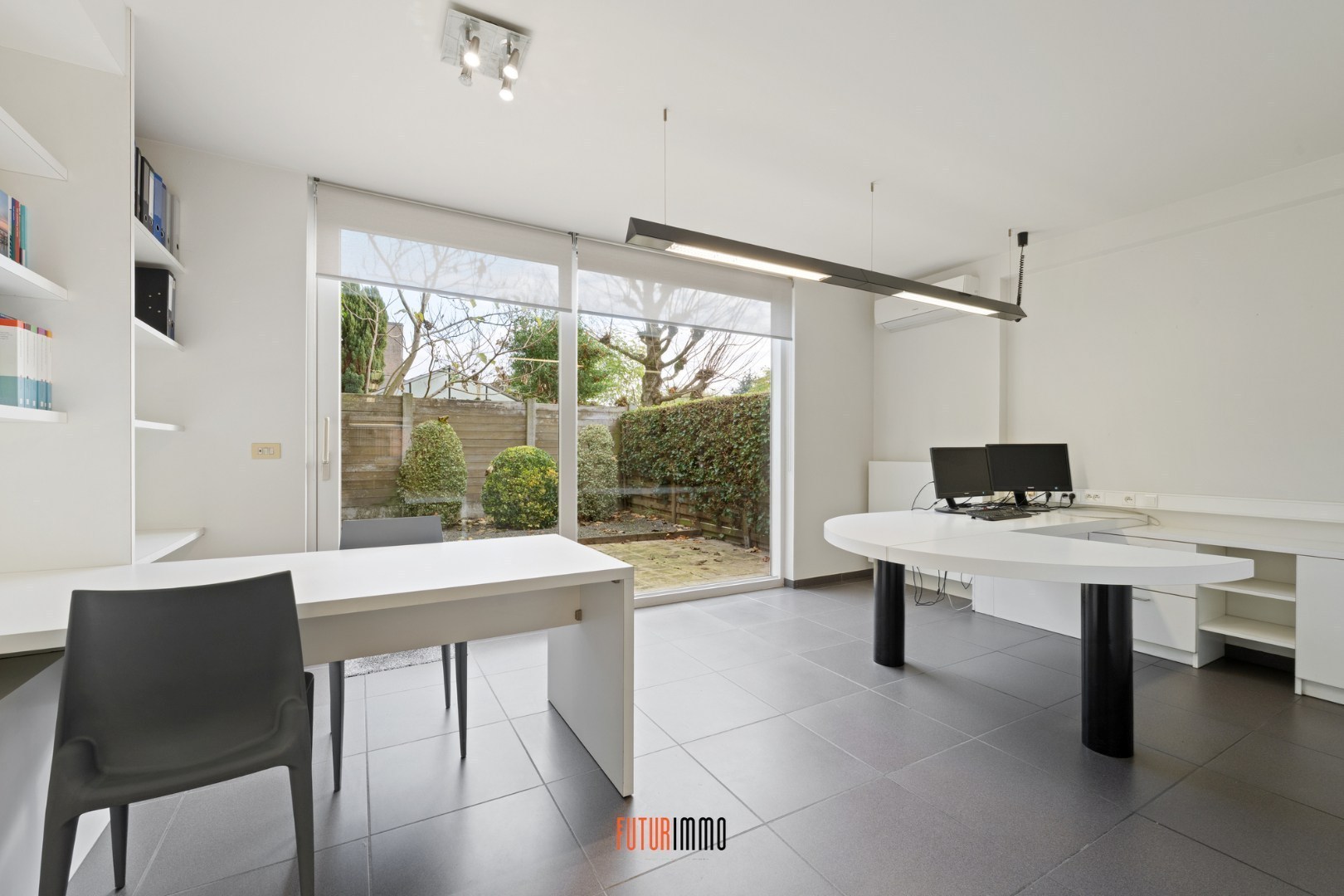inkomhal met toegang tot kantoorgedeelte alsook trap naar verdieping ... 1 - open kantoorruimte met burelen en heel wat kastruimte - technische berging - toilet - hoofdbureel met zicht en toegang tot het terras en kleine tuinzone.