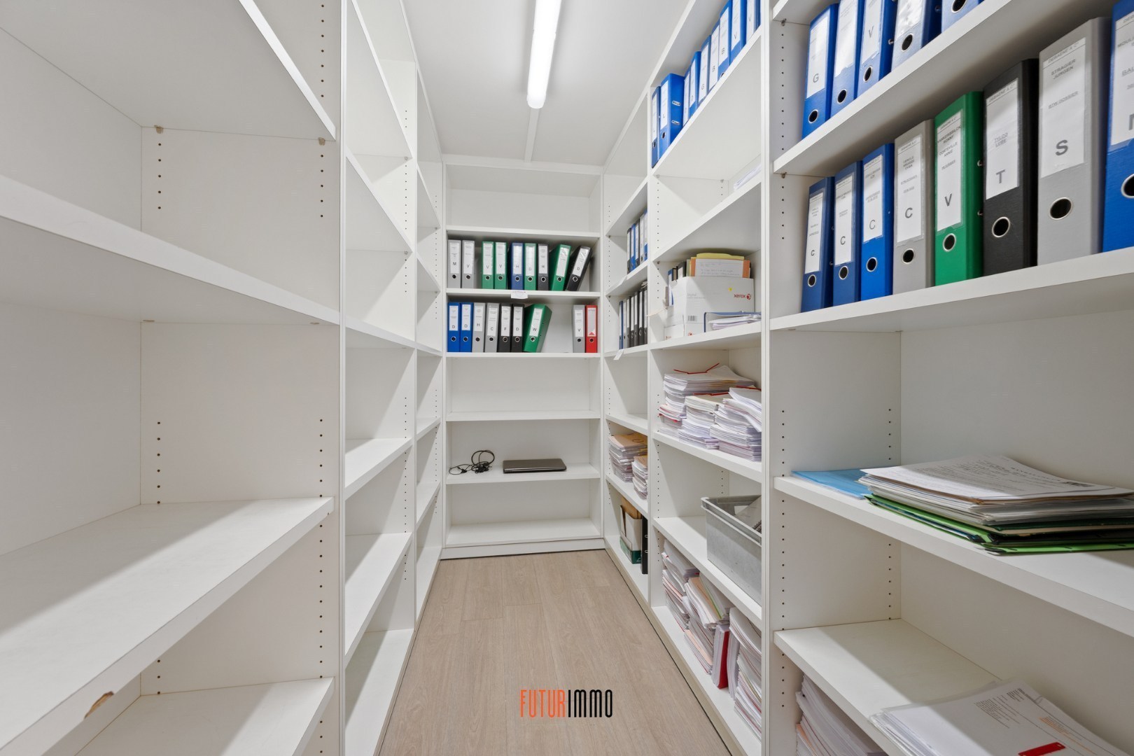 sas met toiletruimte - polyvalente gedeelte met moderne kitchenette - berging - 2 aparte archiefruimtes - vergaderzaal met vaste trap.