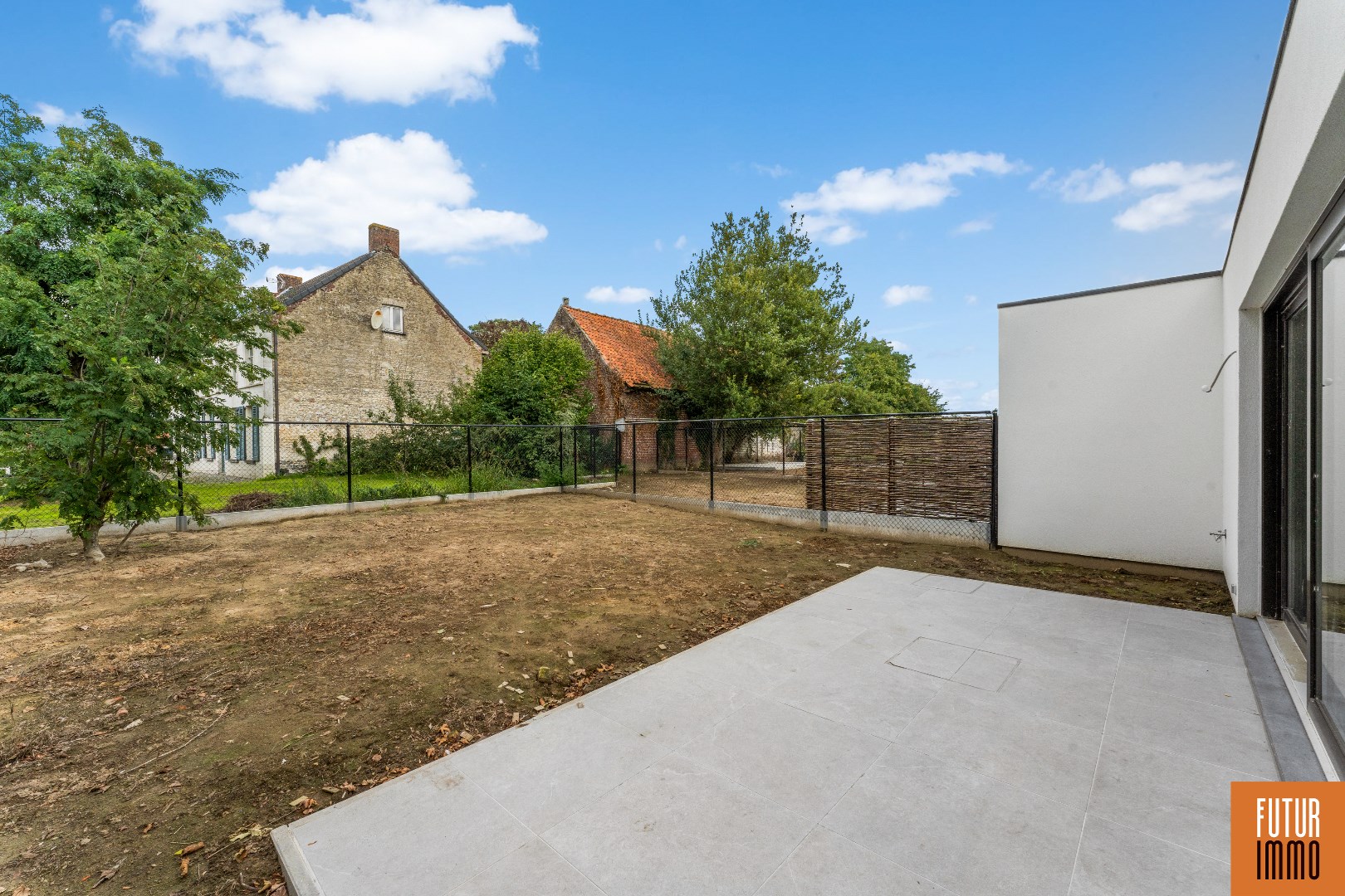 De tuin is aangelegd met een groot terras en voorzien van een omheining, regenput is ook aanwezig.