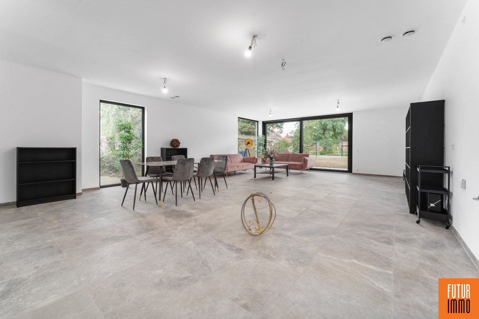 De lichtrijke inkomhal geeft toegang tot de trap, het gastentoilet, een technische ruimte, een polyvalente ruimte dat kan dienst doen als slaapkamer/werk- hobbyruimte/..., de eet- en leefruimte met zicht op de tuin via grote raampartijen. De ruime leefruimte biedt plaats voor een grote eetplaats met aansluitend de open keuken en zithoek. Nabij de keuken beschikt men nog over een extra berging.